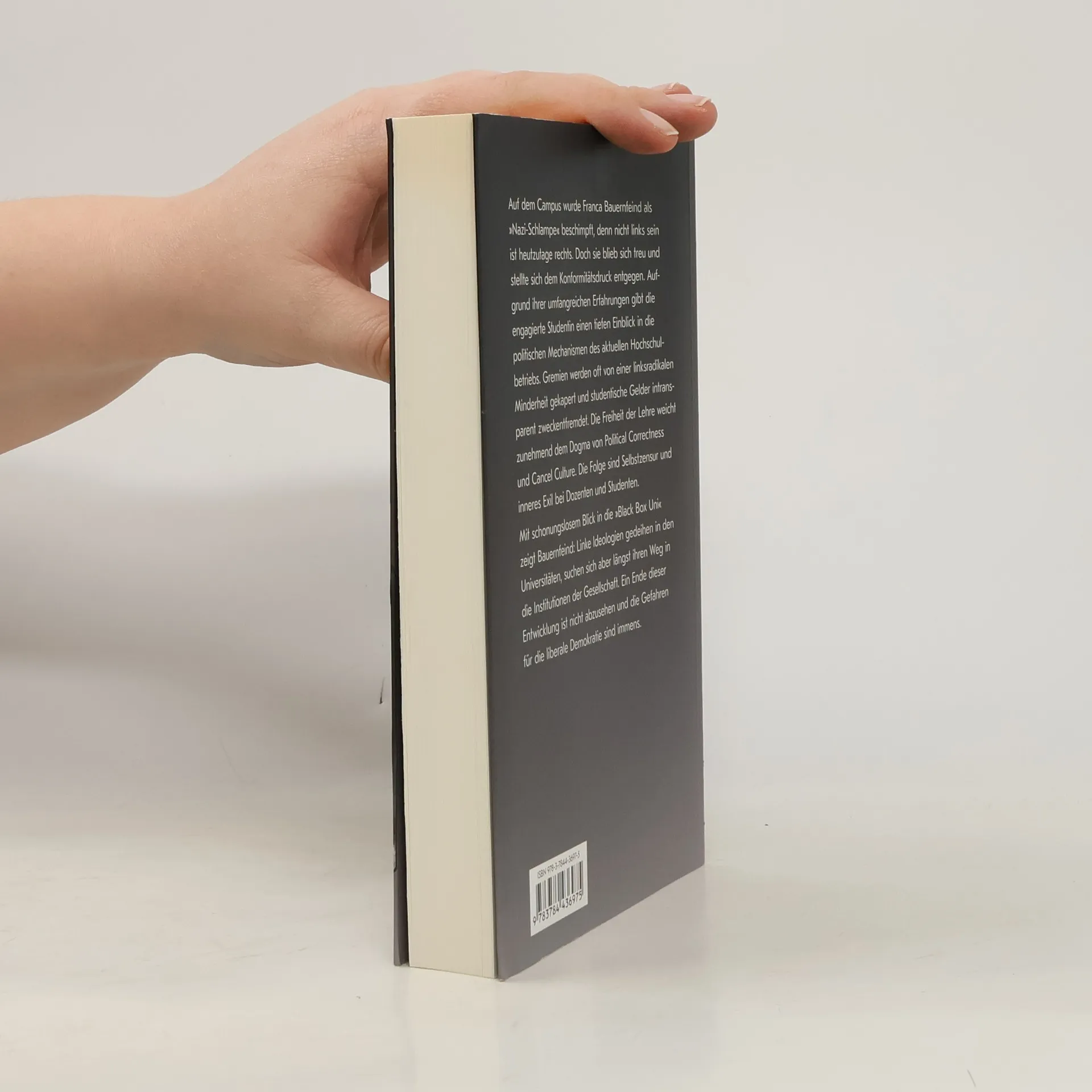 Auf dem Campus wurde Franca Bauernfeind als „Nazi-Schlampe“ beschimpft und ihre Wahlplakate wurden beschmiert. Aber trotz oder gerade aufgrund ihrer liberal-konservativen Positionen gewann sie die Wahl zum Studierendenrat der Universität Erfurt. Anhand von ihren Erfahrungen gibt sie einen tiefen Einblick in die (gesellschafts-)politischen Mechanismen des Hochschulbetriebs: Wer sich an der Universität nicht im linken und oftmals linksextremen Meinungskorridor bewegt, wird diffamiert und ausgegrenzt. Während früher linke und linksextreme Ideen tendenziell nicht den Campus verließen, prägen sie heute zunehmend die Gesellschaft, denn aus den Studenten von heute werden die Lehrer, Politiker, Journalisten und Vorgesetzte von morgen.