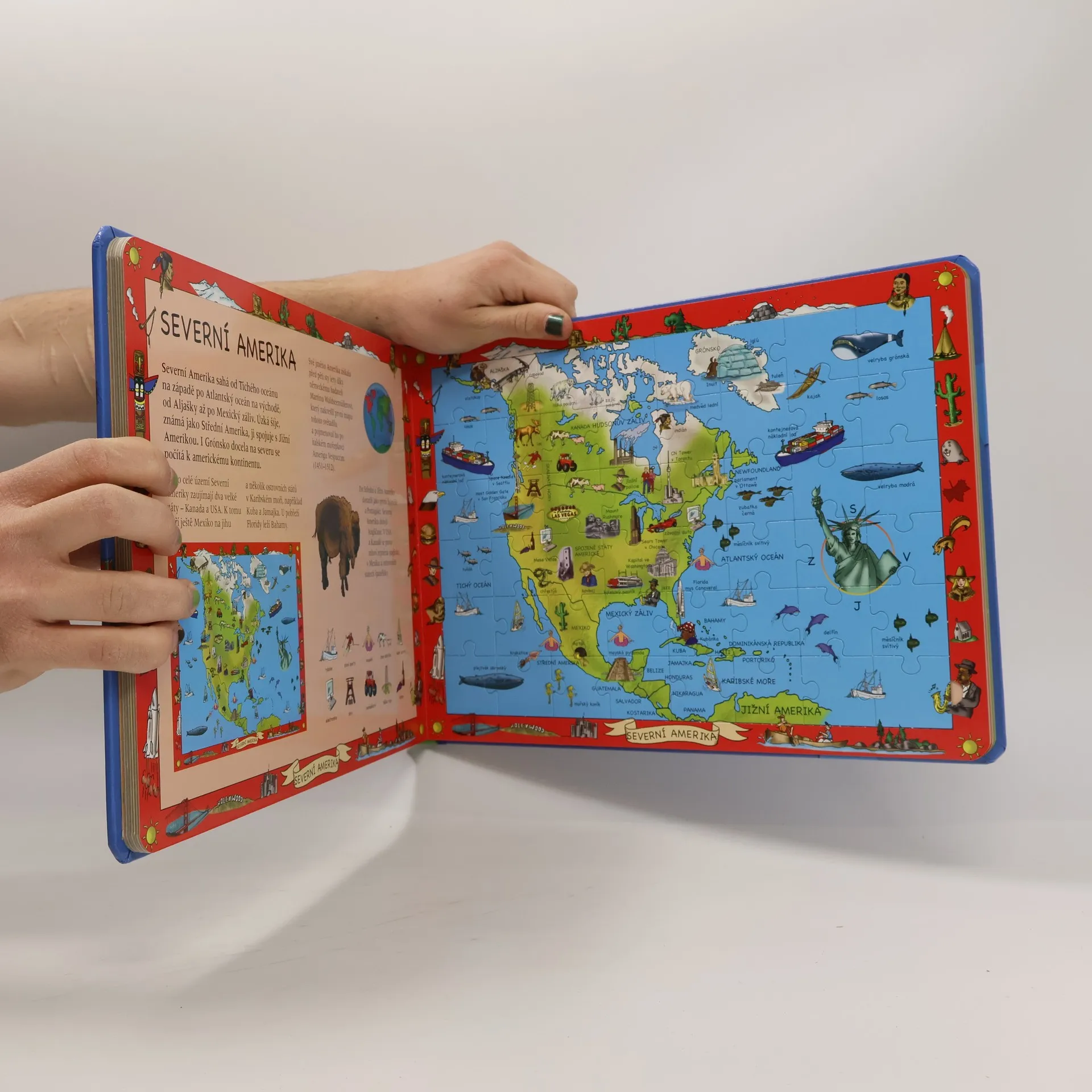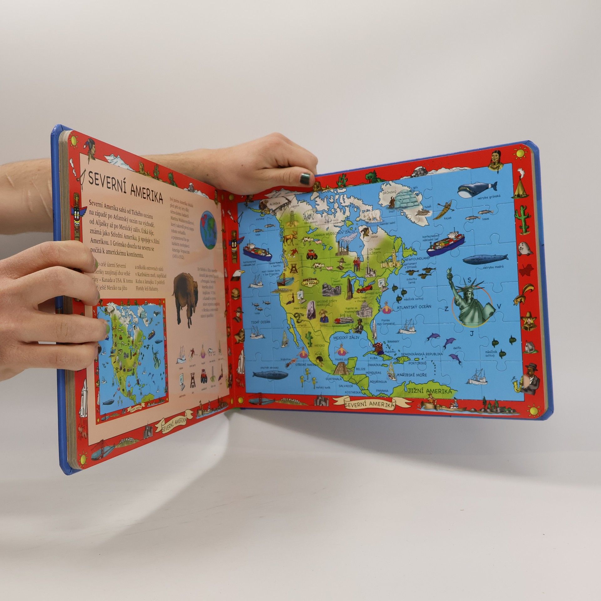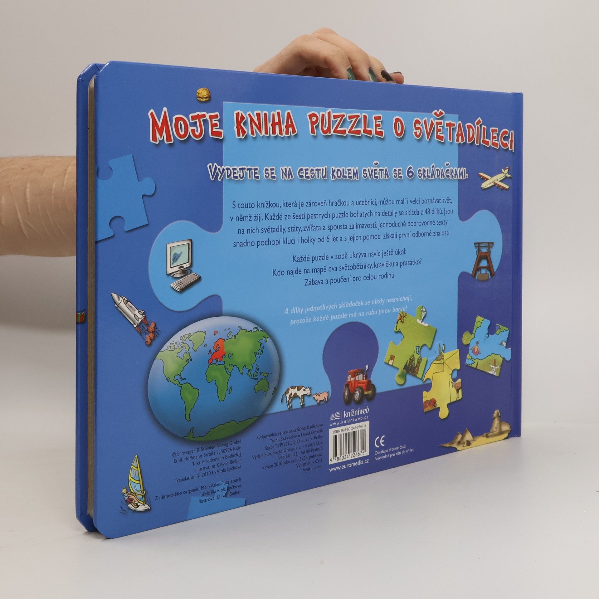 Vydejte se na cestu kolem světa se 6 skládačkami. S touto knížkou, která je zároveň hračkou a učebnicí, můžou malí i velcí poznávat svět, v němž žijí. Každé ze šesti pestrých puzzle bohatých na detaily se skládá z 48 dílků. Jsou na nich světadíly, státy, zvířata a spousta zajímavostí. Jednoduché doprovodné texty snadno pochopí kluci i holky od 6 let a s jejich pomocí získají první odborné znalosti. A dílky jednotlivých skládaček se nikdy nesmíchají, protože každé puzzle má na rubu jinou barvu!