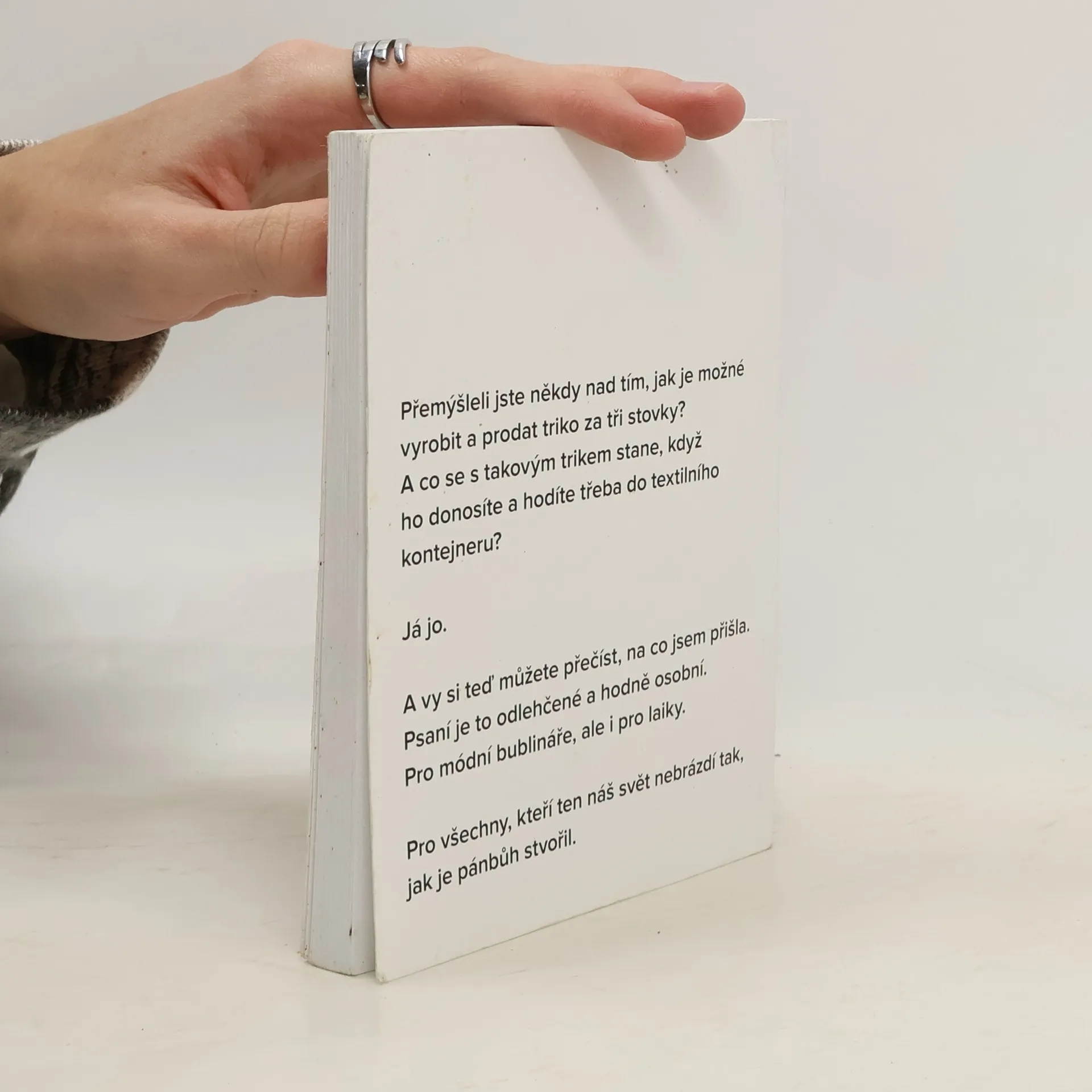 O tom, jak funguje módní průmysl. Přemýšleli jste někdy o tom, jak je možné vyrobit a prodat triko za tři stovky? A co se s takovým trikem stane, když ho donosíte a hodíte třeba do textilního kontejneru? Já jo. A vy si teď můžete přečíst, na co jsem přišla. Psaní je to odlehčené a hodně osobní. Pro módní bublináře, ale i pro laiky. Pro všechny, které ten náš svět nebrázdí tak, jak je pánbůh stvořil.