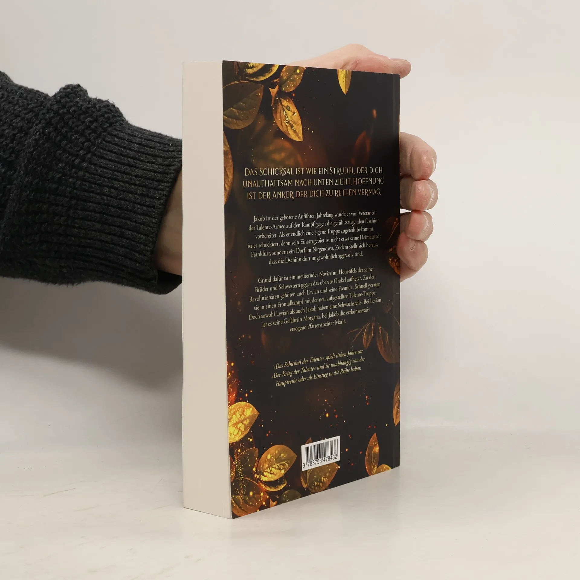 Das Schicksal ist wie ein Strudel, der dich unaufhaltsam nach unten zieht. Hoffnung ist der Anker, der dich zu retten vermag. Jakob ist der geborene Anführer. Jahrelang wurde er von Veteranen der Talente-Armee auf den Kampf gegen die gefühlssaugenden Dschinn vorbereitet. Als er endlich eine eigene Truppe zugeteilt bekommt, ist er schockiert, denn sein Einsatzgebiet ist nicht etwa seine Heimatstadt Frankfurt, sondern ein Dorf im Nirgendwo. Zudem stellt sich heraus, dass die Dschinn dort ungewöhnlich aggressiv sind. Grund dafür ist ein meuternder Novize im Hohenfels der seine Brüder und Schwestern gegen das oberste Orakel aufhetzt. Zu den Revolutionären gehören auch Levian und seine Freunde. Schnell geraten sie in einen Frontalkampf mit der neu aufgestellten Talente-Truppe. Doch sowohl Levian als auch Jakob haben eine Schwachstelle: Bei Levian ist es seine Gefährtin Morgana, bei Jakob die erzkonservativ erzogene Pfarrerstochter Marie. »Das Schicksal der Talente« spielt sieben Jahre vor »Der Krieg der Talente« und ist unabhängig von der Hauptreihe oder als Einstieg in die Reihe lesbar.