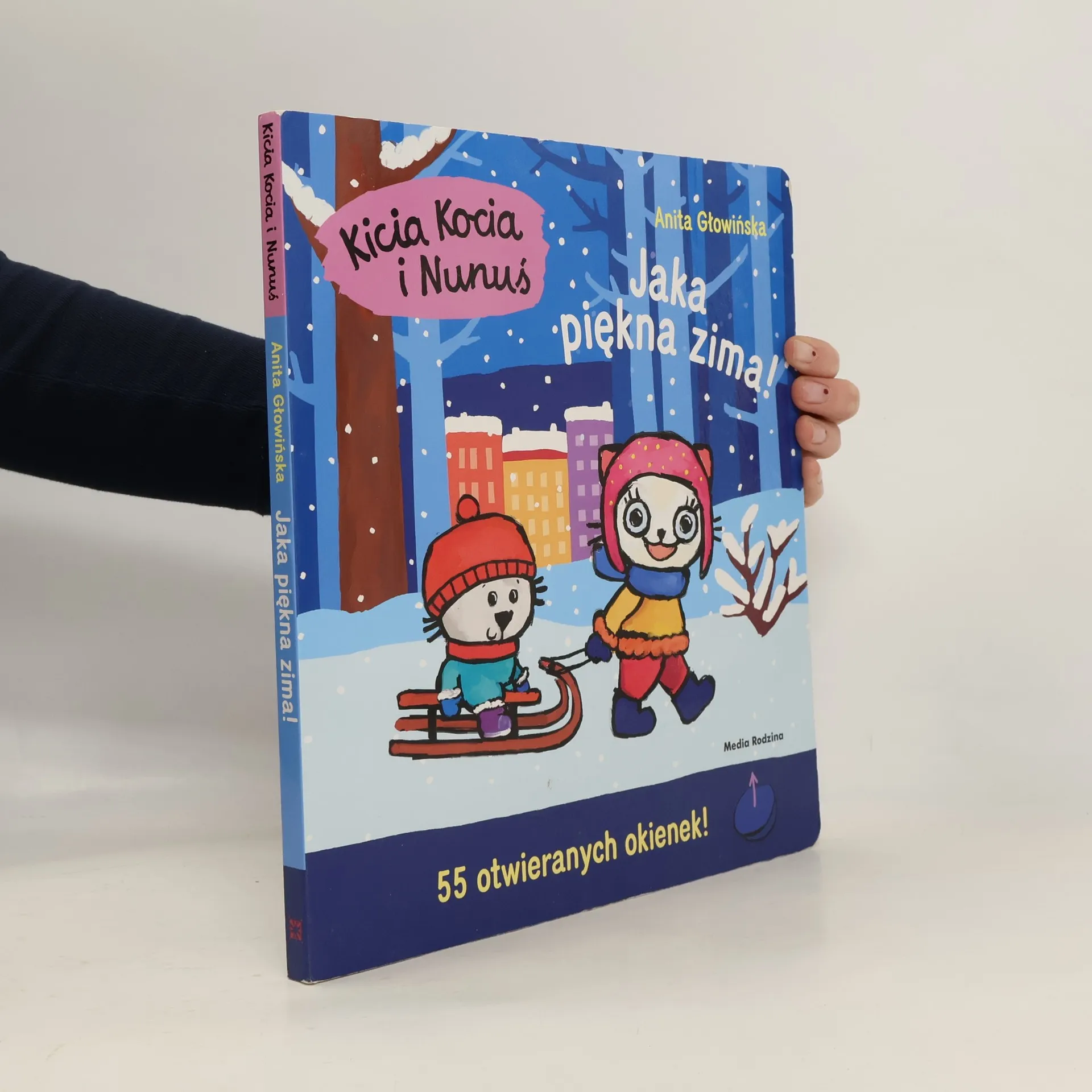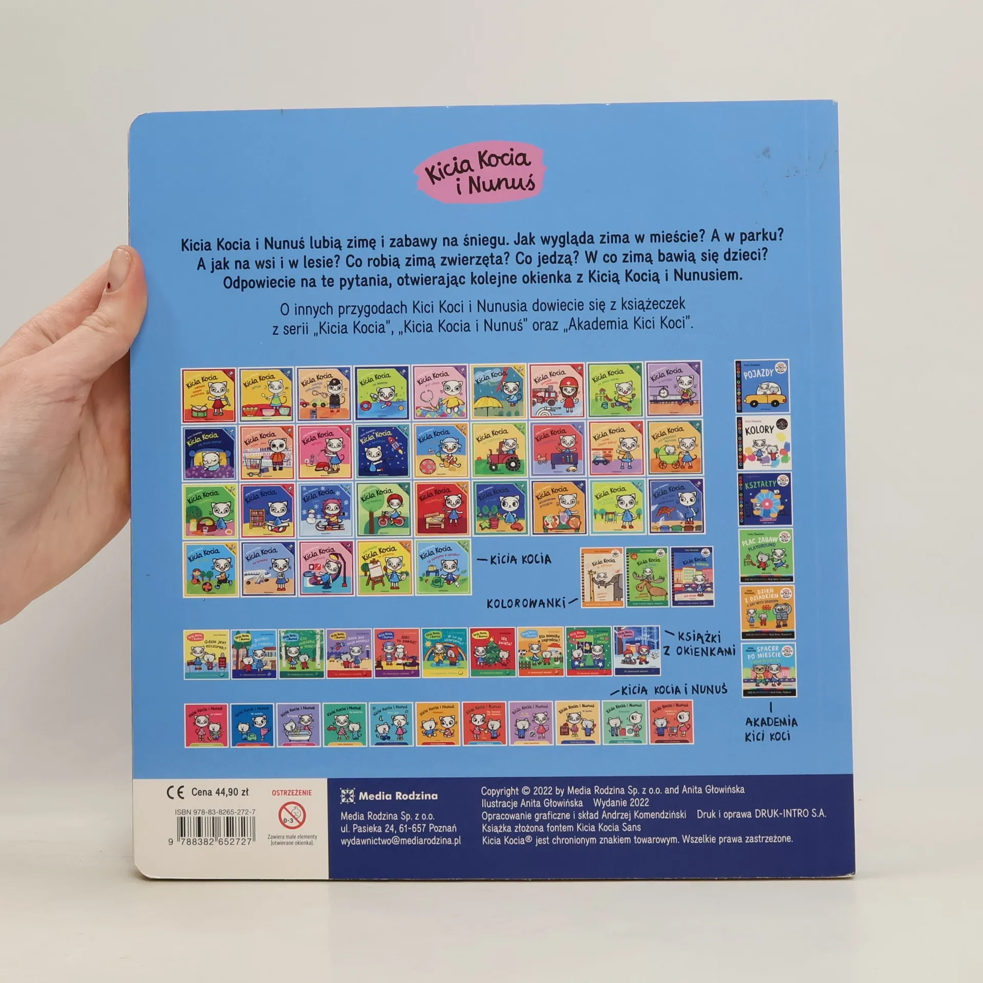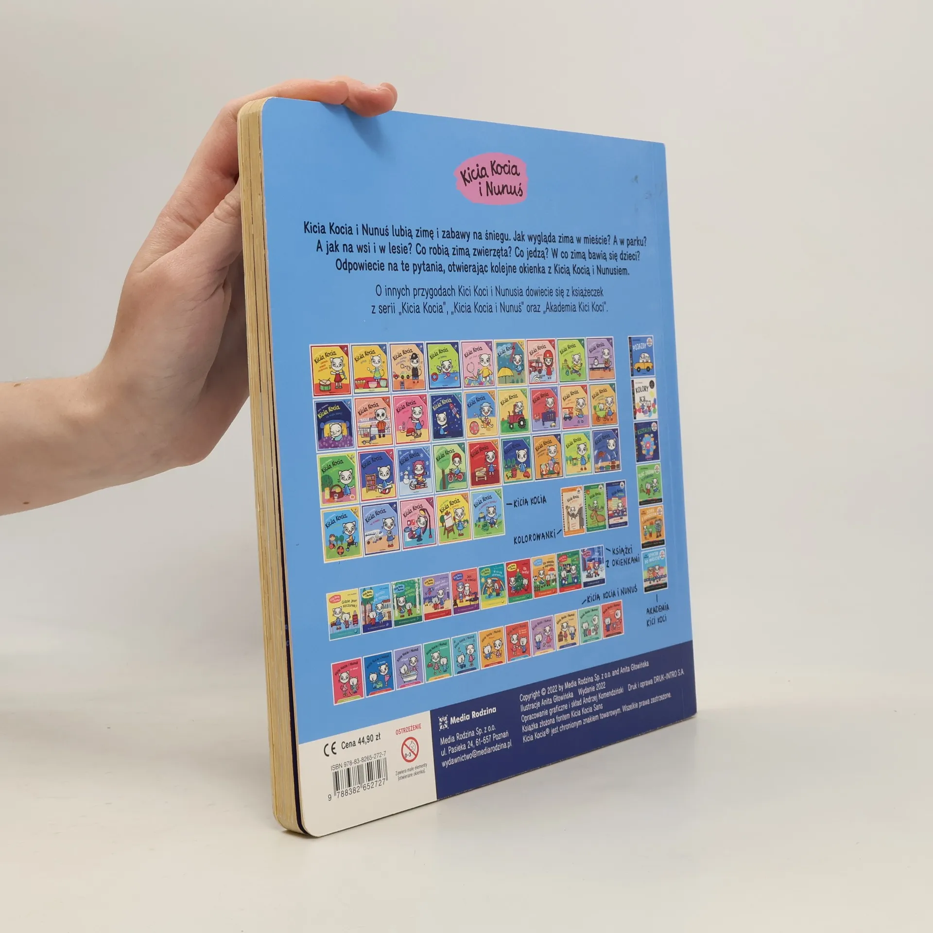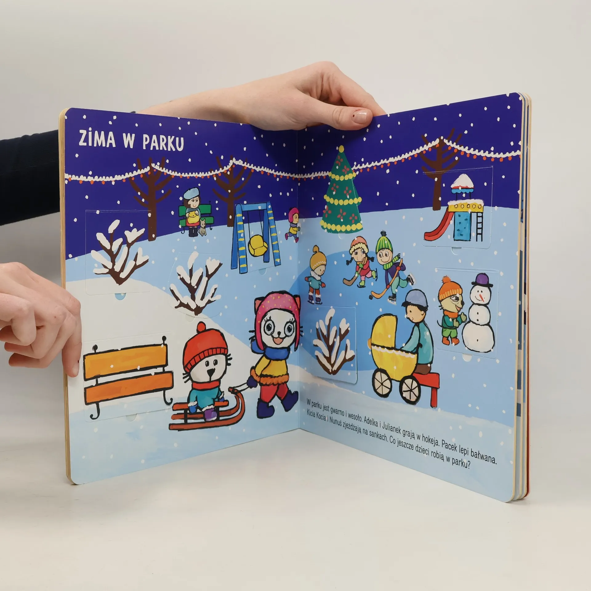 Kicia Kocia i Nunuś lubią zimę i zabawy na śniegu. Razem z nimi mali czytelnicy zobaczą, jak wygląda zima w mieście, w parku, a także na wsi i w lesie. Co robią zimą zwierzęta? Co jedzą? W co zimą bawią się dzieci? Najmłodsi poznają odpowiedzi na te pytania, otwierając kolejne okienka z Kicią Kocią i Nunusiem.