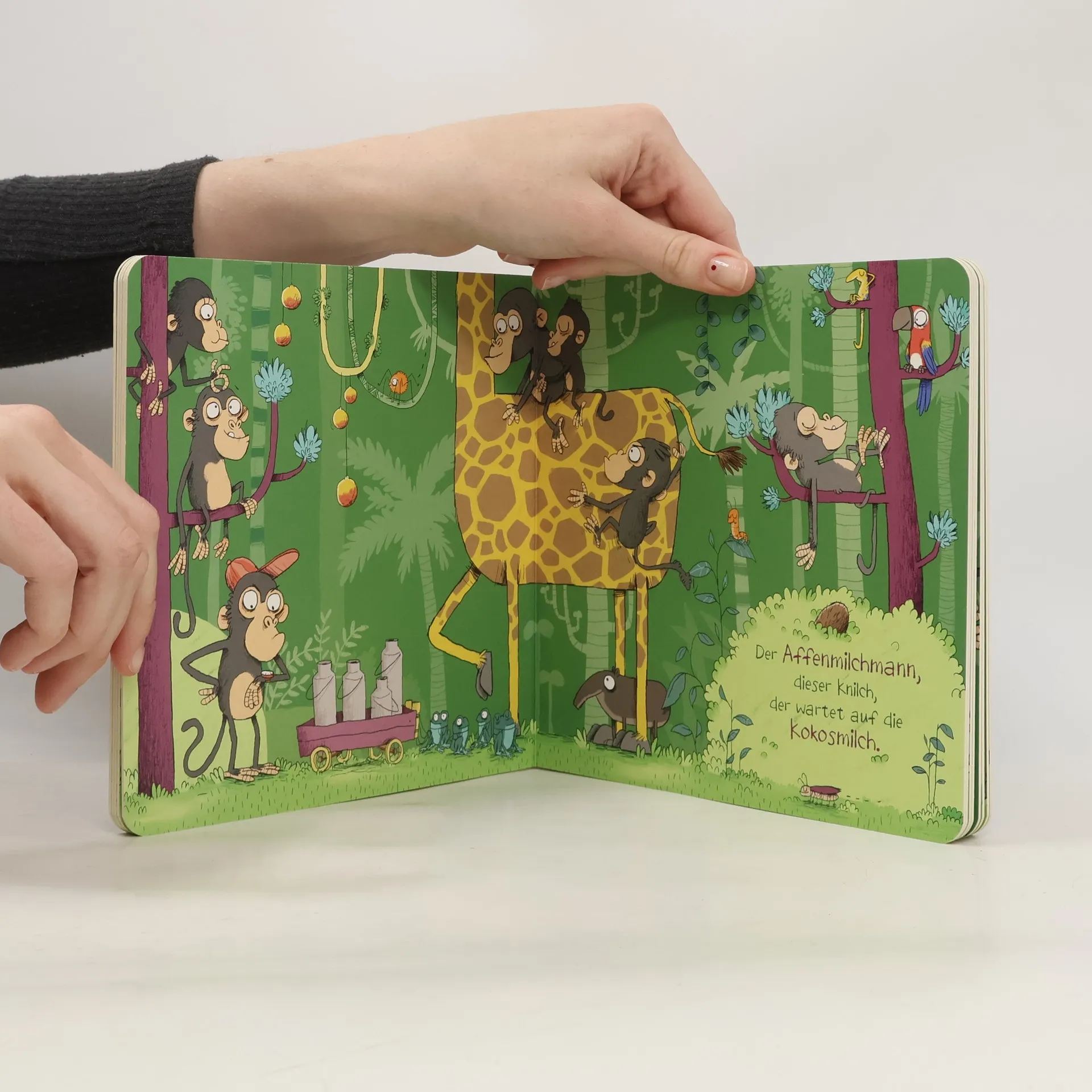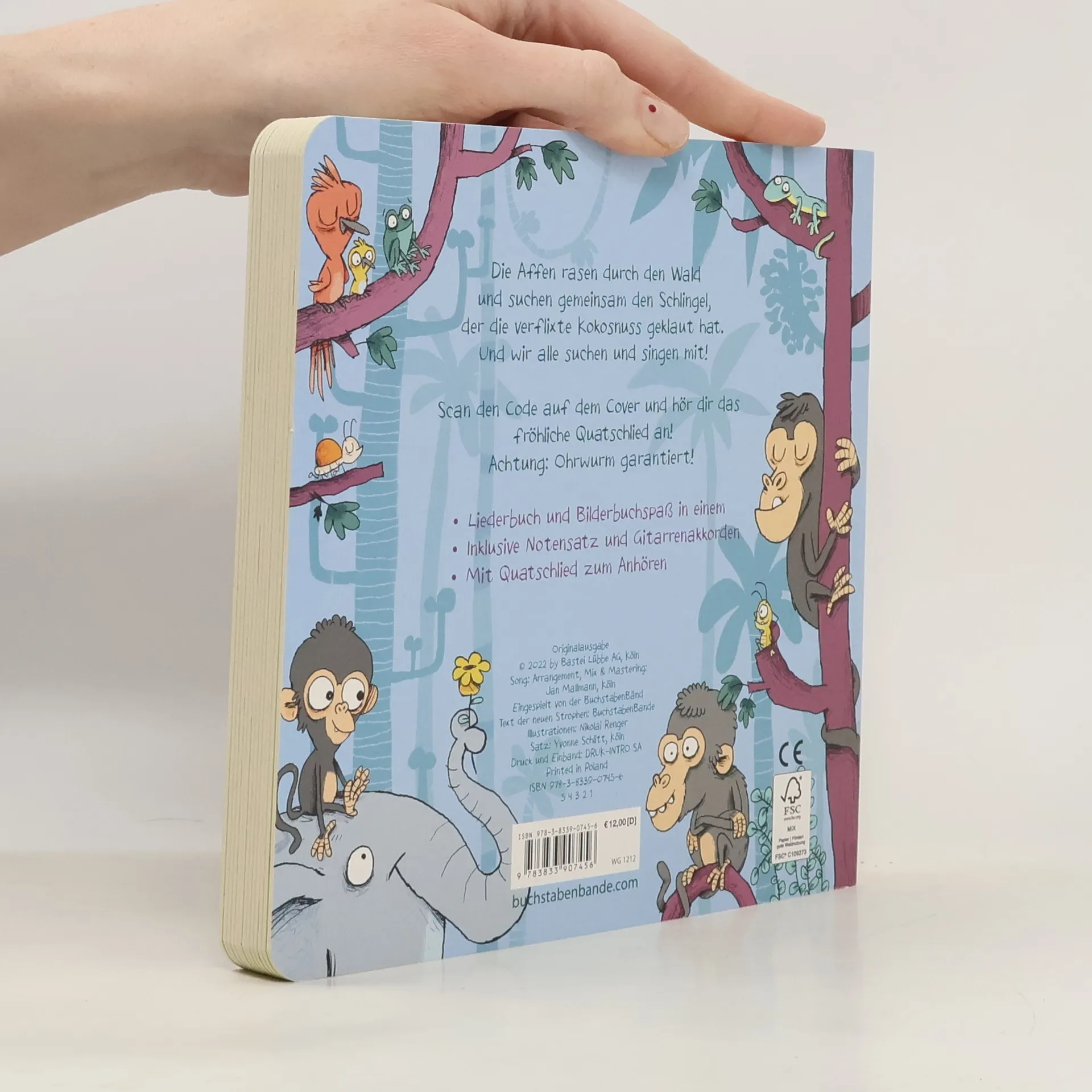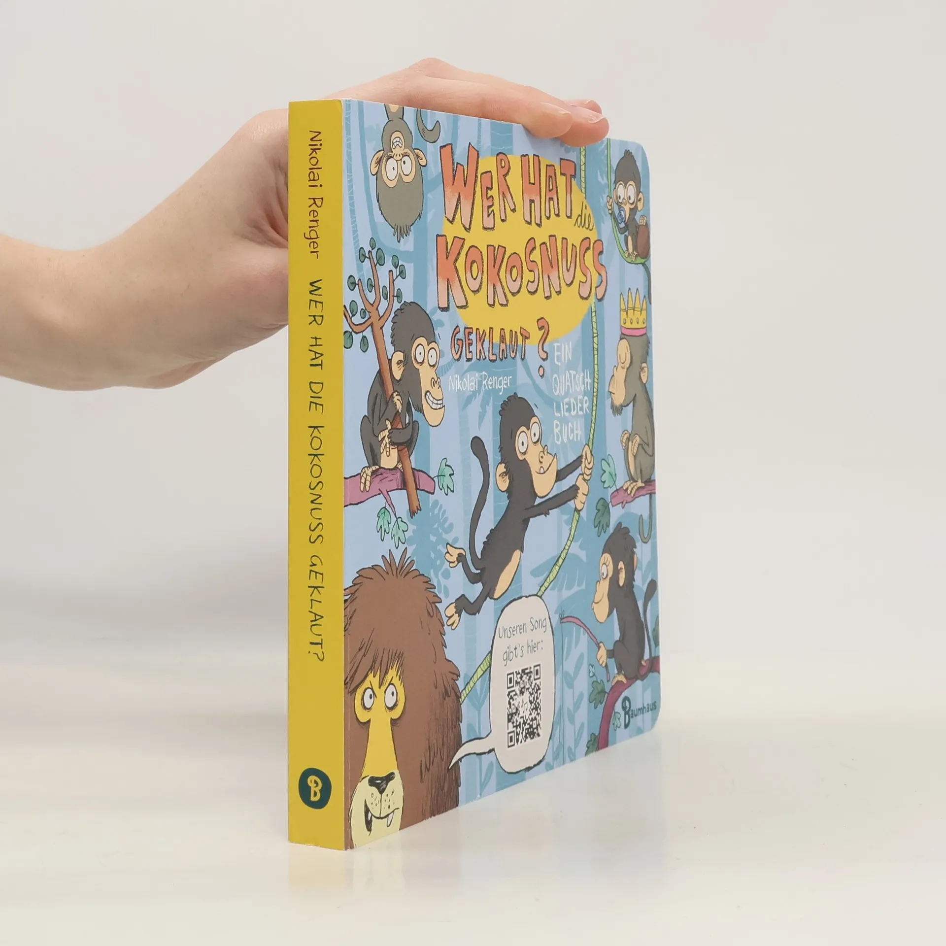 Fröhliches Quatschliederbuch in stabiler Pappe - ein echtes Lieblingsbuch zum Mitsingen, Entdecken, Spaßhaben Wer kennt es nicht - das Quatschlied von den Affen, die durch den Wald toben und verzweifelt die Kokosnuss suchen. Ein Klassiker, der in jeder Familie gesungen, geträllert oder laut mitgebrüllt wird. Nikolai Renger hat diesen zeitlosen Song mit einer Extraportion Witz und verrückten Details zum Entdecken und Staunen in Szene gesetzt. Als stabile Pappe mit Notensatz und Gitarrenbegleitung auf der letzten Seite wird es bestimmt zum Lieblingsbuch für die ganze Familie. Und wer die Melodie vergessen hat, der scannt den QR-Code und hört sich das frisch eingespielte Lied inklusive neuer Strophen einfach noch mal an. Achtung: Ohrwurm garantiert!