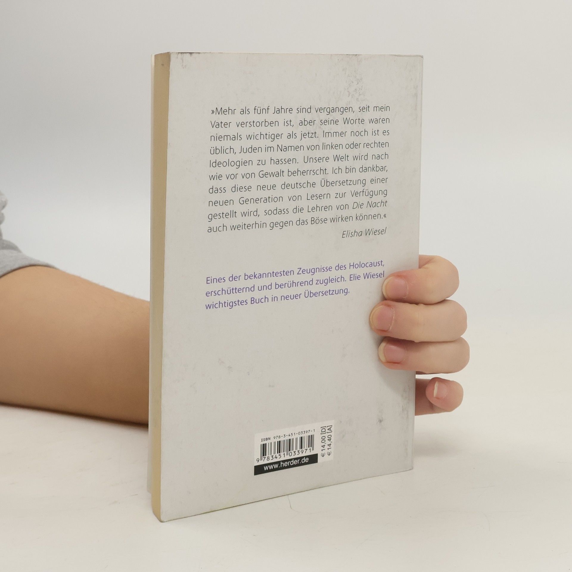 »Die Nacht« machte Elie Wiesel weltberühmt und sie ist heute ein Standardwerk deutscher Geschichte. Ein Zeugnis himmelschreiender Unmenschlichkeit und überwältigender Menschlichkeit, erschütternd und berührend zugleich. Jetzt, nach langen Jahren, liegt endlich die neue Übersetzung bereit, autorisiert von Elisha Wiesel, dem Sohn Wiesels. Die neue Übersetzung drückt noch stärker, noch beeindruckender und berührender aus, was der Friedensnobelpreisträger in Auschwitz erfahren musste. Jeder Satz ist ein Testament und das Werk ein zeitloses menschliches Dokument. »Ein Buch, das wir – nicht nur einmal, sondern immer wieder – lesen müssen, wenn wir die Verantwortung für unsere Vergangenheit akzeptieren wollen« (Robert McAfee Brown).