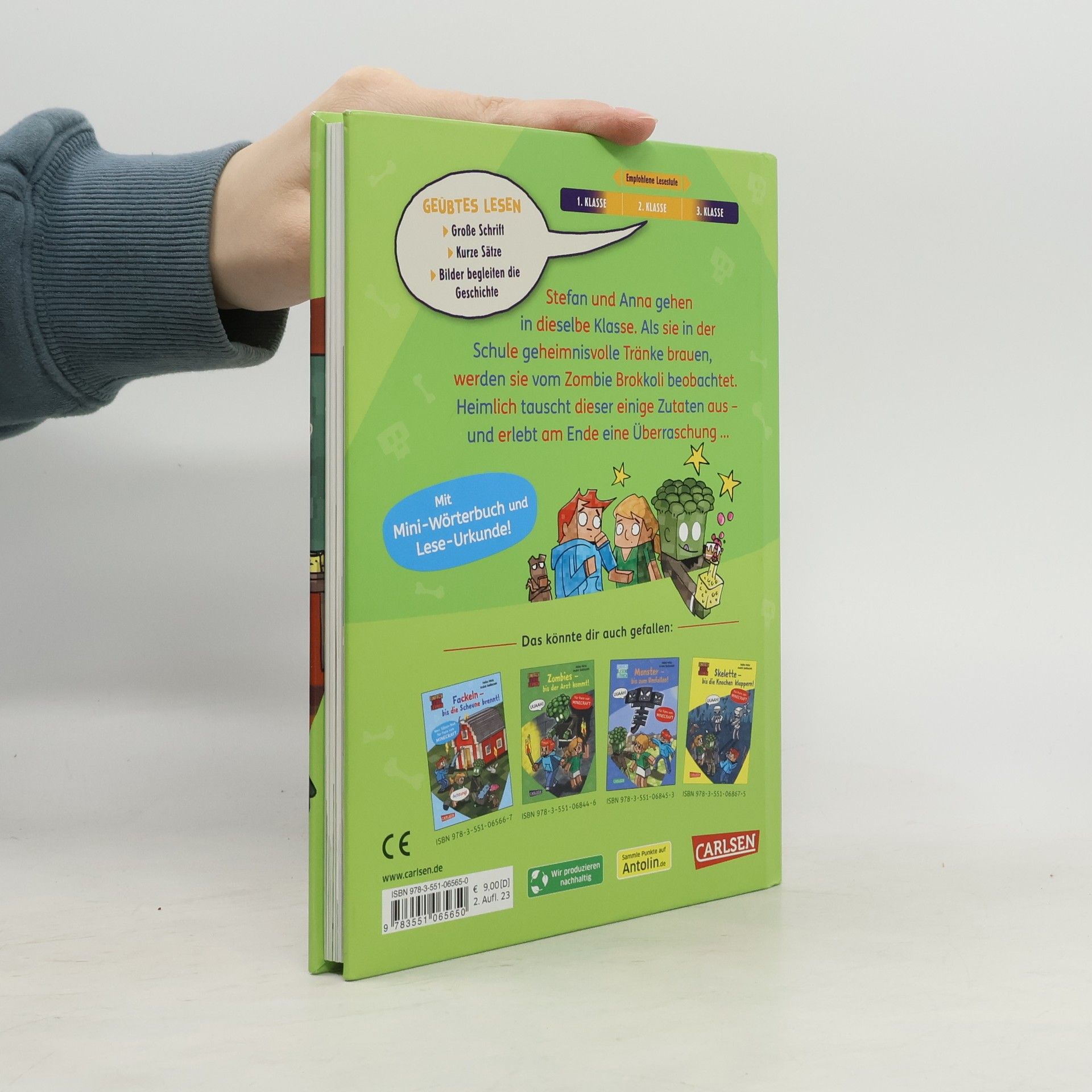 Das ideale Erstlesebuch für Jungen Die Vorgeschichte zur beliebten Reihe rund um Stefan, Anna und den Zombie Brokkoli! Stefan und Anna sind neu in der Schule. Täglich entdecken sie weitere aufregende Sachen in ihrer aus Blöcken bestehenden Welt. Doch dann wird die Lehrerin krank und es kann kein Unterricht mehr stattfinden. Für Stefan ist klar: Er muss helfen! Gemeinsam mit Anna will er am schuleigenen Braustand einen Trank der Heilung zaubern. Was Stefan nicht weiß: Ein neugieriger Zombie lebt mit seinen fiesen Verwandten im Keller der Schule und beobachtet ihre Braukünste mit Sorge. Wenn Stefan weiter die falschen Zutaten verwendet, fliegt den Zombies noch ihr Zuhause um die grünen Ohren! Heimlich tauscht der Zombie einige Zutaten aus - und erlebt am Ende selbst eine Überraschung, als Stefan nicht nur die Lehrerin heilt, sondern auch ihn nachhaltig verändert ... Eine spannende Geschichten, die spielerisch ein Gefühl für Silben vermittelt Alle Wörter in diesem Band sind in farbigen Silben markiert. Diese kurzen Buchstabengruppen können Leseanfängerinnen und -anfänger schneller erfassen als das ganze Wort. Kurze, spannende Texte und Leserätsel wecken die Lust zum Weiterlesen und Mitdenken. Mit Urkunde und Wörterbuch für die schwierigeren Begriffe. So macht Lesenlernen Spaß!