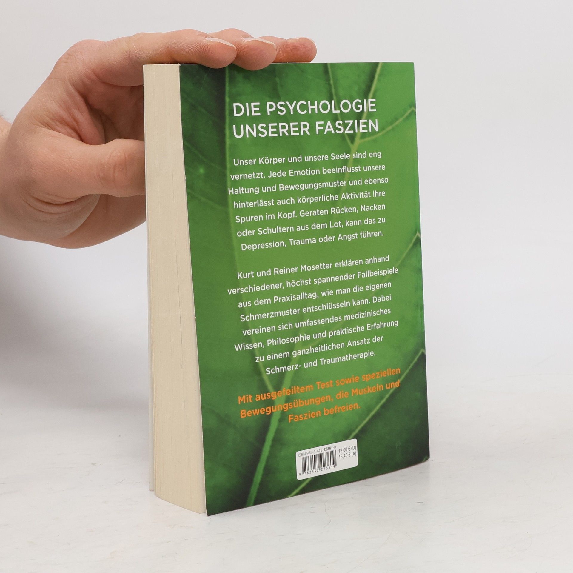 Die neue Faszienarbeit für Rücken und Seele. Körper und Psyche sind eng vernetzt: Jede körperliche Aktivität und Belastung hinterlässt ihre Spuren im Kopf, genauso wie Emotionen und Gefühle auf den Körper »abfärben«. So verkörpern unsere Haltung und unsere muskulären Bewegungsmuster das seelische und geistige Befinden. Ist dieses aus dem Lot geraten, etwa durch Depression, Trauma oder Angst, kann das für Rücken-, Nacken und Schulterschmerzen sorgen. Kurt und Reiner Mosetter erklären anhand verschiedener höchst spannender Fallbeispiele aus dem Praxisalltag, wie man die eigenen Schmerzmuster entschlüsseln kann. Dabei vereinen sich umfassendes medizinisches Wissen, Philosophie und praktische Erfahrung zu einem ganzheitlichen Ansatz der Schmerz- und Traumatherapie. Mithilfe eines ausgefeilten Tests kann der Leser persönliche »Stolperschwellen« aufdecken und so selbst regulierend auf das körperlich-seelische Befinden einwirken. Spezielle Bewegungsübungen, welche Muskeln und Faszien befreien, helfen dabei.