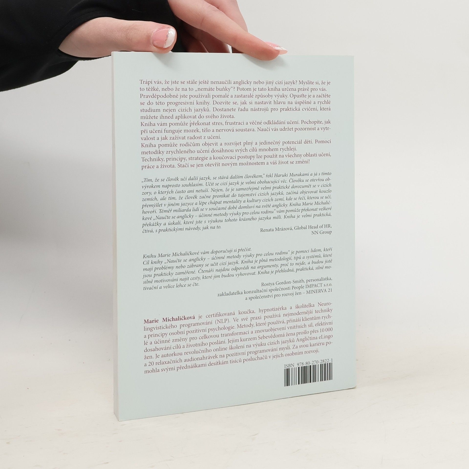 42 % lidí se učí angličtinu řadu let, ale jejich znalosti jsou stále na úrovni začátečníků. Je to i váš případ? Na vině jsou zastaralé postupy učení, které nevedou k požadovaným výsledkům. Dnešní doba je jiná. Moderní. Rychlá. A vyžaduje i jiné způsoby učení. Právě teď máte šanci na změnu. Vystupte ze začarovaného kruhu neúspěchu. Seznamte se s novou knihou Naučte se anglicky. Objevte tajemství nové metody učení, která využívá principy práce s podvědomím, techniky zrychleného učení, Neurolingvistického programování a hypnózy. Pravidla rychlého a efektivního učení využijete při učení jakéhokoli cizího jazyka, ale také při studiu jiných předmětů. Začněte se učit cokoli, teď už budete vědět jak. Kniha vám pomůže zbavit se mýtů o učení, paměti a talentu, a ukáže vám, jak se učit s radostí a bez stresu.