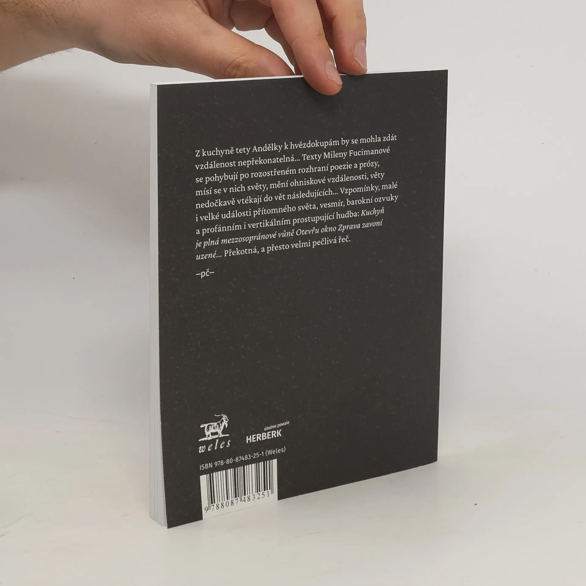 Z kuchyně tety Andělky k hvězdokupám by se mohla zdát vzdálenost nepřekonatelná… Texty Mileny Fucimanové se pohybují po rozostřeném rozhraní poezie a prózy, mísí se v nich světy, mění ohniskové vzdálenosti, věty nedočkavě vtékají do vět následujících… Vzpomínky, malé i velké události přítomného světa, vesmír, barokní ozvuky a profánním i vertikálním prostupující hudba: Kuchyň je plná mezzosopránové vůně Otevřu okno Zprava zavoní uzené… Překotná, a přesto velmi pečlivá řeč.