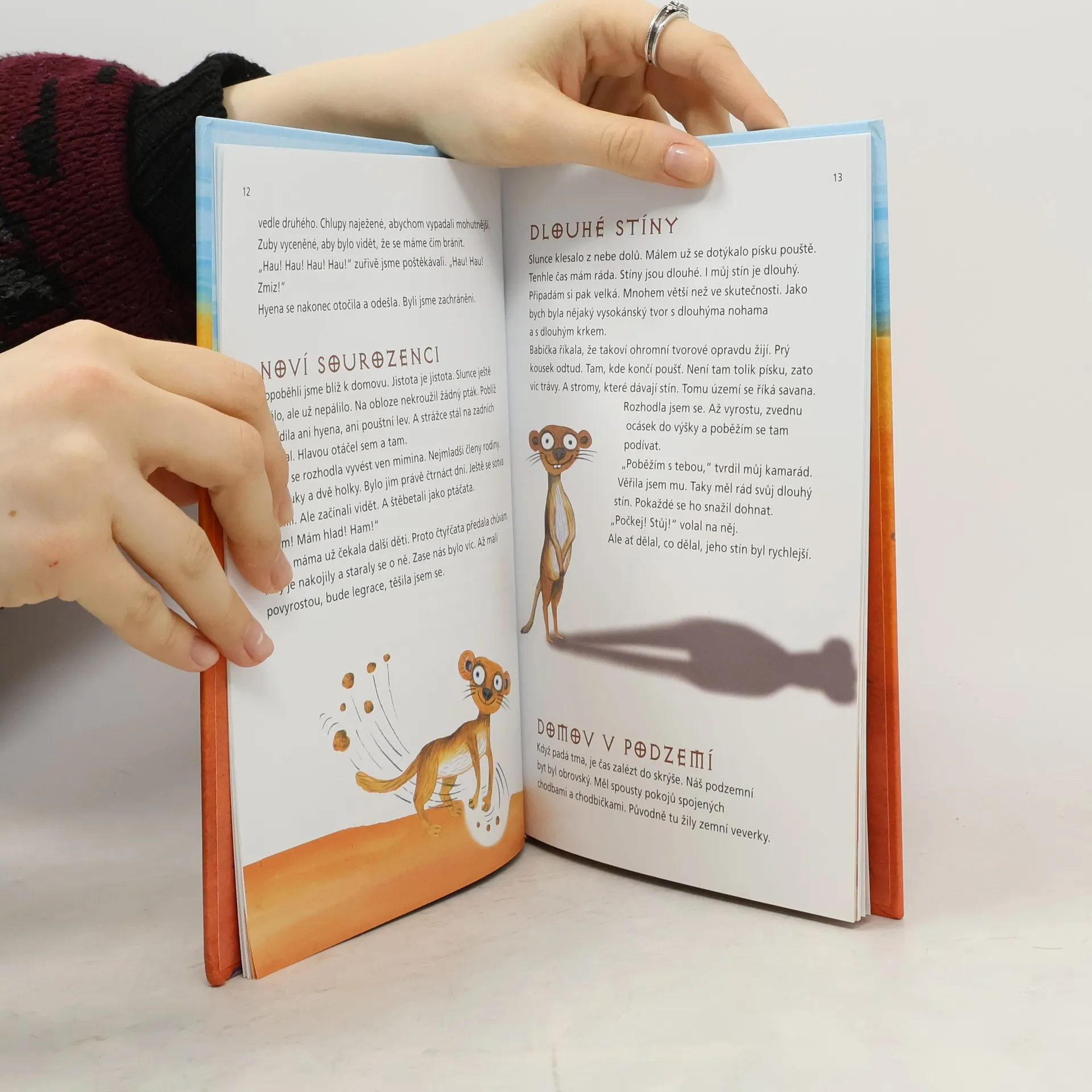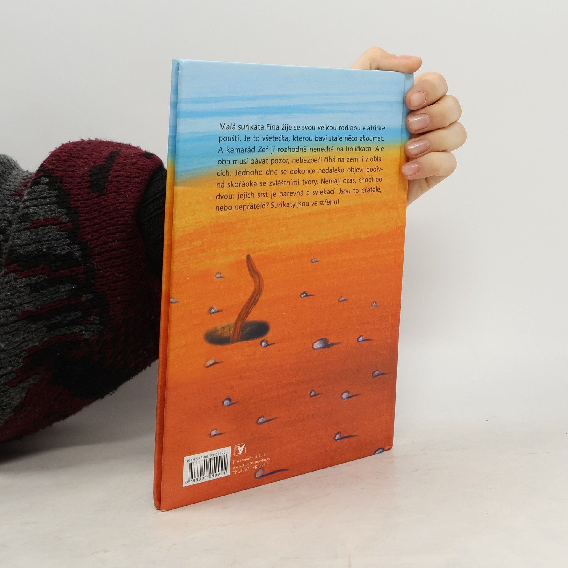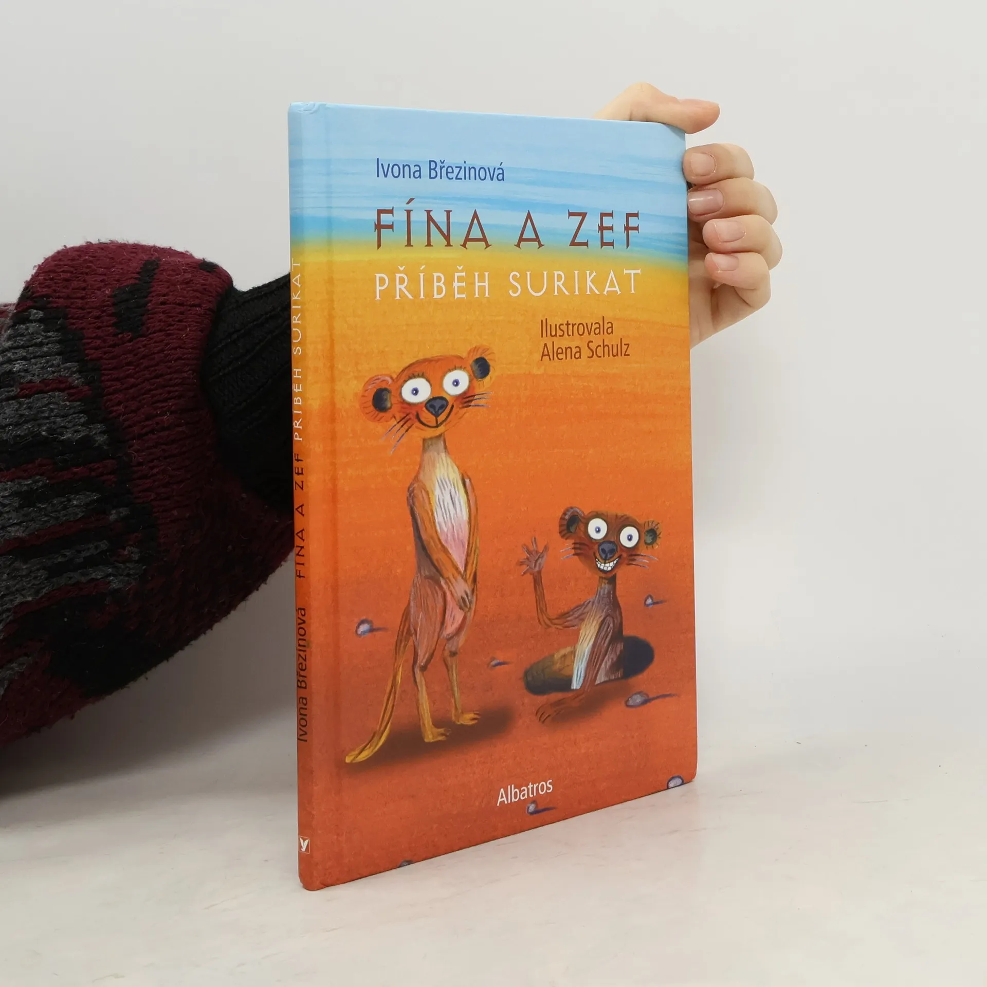 Hravé vyprávění o roztomilých surikatách se spoustou rébusů a zajímavostí v přiloženém sešitě. V africké poušti Kalahari žije malá surikata Fína a její velká rodina. Fína se rozhodně nenudí, protože s kamarádem Zefem vyvádí jednu vylomeninu za druhou. Občas ale musí dávat pozor – život v poušti může být pěkně nebezpečný. Jednoho dne se poblíž surikatí nory objeví podivná skořápka, z níž vylezou dva neznámí tvorové. Nemají ocas, chodí po dvou a jejich tělo je pokryté barevnou svlékací srstí. Vyklubou se z nich přátelé, nebo nepřátelé?