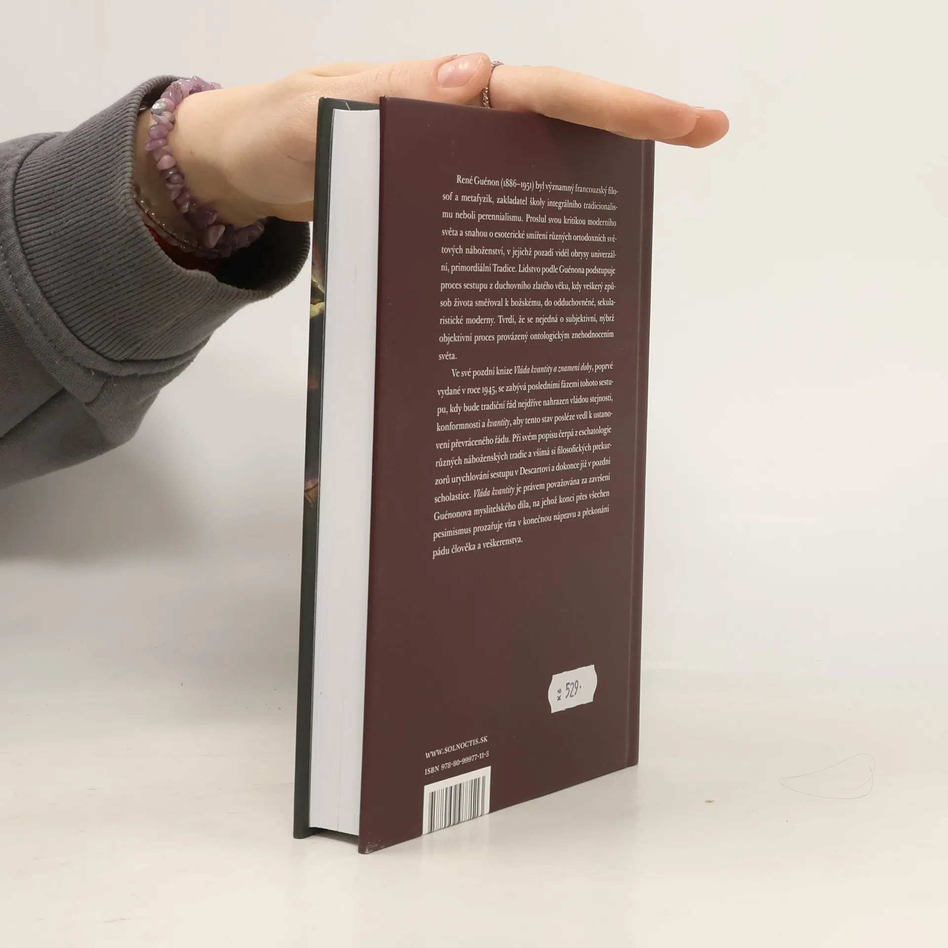 René Guénon (1886-1951) byl významný francouzský filosof a metafyzik, zakladatel školy integrálního tradicionalismu neboli perennialismu. Proslul svou kritikou moderního světa a snahou o esoterické smíření různých ortodoxních světových náboženství, v jejichž pozadí viděl obrysy univerzální, primordiální Tradice. Lidstvo podle Guénona podstupuje proces sestupu z duchovního zlatého věku, kdy veškerý způsob života směřoval k božskému, do odduchovněné, sekularistické moderny. Tvrdí, že se nejedná o subjektivní, nýbrž objektivní proces provázený ontologickým znehodnocením světa. Ve své pozdní knize Vláda kvantity a znamení doby, poprvé vydané v roce 1945, se zabývá posledními fázemi tohoto sestupu, kdy bude tradiční řád nejdříve nahrazen vládou stejnosti, konformnosti a kvantity, aby tento stav posléze vedl k ustanovení převráceného řádu. Při svém popisu čerpá z eschatologie různých náboženských tradic a všímá si filosofických prekurzorů urychlování sestupu v Descartovi a dokonce již v pozdní scholastice. Vláda kvantity je právem považována za završení Guénonova myslitelského díla, na jehož konci přes všechen pesimismus prozařuje víra v konečnou nápravu a překonání pádu člověka a veškerenstva.