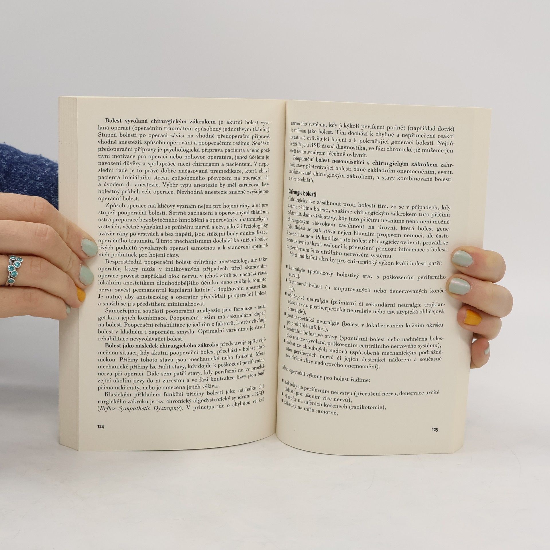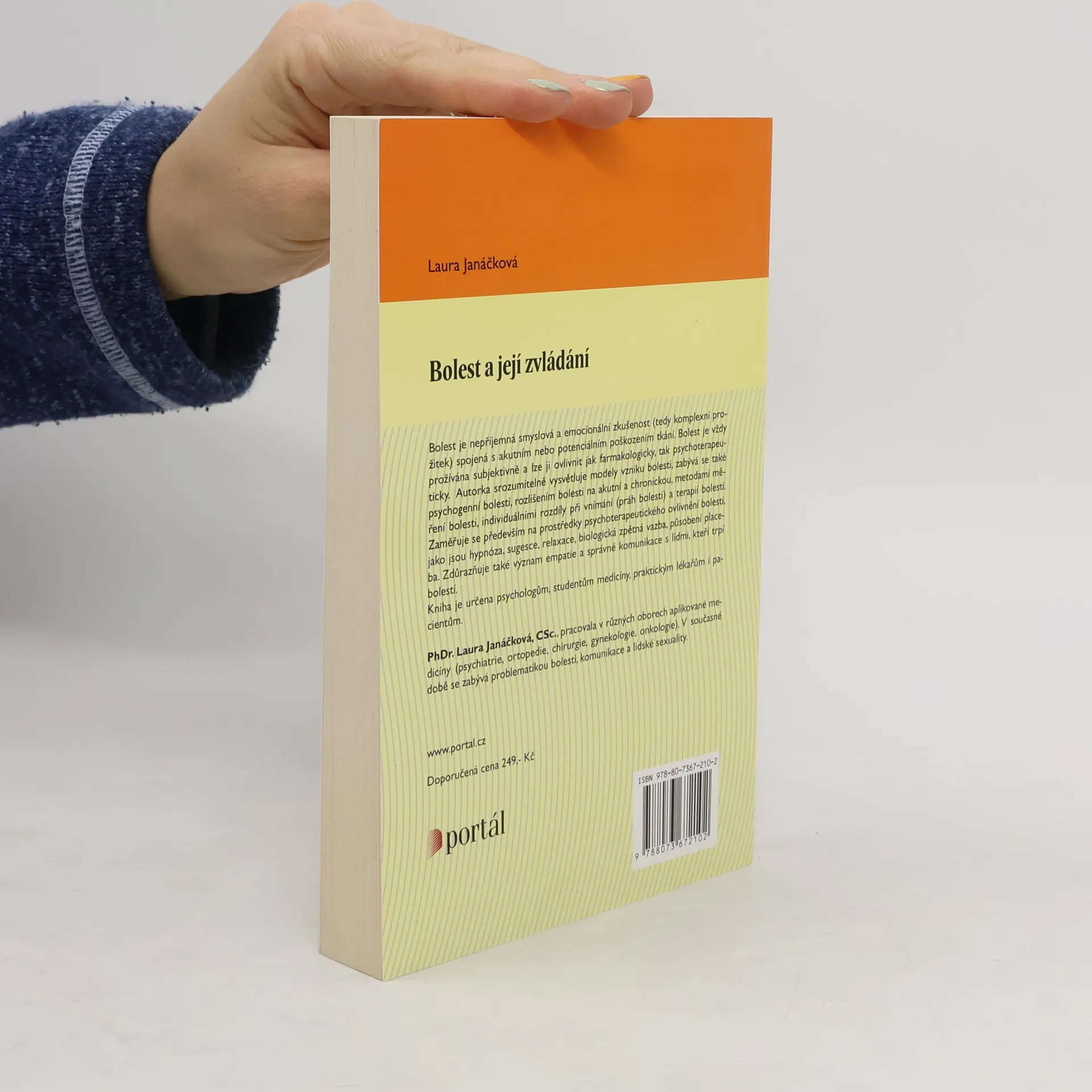 Kniha je určena psychologům, studentům medicíny, praktickým lékařům i pacientům. Bolest je nepříjemná senzorická a emocionální zkušenost (tedy komplexní prožitek) spojená s akutním nebo potenciálním poškozením tkání. Bolest je vždy prožívána subjektivně a lze ji ovlivnit jak farmakologicky, tak psychoterapeuticky. Autorka srozumitelně vysvětluje modely vzniku bolesti, zabývá se také psychogenní bolestí, rozlišením bolesti na akutní a chronickou, metodami měření bolesti, individuálními rozdíly při vnímání (práh bolesti) a terapií bolesti. Zaměřuje se především na prostředky psychoterapeutického ovlivnění bolesti, jako jsou hypnóza, sugesce, relaxace, biologická zpětná vazba, působení placeba. Zdůrazňuje také význam empatie a správné komunikace s lidmi, kteří trpí bolestí.