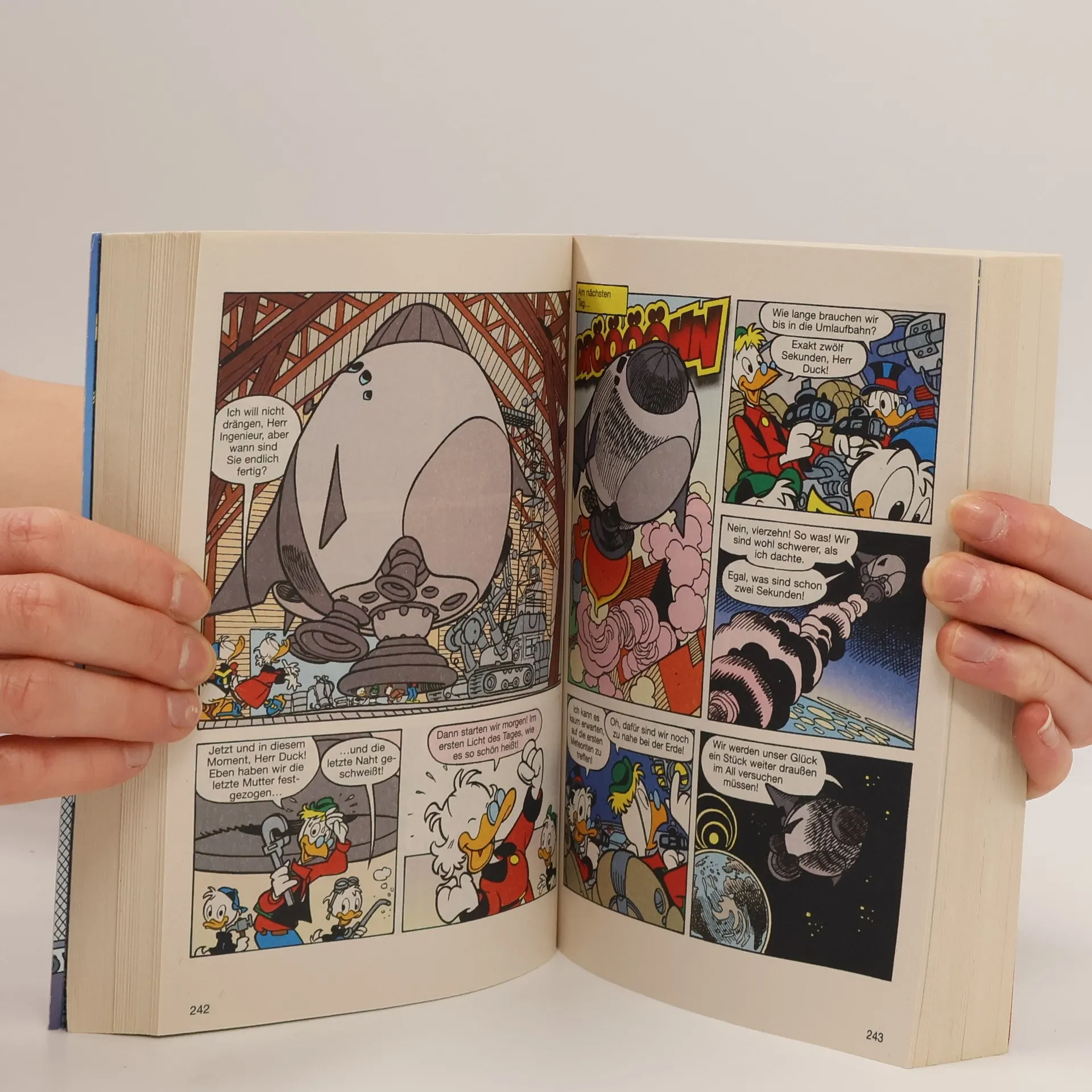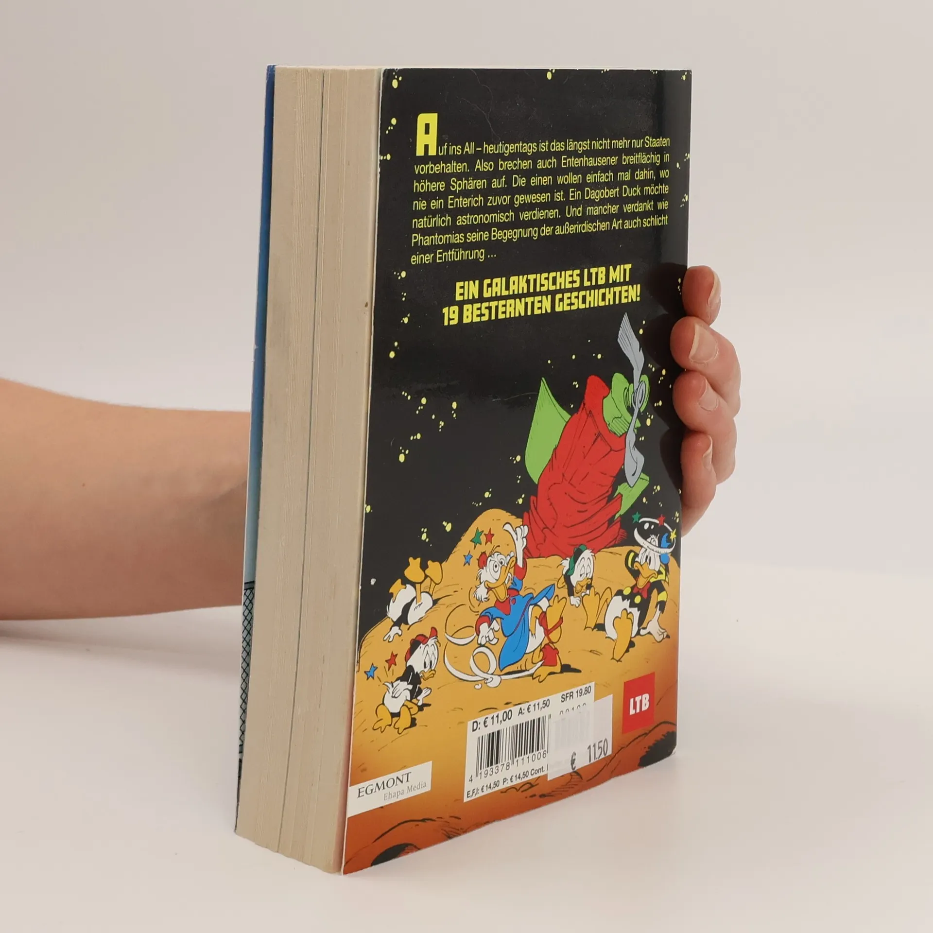 Auf ins All – heutigentags ist das längst nicht mehr nur Staaten vorbehalten. Also brechen auch Entenhausener breitflächig in höhere Sphären auf. Die einen wollen einfach mal dahin, wo nie ein Enterich zuvor gewesen ist. Ein Dagobert Duck möchte natürlich astronomisch verdienen. Und mancher verdankt wie Phantomias seine Begegnung der außerirdischen Art auch schlicht einer Entführung …