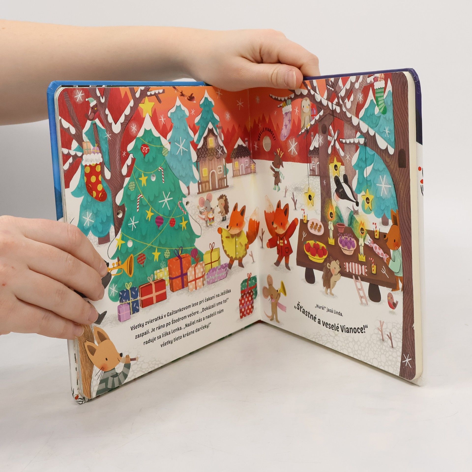 Dve malé líšky majú obavy, aby ich na Štedrý večer Ježiško našiel. V lese je hlboká tma a ticho. Čo tak rozvesiť zopár svetielok a zahrať Ježiškovi nejakú vianočnú hudbu? Skvelý nápad! Zostáva len zapojiť všetky ostatné zvieratká. A teba tiež! Pomôž líštičkám rozžiariť a rozoznieť les. Stačí stlačiť tlačidlo a hneď zaznejú nádherné zvuky a budeš môcť pozorovať žiariace svetielka v tejto kúzelnej knihe s vianočným príbehom.