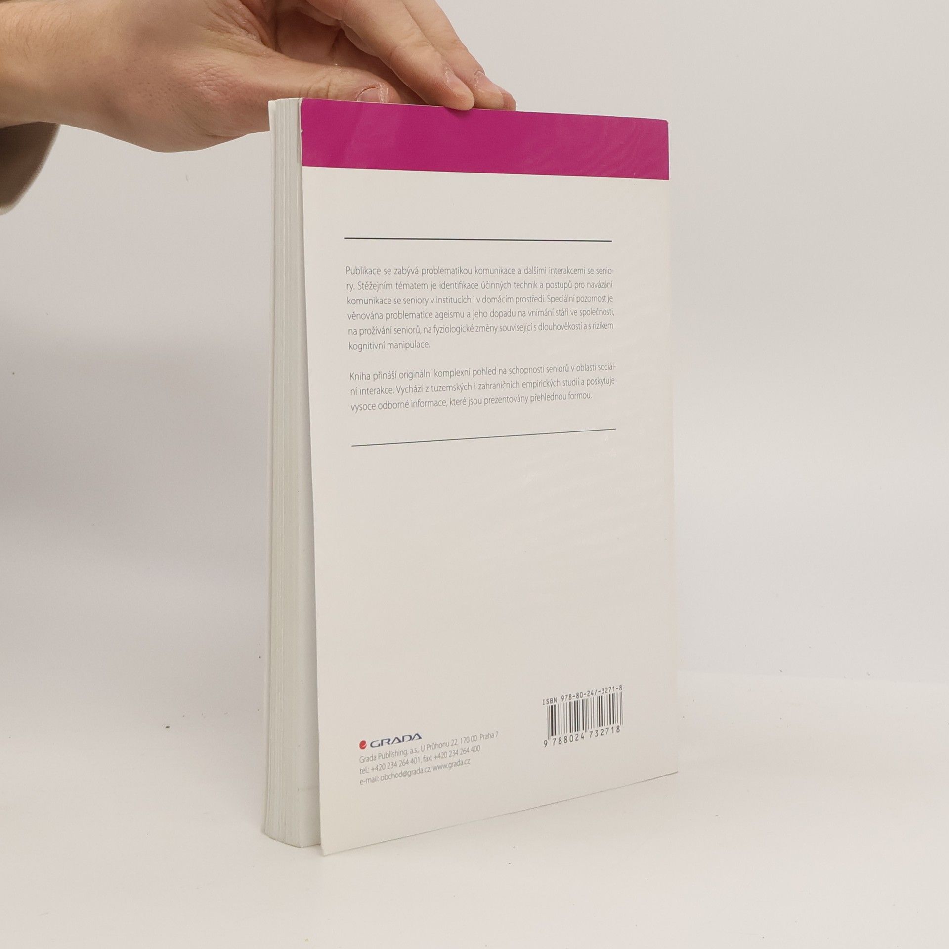 Publikace se zabývá problematikou komunikace a dalšími interakcemi se seniory. Stěžejním tématem je identifikace účinných technik a postupů pro navázání komunikace se seniory v institucích a v domácím prostředí. Speciální pozornost je věnována ageismu a jeho dopadu na vnímání stáří ve společnosti, na prožívání seniorů, na fyziologické změny související s dlouhověkostí a s rizikem kognitivní manipulace. Kniha vychází z tuzemských i zahraničních empirických studií.