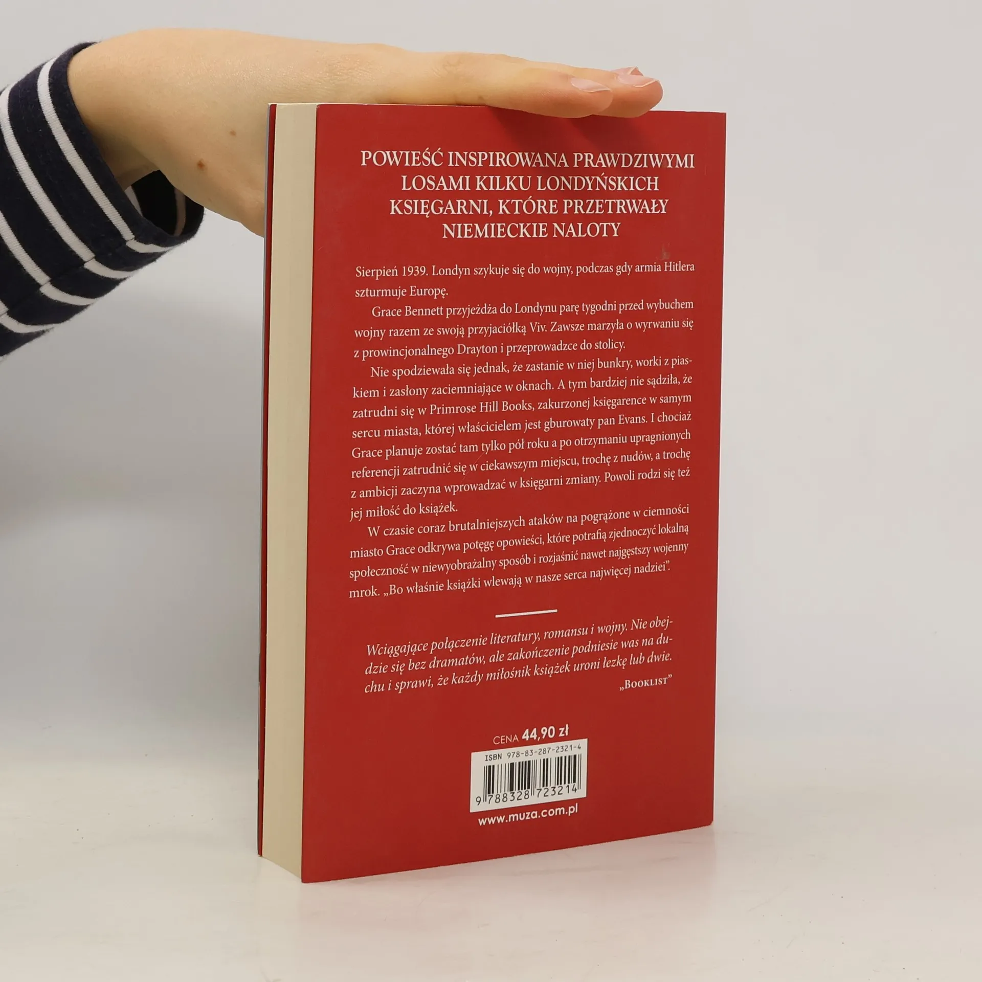 Wciągające połączenie literatury, romansu i wojny. Nie obejdzie się bez dramatów, ale zakończenie podniesie was na duchu i sprawi, że każdy miłośnik książek uroni łezkę lub dwie - BooklistOstatnia księgarnia w Londynie to cudowna opowieść o przyjaźni, stracie i miłości. Martin błyskotliwie i zarazem pokrzepiająco opisuje trudy życia w targanym wojną Londynie. Książka, która doprowadzi was i do śmiechu, i do łez. Absolutnie wspaniała - Soraya M. Lane, autorka bestsellerów Wives of War i The Last CorrespondentInspirowana historią kilku księgarni, którym udało się przetrwać Blitz, Ostatnia księgarnia w Londynie jest ponadczasową opowieścią o wojennej stracie, miłości i niepokonanej sile literatury.Sierpień, 1939. Londyn szykuje się do wojny, podczas gdy armia Hitlera szturmuje Europę. Grace Bennett zawsze marzyła o przeprowadzce do stolicy, ale nie spodziewała się, że zastanie w niej bunkry, worki z piaskiem i zasłony zaciemniające w oknach. A tym bardziej nie sądziła, że zatrudni się w Primrose Hill, zakurzonej księgarence w samym sercu Londynu.W czasie coraz brutalniejszych ataków na pogrążone w ciemności miasto, Grace odkrywa potęgę opowieści, które potrafią zjednoczyć lokalną społeczność w niewyobrażalny sposób i rozjaśnić nawet najgęstszy wojenny mrok.
