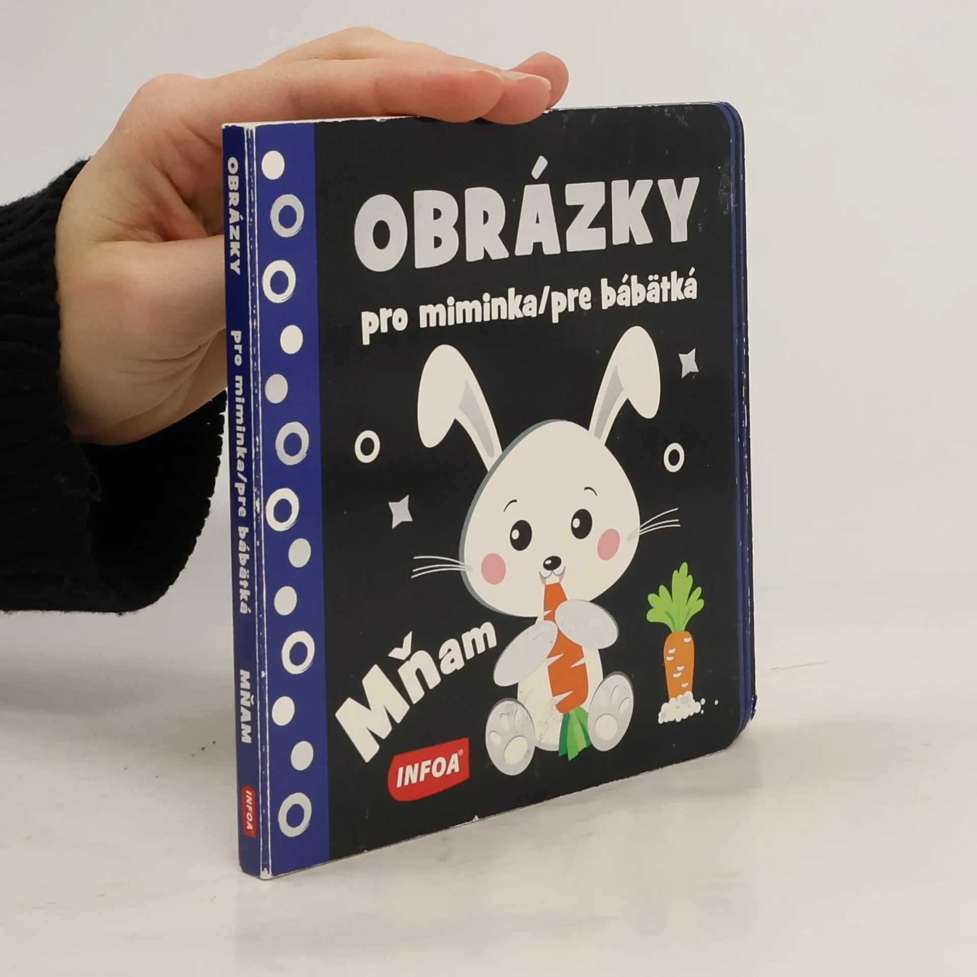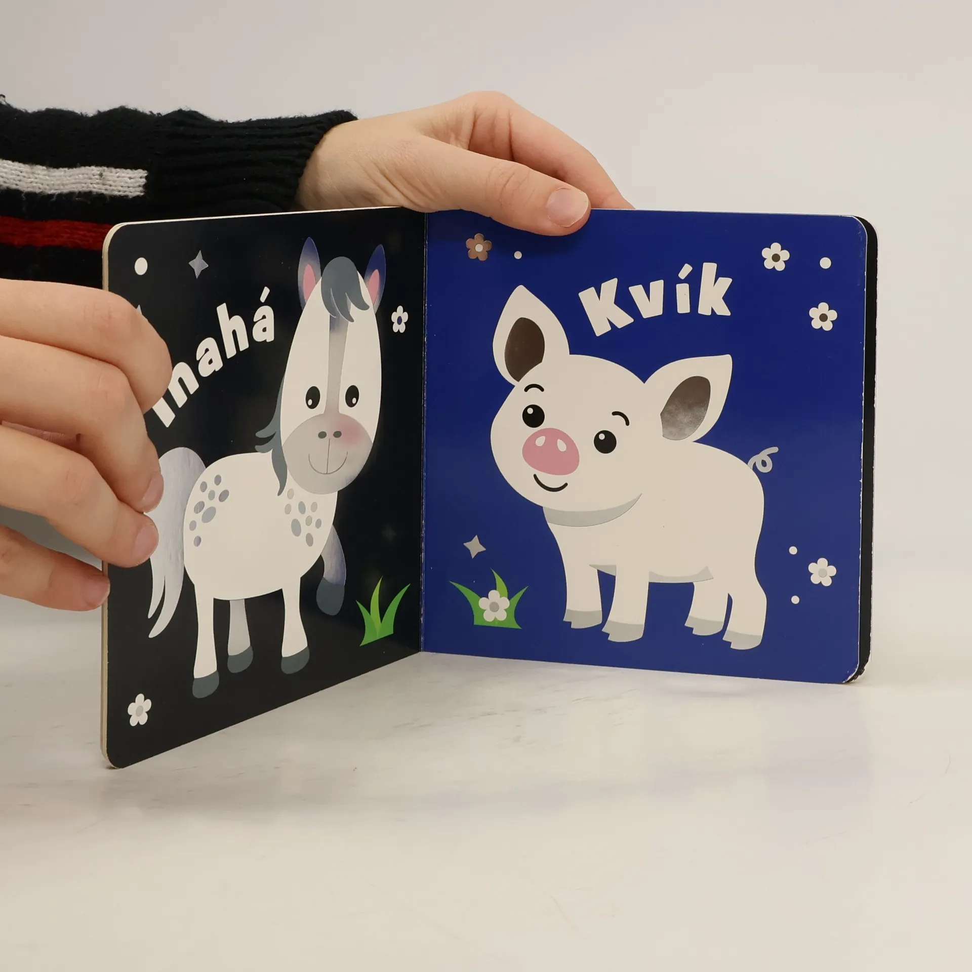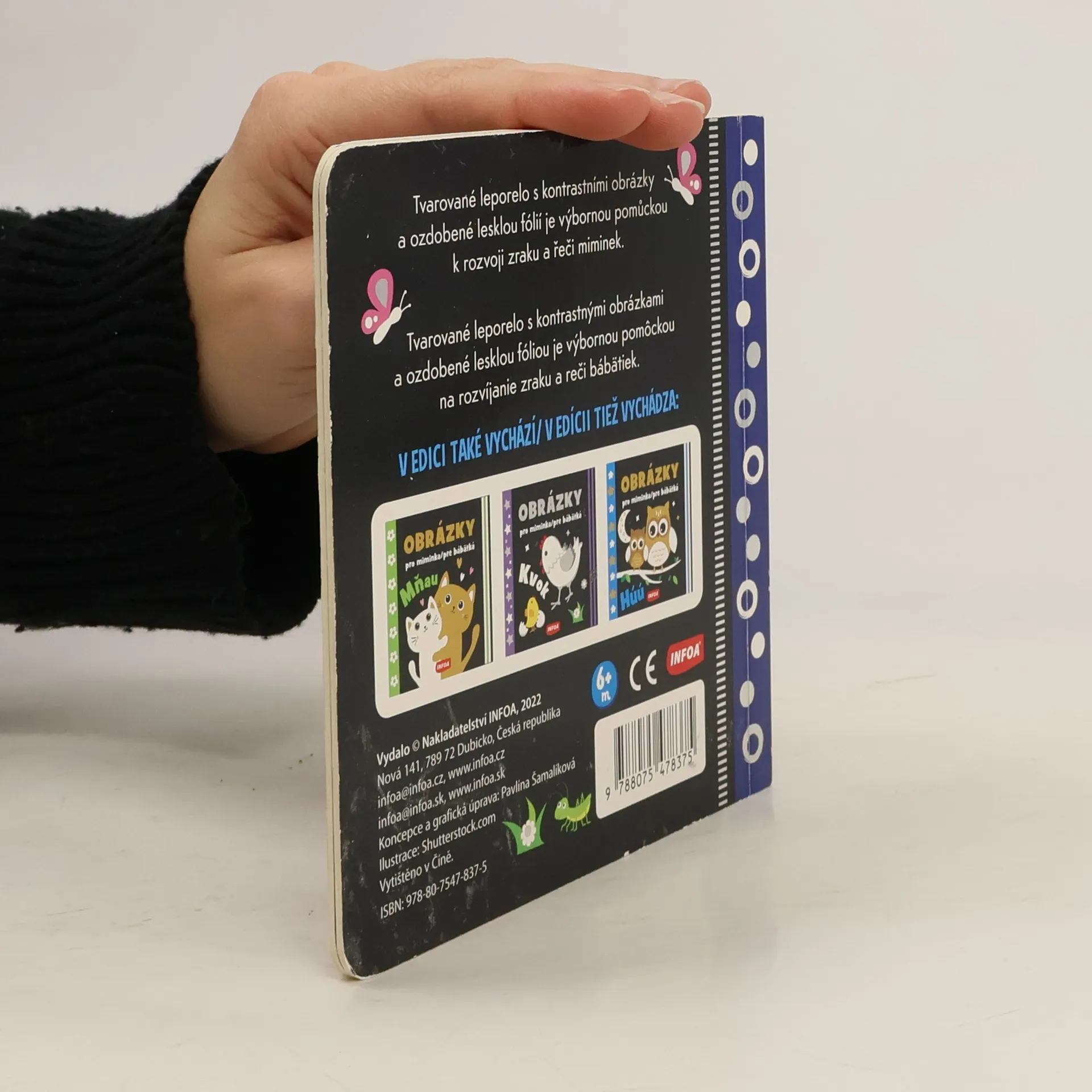 Tvarované leporelo s kontrastními obrázky a ozdobené lesklou fólií je výbornou pomůckou k rozvoji zraku a řeči miminek.