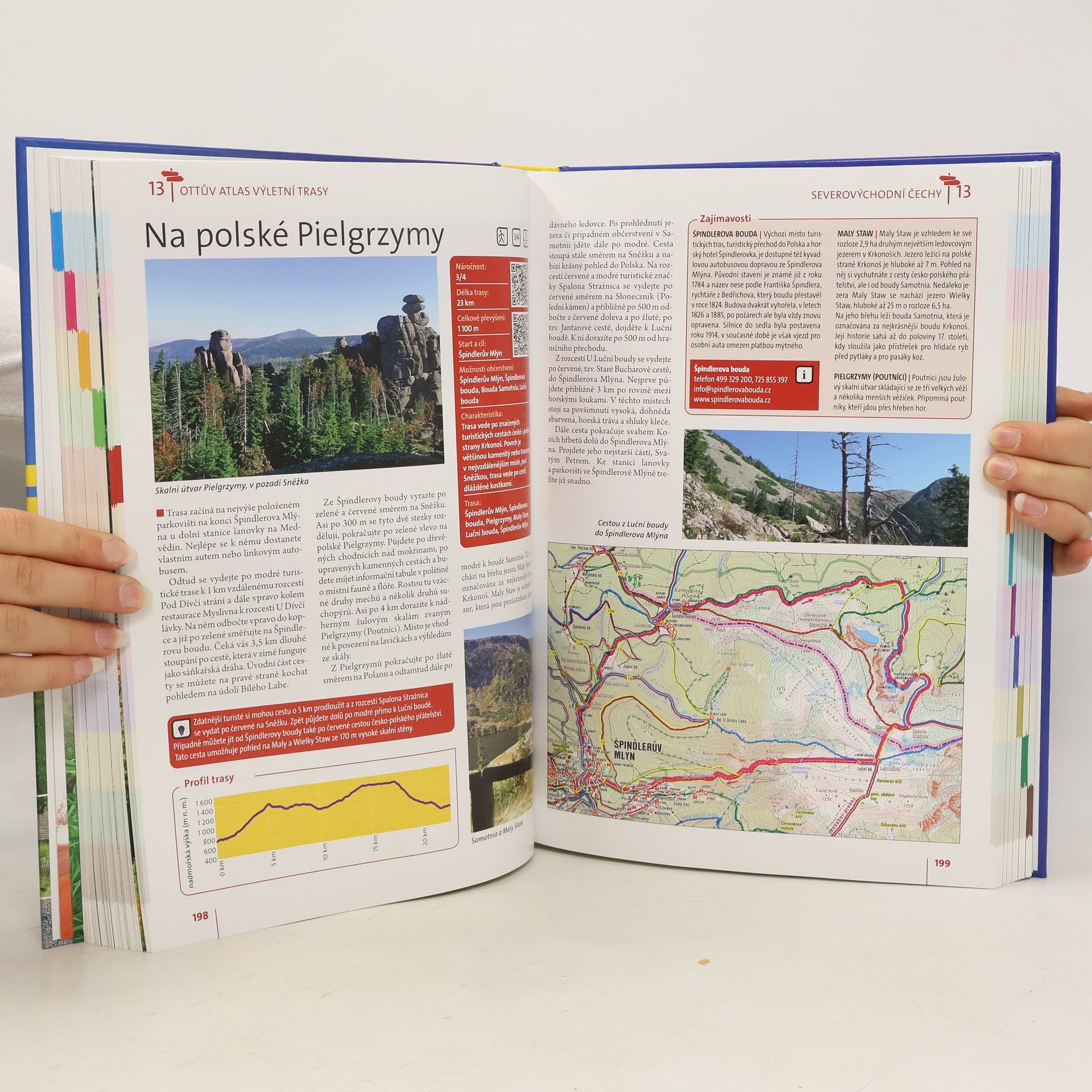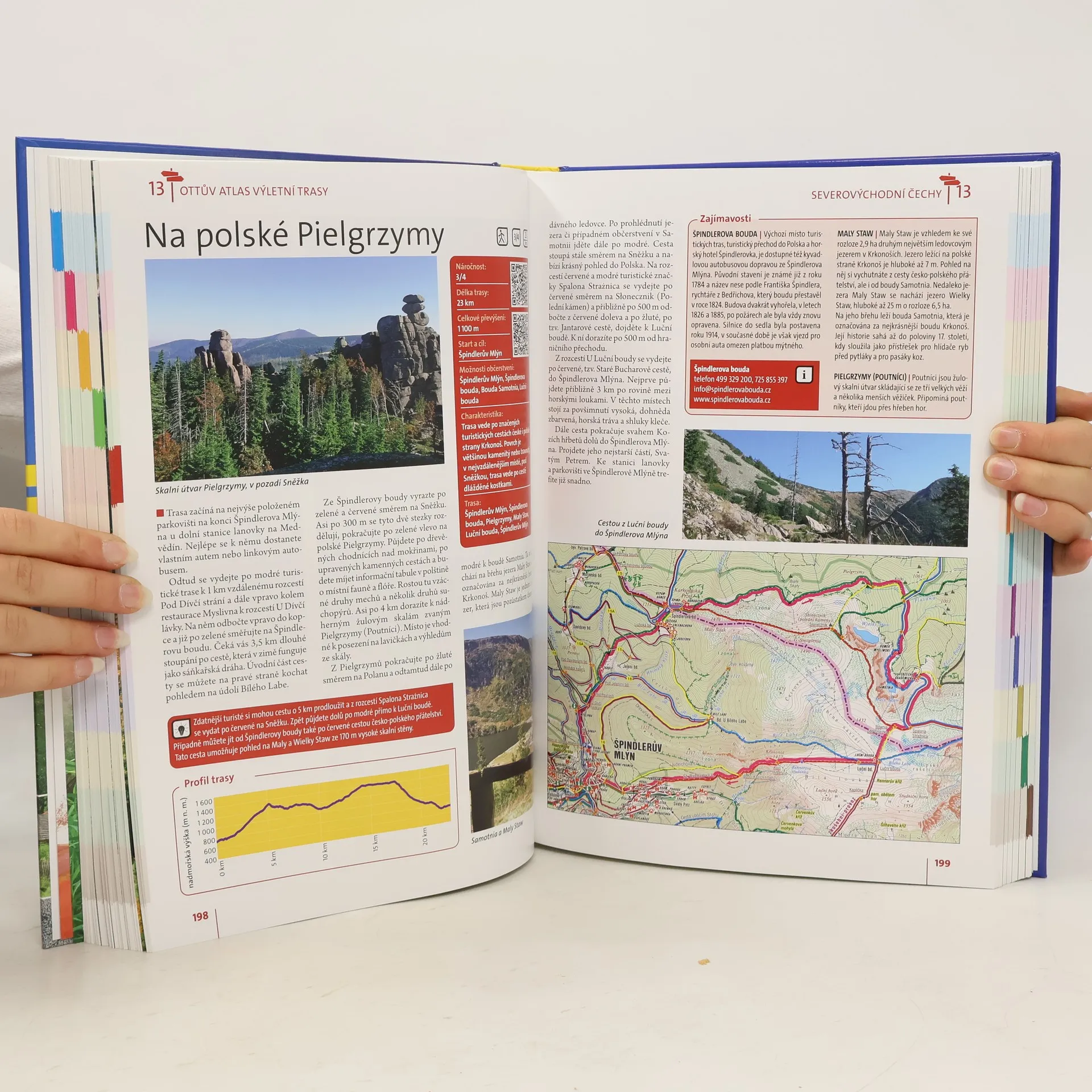 Unikátní vydání turistického atlasu se zaměřuje na nejkrásnější místa Čech, Moravy a Slezska, včetně pohraničí a okolních zemí. Průvodce je rozdělen do 12 oblastí, přičemž každá nabízí více než 20 atraktivních pěších a cyklistických výletů s popisem významných přírodních a historických památek. Trasy začínají a končí v místech s dobrou dostupností hromadné dopravy a občerstvení. Výletní trasy jsou přehledně označeny a rozděleny podle náročnosti do čtyř stupňů, přičemž u každé je graf s celkovým převýšením, což umožňuje turistům vybrat si trasu odpovídající jejich schopnostem. Každá trasa obsahuje stručnou charakteristiku a popis povrchu cesty, u cyklistických tras je doporučen vhodný typ kola. Na konci každé trasy najdete informace o památkách a zajímavostech včetně užitečných kontaktů. Součástí výletů je také tip na úpravu trasy podle vlastních potřeb. Podrobná mapka zobrazuje příslušný úsek s barevně zvýrazněnou trasou, a přiložené fotografie zachycují atmosféru kraje. Kniha obsahuje QR kódy, které umožňují načíst údaje o trasách do navigace nebo chytrého telefonu. Stačí stáhnout gpx soubor a nechat se vést na svých výletech.