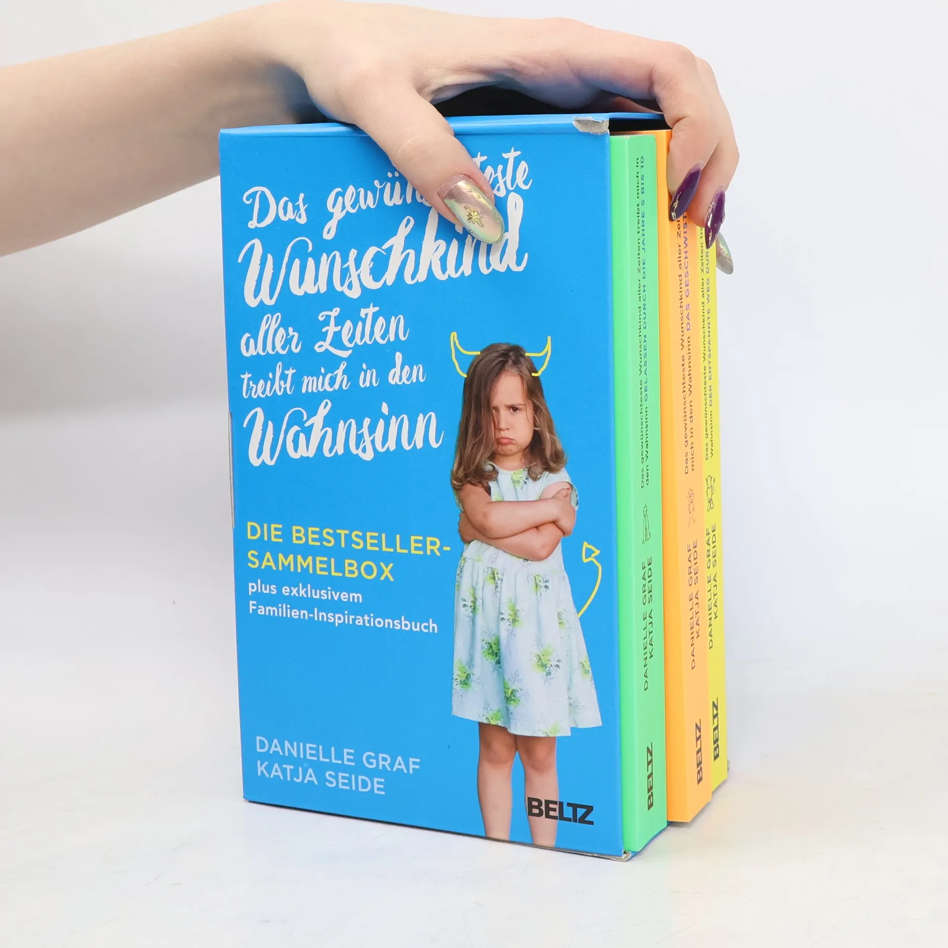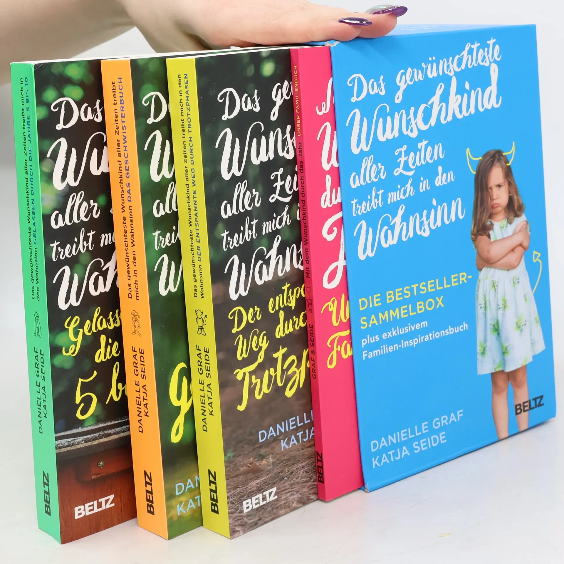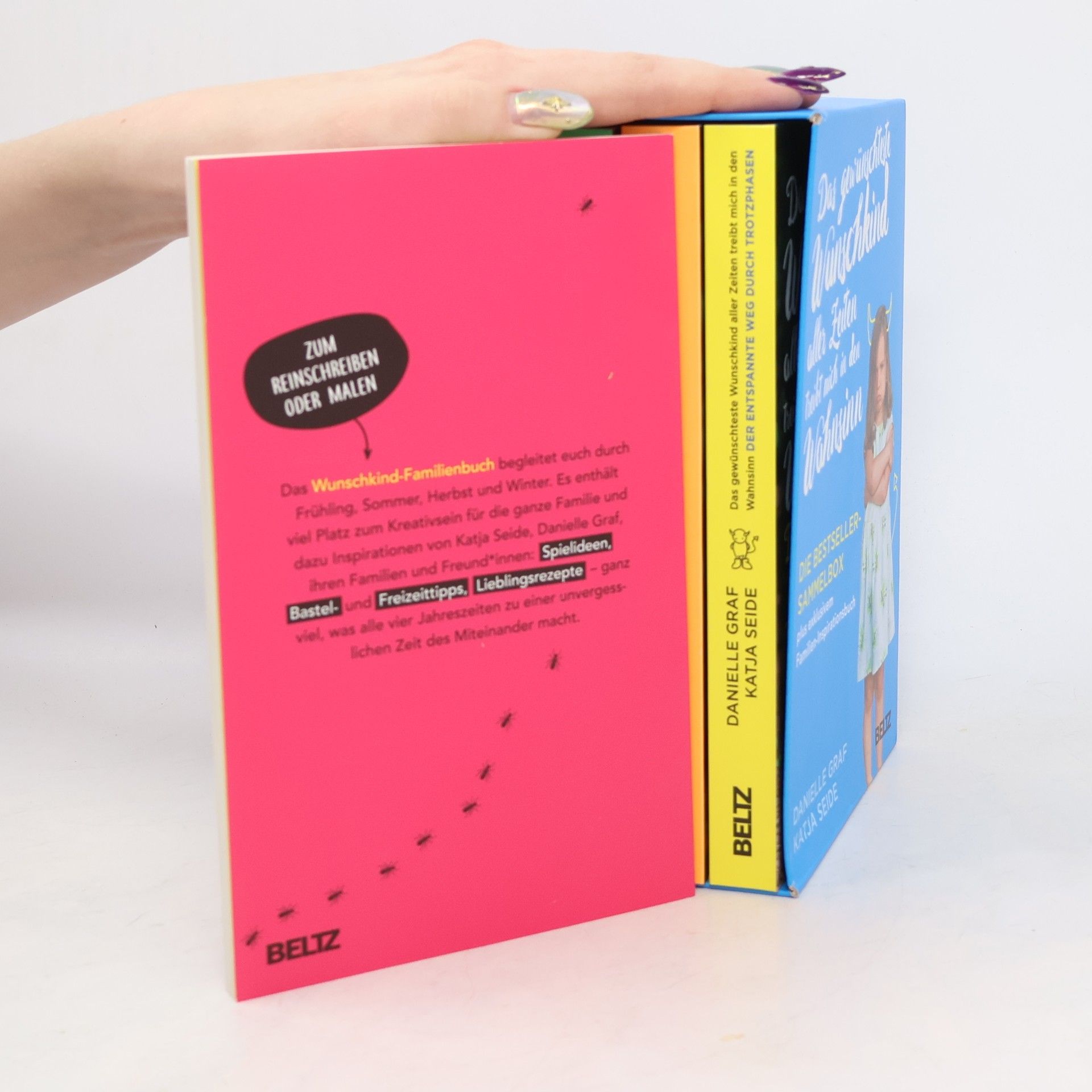 Die große Wunschkind-Sammelbox bietet Lösungen und Inspirationen für die wichtigsten Erziehungsdauerbrenner zwischen 0 und 10 Jahren: Trotzphasen (Band 1), Wackelzahnpubertät (Band 2) und Geschwister auf Augenhöhe begleiten (Band 3). Exklusiv für diese Box gibt‘s das Familien-Inspirationsbuch »Mit dem Wunschkind durch das Jahr. Unser Familienbuch« mit Tipps, Spielideen, Rezepten für Frühjahr, Sommer, Herbst und Winter und mit viel Platz zum Reinschreiben oder Reinmalen für Eltern und Kinder. Mithilfe dieser Box legen Eltern die Grundlagen für eine stabile Persönlichkeitsentwicklung und eine »verträgliche« Pubertät. Über 1000 Seiten, die Eltern und ihre Kinder für ein entspanntes Familienleben stärken, in dem die Bedürfnisse aller Familienmitglieder erfüllt werden. Für alle Fans der Wunschkind-Welt und solche, die es werden wollen!
