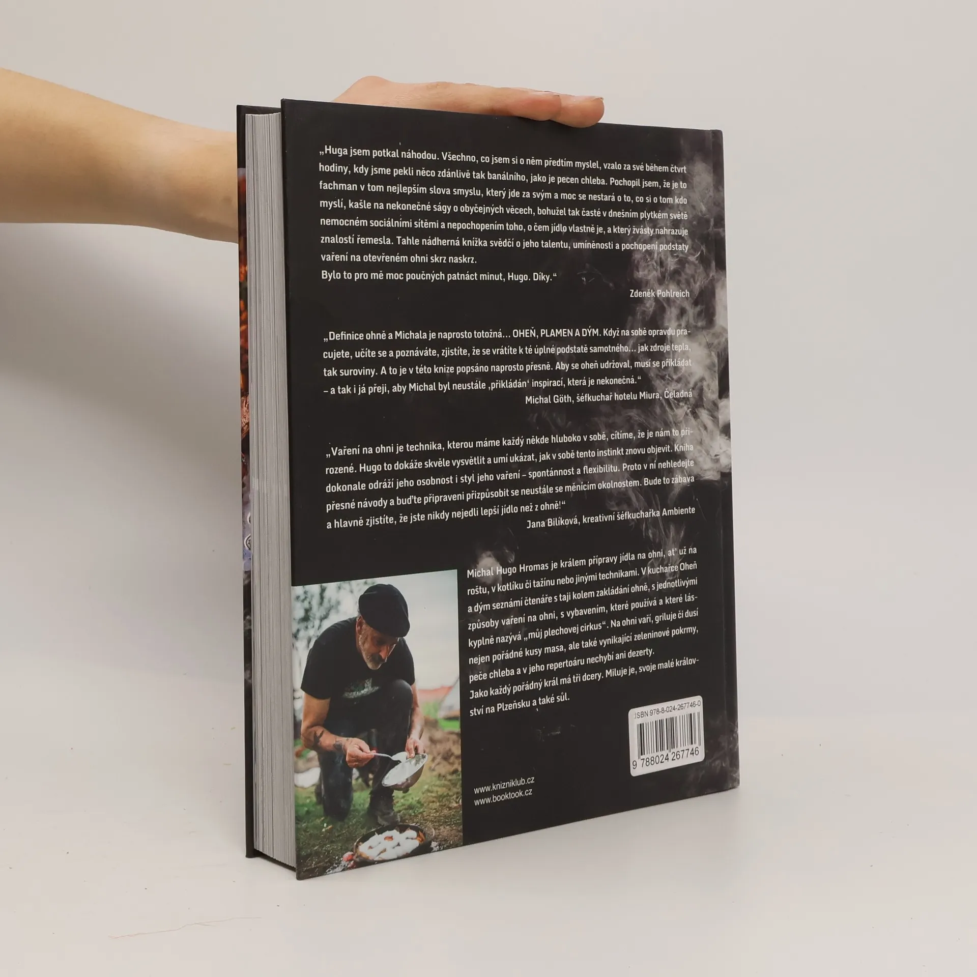 Originální kuchař Michal Hugo Hromas připravuje všechna jídla na ohni, ať už na roštu, v kotlíku či tažínu nebo jinými technikami. Ve své první autorské kuchařce Oheň a dým seznámí čtenáře s taji kolem zakládání ohně, s jednotlivými technikami vaření na ohni, s vybavením, které používá, a které láskyplně nazývá „můj plechovej cirkus“. Na ohni připravuje nejen pořádné kusy masa, ale také vynikající zeleninové pokrmy, peče chleba a dokonce i dezerty. Vaření na venkovním ohni je nejnovějším trendem světové gastronomie a Michal Hromas patří mezi přední mistry tohoto stylu. Velká, krásná, graficky originální kuchařka, ze které od první stránky sálá oheň a stoupá kouř, patří i do kategorie „coffee table“ kuchařek, tedy kuchařek, ze kterých budete nejen vařit, ale také si v nich číst a s potěšením si je prohlížet.