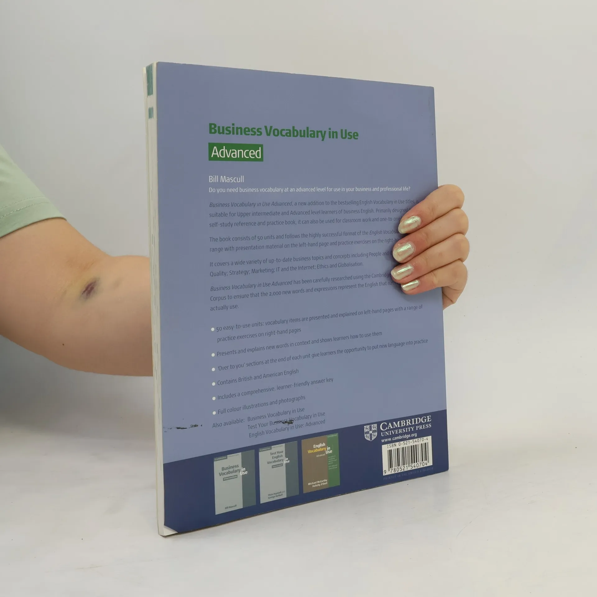 This is a self-study reference and practice book for upper intermediate and advanced learners of English who need vocabulary for business and professional purposes. Business Vocabulary in Use Advanced is a new self-study reference and practice book for advanced learners of English who need vocabulary for business and professional purposes. The book has been carefully researched using the Cambridge International Corpus to ensure that the 2,000 new words and expressions represent the English that native speakers actually use. The book consists of 50 units and follows the highly successful format of the English Vocabulary in use range with presenationa maerial on the lfeft-hand page and practice exercises on the right hand page. The book covers a wide variety of up-to-date business topics and concepts.