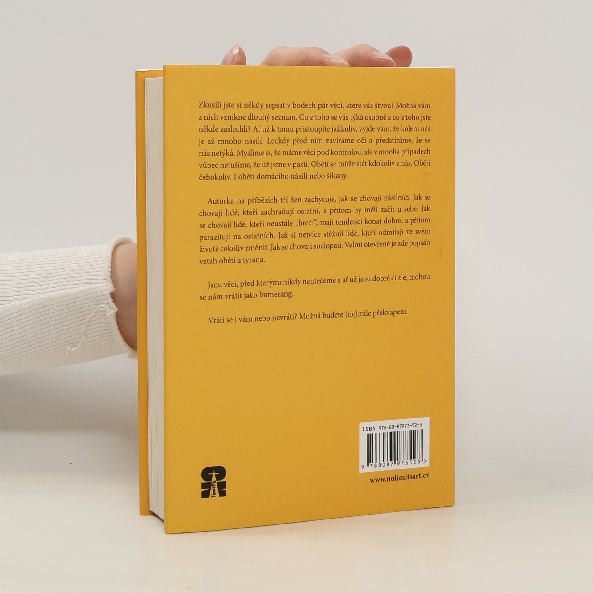 Román Bumerang otevřeně zkoumá různé formy násilí ve vztazích, přičemž násilí není jen o fyzických útocích či urážkách. Čím blíž máte k někomu vztah, tím snadněji můžete překročit hranici, za kterou už by nemělo být nic. Násilník postupně získává důvěru oběti, což vytváří falešný pocit blízkosti a činí únik z této situace velmi obtížným. Autorka prostřednictvím příběhů tří žen ukazuje chování násilníků, ale také lidí, kteří se snaží pomoci, a těch, kteří se neustále obětují, přičemž parazitují na ostatních. Kniha má schopnost otevřít oči a ukázat, že některé situace se nevyhnutelně vrátí jako bumerang, ať už jsou pozitivní či negativní. O knize se říká, že s mrazivou přesností popisuje dynamiku partnerského násilí a jeho postupné pronikání do vztahů. Zachycuje neúprosnost násilného partnera v touze po kontrole a mocí, stejně jako opakované pokusy oběti uniknout z nezdravého vztahu. Tato kniha vás nutí číst dál, i když byste se měli chystat spát, a ráno ji odkládáte dočtenou na noční stolek.