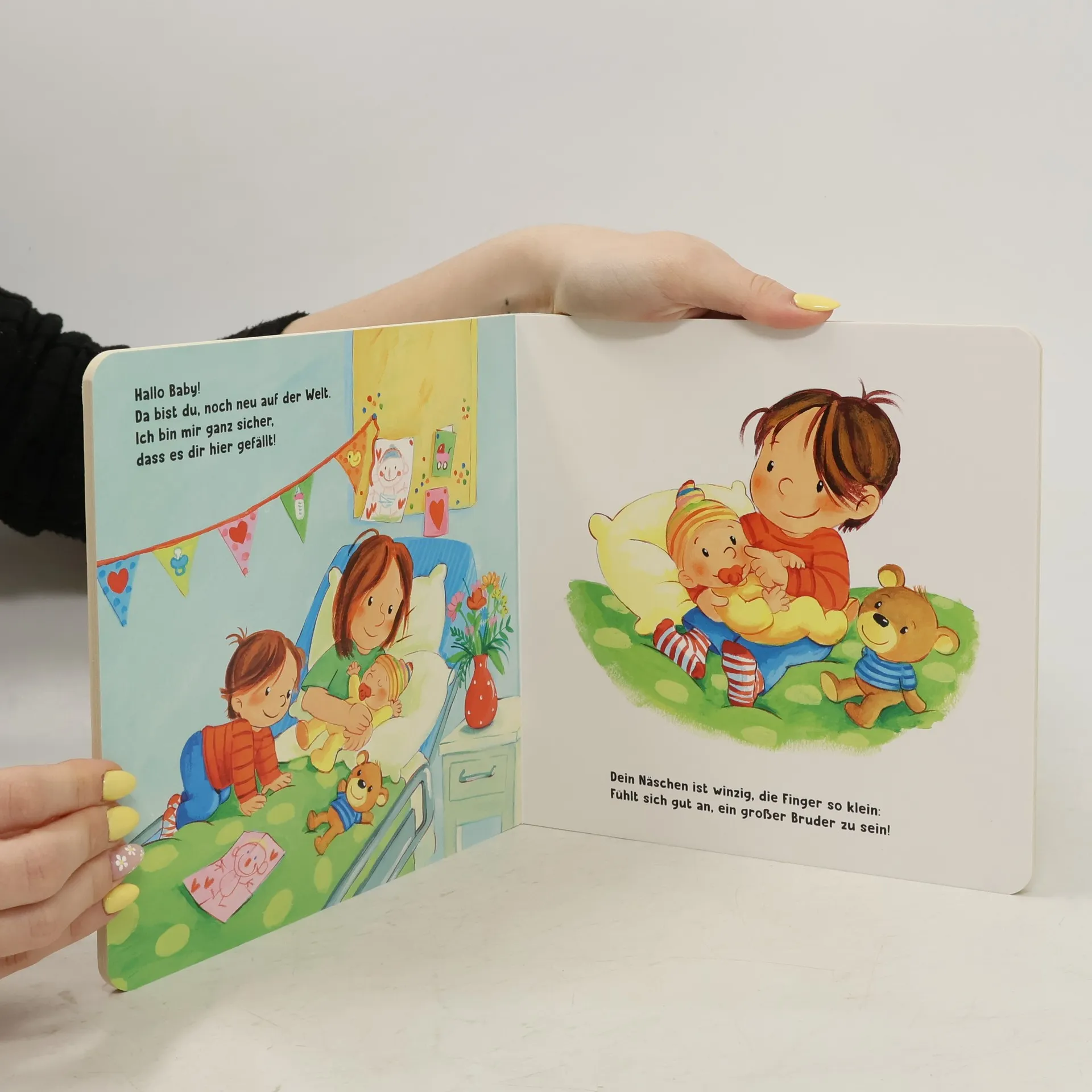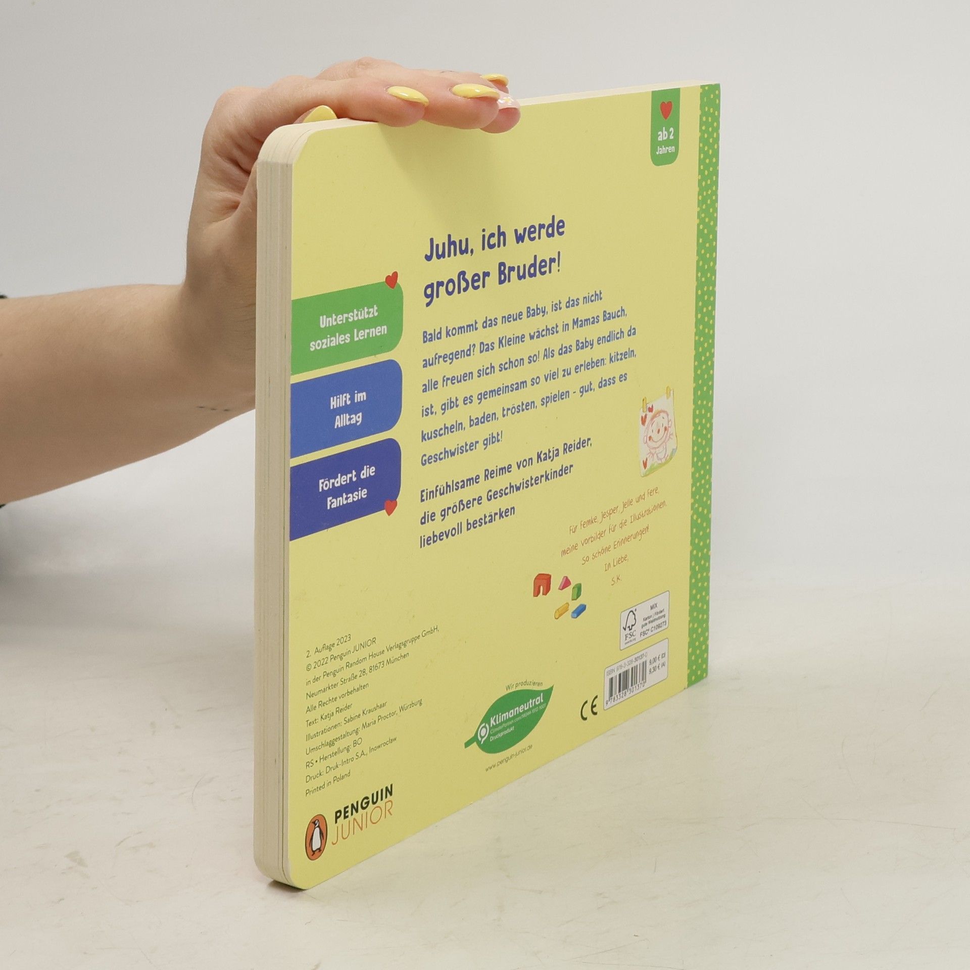 Ein neues Baby! Ein einfühlsames Pappbilderbuch für große Geschwisterkinder ab 2 Jahren Bald kommt das neue Geschwisterchen, ist das nicht aufregend? Das Kleine wächst in Mamas Bauch, alle freuen sich schon so! Als das Baby endlich da ist, gibt es für die ganze Familie so viel zu erleben: kitzeln, kuscheln, baden, trösten, spielen. Und auch, wenn Mama und Papa jetzt manchmal weniger Zeit haben, macht das Zusammensein doch so viel Spaß: Gut, dass es Geschwister gibt! Eine liebevoll gereimte Geschichte, die Kinder ab 2 Jahren darauf einstimmt, bald ein großer Bruder zu sein. Mit wunderbaren Illustrationen von Sabine Kraushaar. - Unterstützt soziales Lernen - Hilft im Alltag - Fördert die Fantasie In gleicher Ausstattung erschienen: Katja Reider/ Sabine Kraushaar: Juhu, ich bin jetzt große Schwester! Ausstattung: Mit fbg. Illustrationen