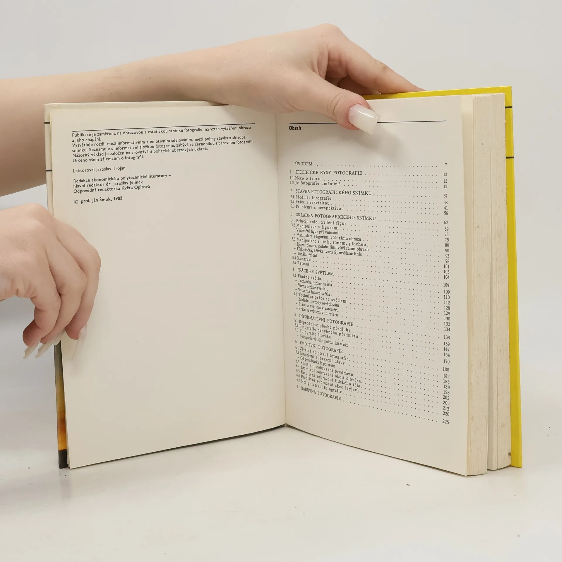 Publikace je zameřená na obsahovou a estetickou stránku fotografie, na vztah vytváření obrazu a jeho chápání. Jedná se o velmi podrobnou učebnici, která seznamuje se základními i pokročilými technikami svícení, skladbou snímku, ale i mnoha dalšími užitečnými informacemi (namátkou - pohyb vokamžiku expozice, práce s rekvizitami, kácení svislic, funkce rámu obrazu, členění plochy obrazu, strostlice, uzavření obrazu, reprodukce ploché předlohy, osvětlovací chyby, neutrální/emotivní zobrazení atd.).