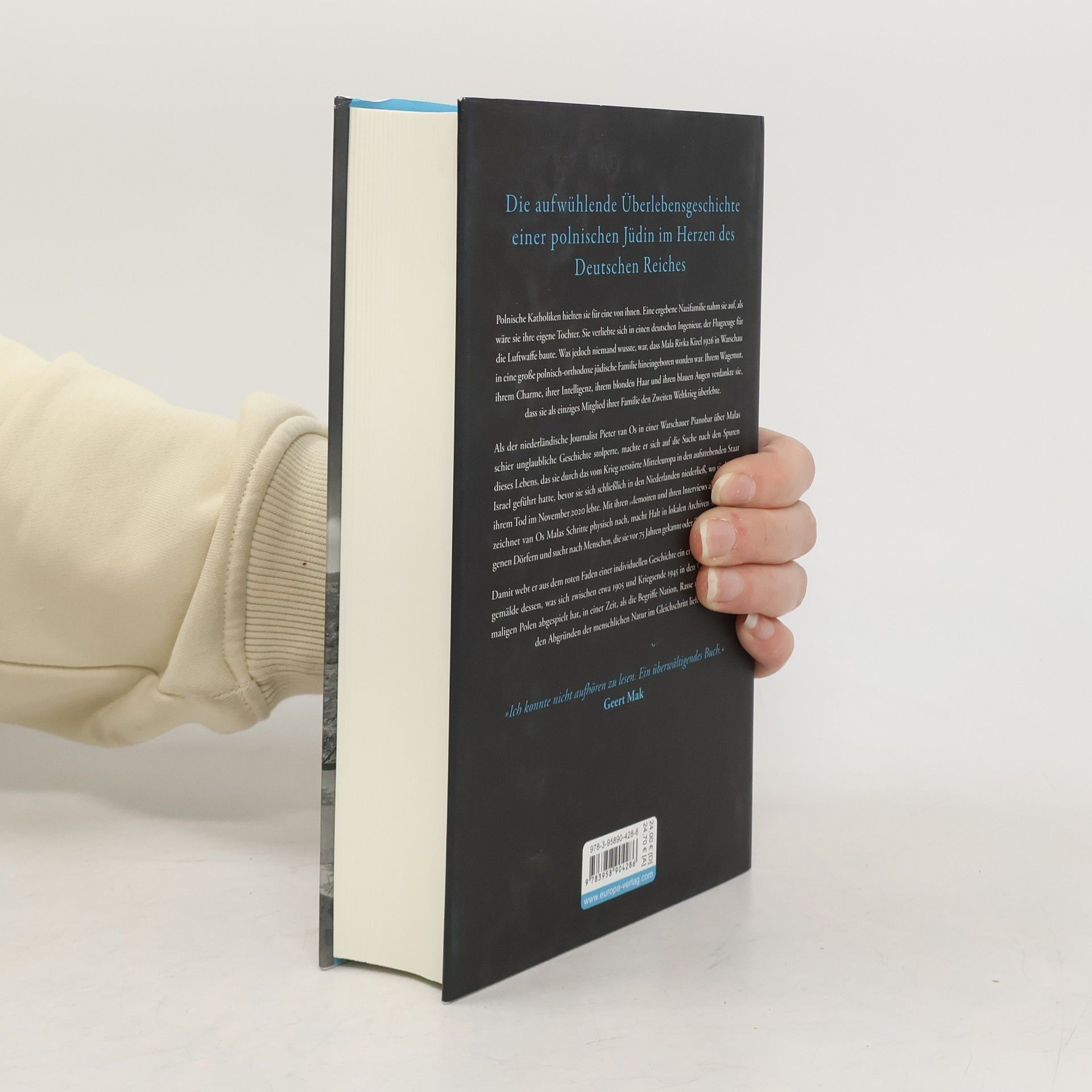 Polnische Katholiken hielten sie für eine von ihnen. Eine ergebene Nazifamilie nahm sie auf, als wäre sie ihre eigene Tochter. Sie verliebte sich in einen deutschen Ingenieur, der Flugzeuge für die Luftwaffe baute. Was jedoch niemand wusste, war, dass Mala Rivka Kizel 1926 in Warschau in eine große polnisch-orthodoxe jüdische Familie hineingeboren worden war. Ihrem Wagemut, ihrem Charme, ihrer Intelligenz, ihrem blonden Haar und ihren blauen Augen verdankt sie, dass sie als einziges Mitglied ihrer Familie den Zweiten Weltkrieg überlebte. Als der niederländische Journalist Pieter van Os in einer Warschauer Pianobar über Malas Geschichte stolperte, machte er sich auf die Suche nach den Spuren dieses Lebens, das sie durch das vom Krieg zerstörte Mitteleuropa in den aufstrebenden Staat Israel geführt hatte, bevor sie sich schließlich in den Niederlanden niederließ. Mit ihren Erinnerungen als Leitfaden zeichnet van Os Malas Schritte physisch nach, macht Halt in lokalen Archiven und abgelegenen Dörfern und sucht nach Menschen, die sie vor 75 Jahren gekannt oder ihr geholfen haben. Damit webt er aus dem roten Faden einer individuellen Geschichte ein erschütterndes Wandgemälde dessen, was sich zwischen ca. 1905 und Kriegsende 1945 in den Gebieten des damaligen Polen abgespielt hat, in einer Zeit, als die Begriffe Nation, Rasse und Identität mit den Abgründen der menschlichen Natur im Gleichschritt liefen.