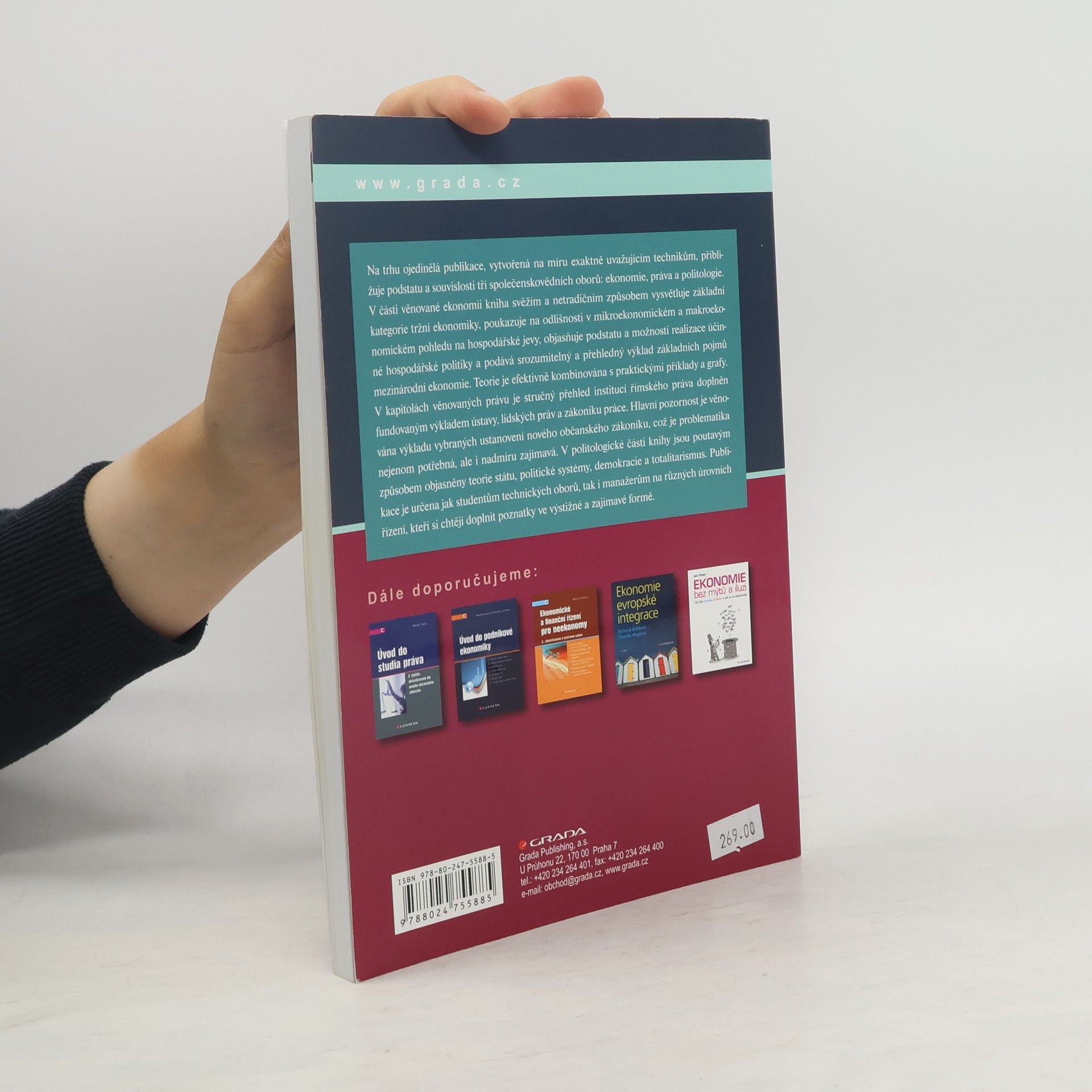 Ekonomie, právo, politologie. Na trhu ojedinělá publikace, vytvořená na míru exaktně uvažujícím technikům, přibližuje podstatu a souvislosti tří společenskovědních oborů: ekonomie, práva a politologie. V části věnované ekonomii kniha svěžím a netradičním způsobem vysvětluje základní kategorie tržní ekonomiky, poukazuje na odlišnosti v mikro a makroekonomickém pohledu na hospodářské jevy, objasňuje podstatu a možnosti realizace účinné hospodářské politiky a podává srozumitelný a přehledný výklad základních pojmů mezinárodní ekonomie. Teorie je efektivně kombinována s praktickými příklady a grafy. V kapitolách věnovaných právu je stručný přehled institucí římského práva doplněn fundovaným výkladem ústavy, lidských práv a zákoníku práce. Hlavní pozornost je věnována výkladu vybraných ustanovení nového občanského zákoníku, což je problematika nejenom potřebná, ale i nadmíru zajímavá. V politologické části knihy jsou poutavým způsobem objasněny teorie státu, politické systémy, demokracie a totalitarismus. Publikace je určena jak studentům technických oborů, tak i manažerům na různých úrovních řízení, kteří si chtějí doplnit poznatky ve výstižné a zajímavé formě.