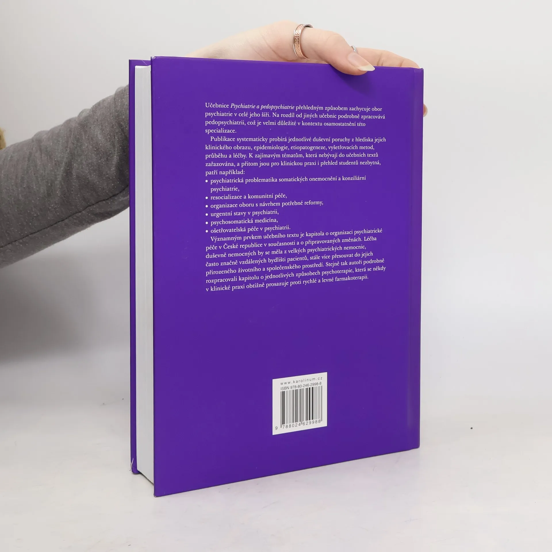 Kniha Psychiatrie a pedopsychiatrie přináší ucelený pohled na problematiku oboru. Zahrnuje podrobně zpracovanou pedopsychiatrii, což je velmi důležité v kontextu osamostatnění této specializace. Publikace zahrnuje obor psychiatrie v celé jeho šíři, postihuje novinky v oboru i výhledy do budoucna a věnuje se také oblastem, které nejsou obvykle v českých učebnicích dostatečně popsané. Mezi témata, která nebývají do učebních textů zařazována, a přitom pro klinickou praxi i přehled studentů jsou nezbytná, patří například: • psychiatrická problematika somatických onemocnění a konziliární psychiatrie, • resocializace a komunitní péče, • organizace oboru s návrhem potřebné reformy, • urgentní stavy v psychiatrii, • psychosomatická medicína, • ošetřovatelská péče v psychiatrii. V učebnici jsou zpracována i témata, která v současnosti prolínají celou medicínou – etické aspekty, suicidalita, otázka menšin. Velký prostor věnují autoři komunikaci s nemocným z mnoha různých aspektů, což je v dnešní převážně technicky orientované době velmi důležité. Široký záběr tak činí tuto publikaci vhodnou nejen pro studenty medicíny, ale také pro lékaře, kteří se hodlají psychiatrii věnovat, případně pro specialisty jiných oborů medicíny.