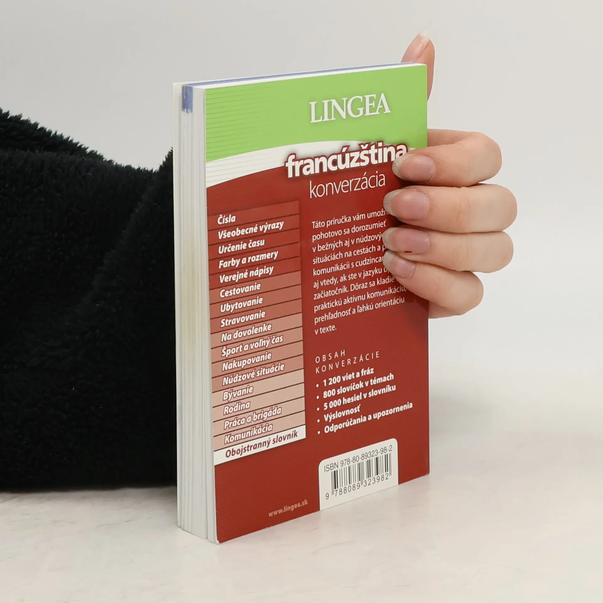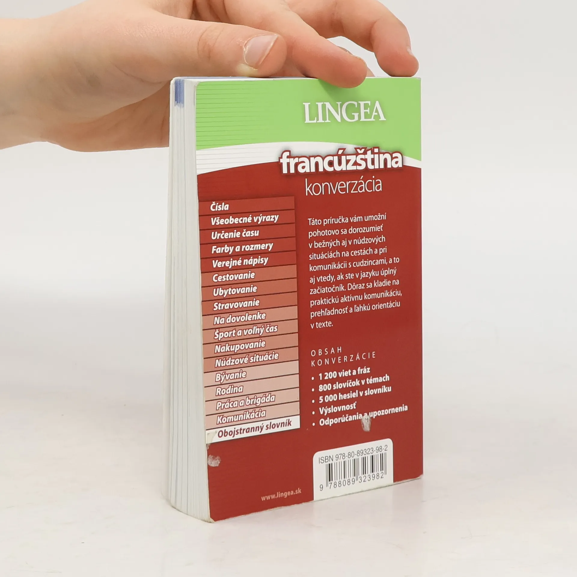 Táto príručka vám umožní pohotovo sa dorozumieť v bežných aj núdzových situáciách na cestách a pri komunikácii s cudzincami, a to aj vtedy, ak ste v jazyku úplný začiatočník. Dôraz sa kladie na praktickú aktívnu komunikáciu, prehľadnosť a ľahkú orientáciu v texte. Obsah konverzácie: 1200 viet a fráz, 800 slovíčok v témach, 5000 hesiel v slovníku, výslovnosť, odporúčania a upozornenia, užitočné prílohy.