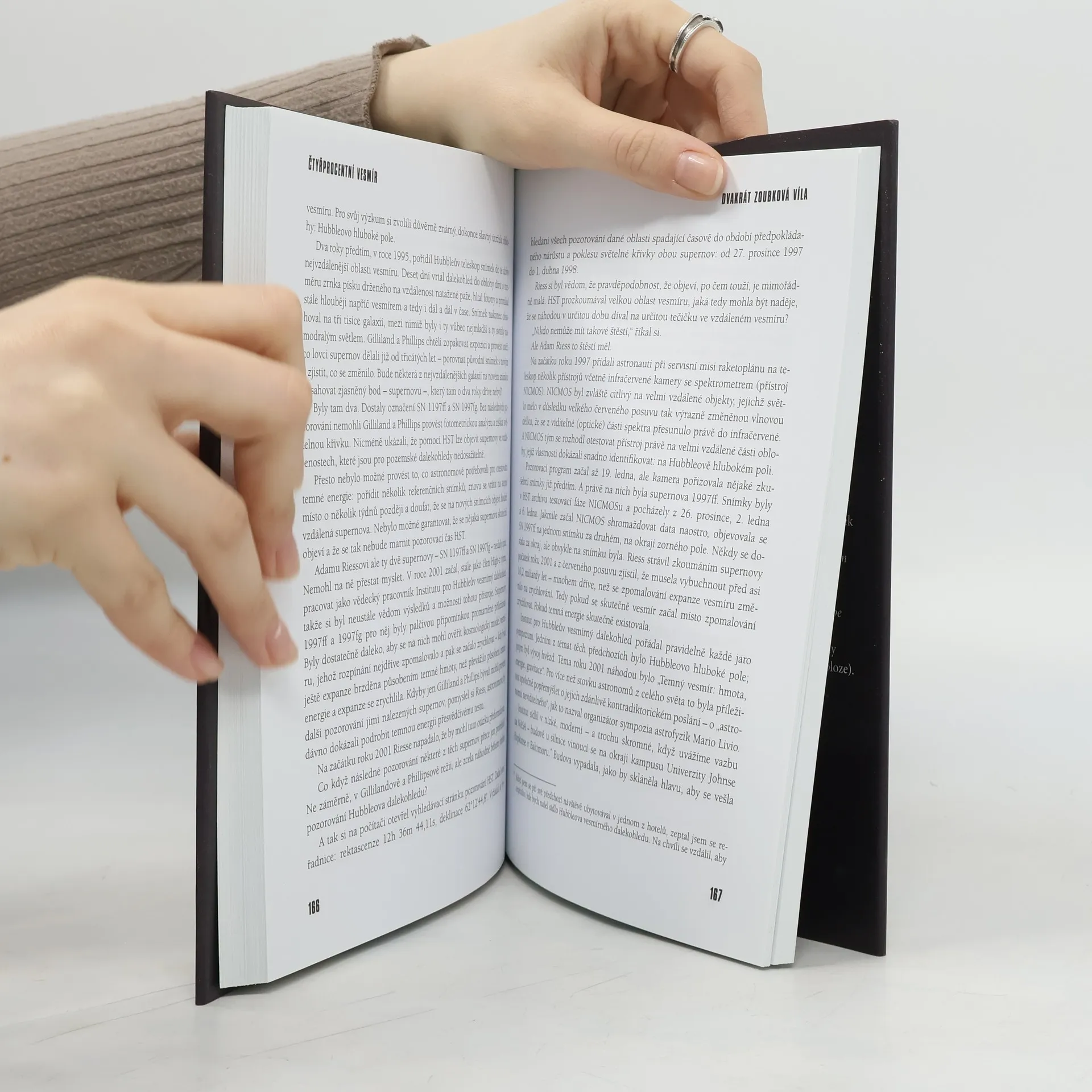 Podtitul: Temná hmota, temná energie a hledání zbytku reality. Vědci se v poslední době snaží vysvětlit jeden mimořádně matoucí rys našeho vesmíru: jen čtyři procenta kosmu jsou tvořena hmotou, ze které se skládáme i my, naše knihy, každá planeta a hvězda. O zbytku nevíme vůbec nic. Richard Panek ve své knize líčí, jak vlastně vědci k tomuto závěru došli. Poutavě, názorně a do detailů vypráví o snaze nalézt „temnou“ hmotu i ještě podivnější substanci zvanou temná energie. „Richard Panek napsal dobrodružný příběh pro moderní dobu, o soudobých výzkumnících, kteří se vydávají do hlubin kosmu, avšak ne v kosmických lodích, ale prostřednictvím teleskopů a družic. A stejně jako ve starých dobrodružných knihách najdeme i tady vizionáře, hrdiny, mecenáše a možná i nějaké ty piráty. Podmanivá kniha.“ – Lee Smolin, autor knih Tři cesty ke kvantové gravitaci a Potíže s fyzikou.