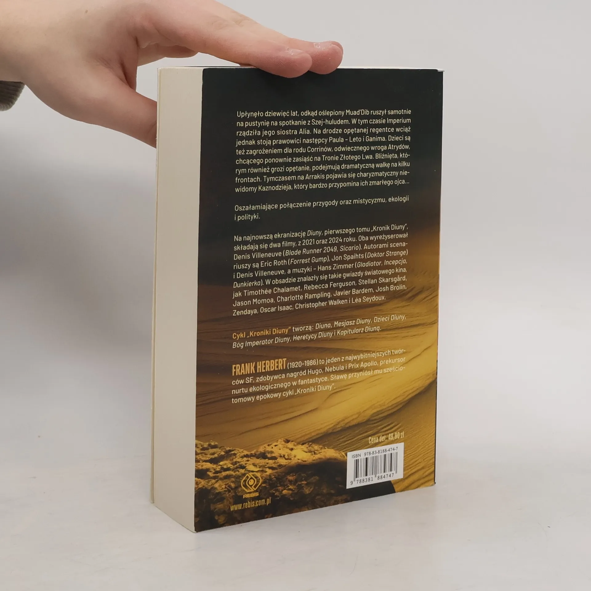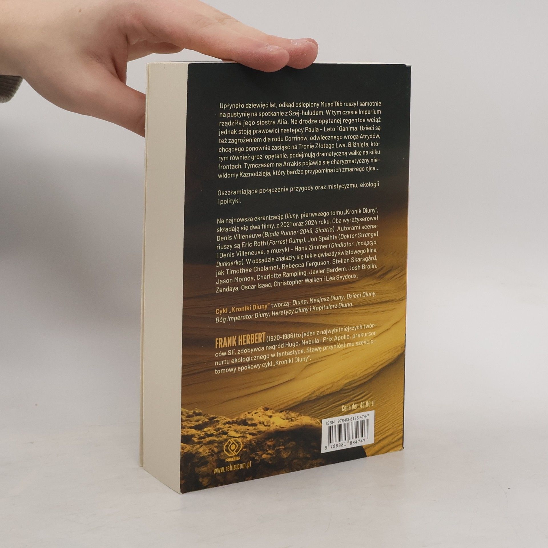 Oszałamiające połączenie przygody oraz mistycyzmu, ekologii i polityki. Upłynęło dziewięć lat, odkąd oślepiony Muad’Dib ruszył samotnie na pustynię na spotkanie z Szej-huludem. W tym czasie Imperium rządziła jego siostra Alia. Na drodze opętanej regentce wciąż jednak stoją prawowici następcy Paula – Leto i Ganima. Dzieci są też zagrożeniem dla rodu Corrinów, odwiecznego wroga Atrydów, chcącego ponownie zasiąść na Tronie Złotego Lwa. Bliźnięta, którym również grozi opętanie, podejmują dramatyczną walkę na kilku frontach. Tymczasem na Arrakis pojawia się charyzmatyczny niewidomy Kaznodzieja, który bardzo przypomina ich zmarłego ojca... Dom Wydawniczy REBIS oddaje czytelnikom nowe, poprawione wydanie cyklu „Kroniki Diuny”, który tworzą: Diuna, Mesjasz Diuny, Dzieci Diuny, Bóg Imperator Diuny, Heretycy Diuny i Kapitularz Diuną. Najnowszą ekranizację Diuny, pierwszego tomu „Kronik Diuny”, wyreżyserował Denis Villeneuve (Blade Runner 2049, Sicario). Autorami scenariusza są Eric Roth (Forrest Gump), Jon Spaihts (Doktor Strange) i Denis Villeneuve, a muzyki – Hans Zimmer (Gladiator, Incepcja, Dunkierka). W obsadzie znalazły się takie gwiazdy światowego kina, jak Timothée Chalamet, Rebecca Ferguson, Stellan Skarsgard, Jason Momoa, Charlotte Rampling, Javier Bardem, Josh Brolin, Zendaya i Oscar Isaac.