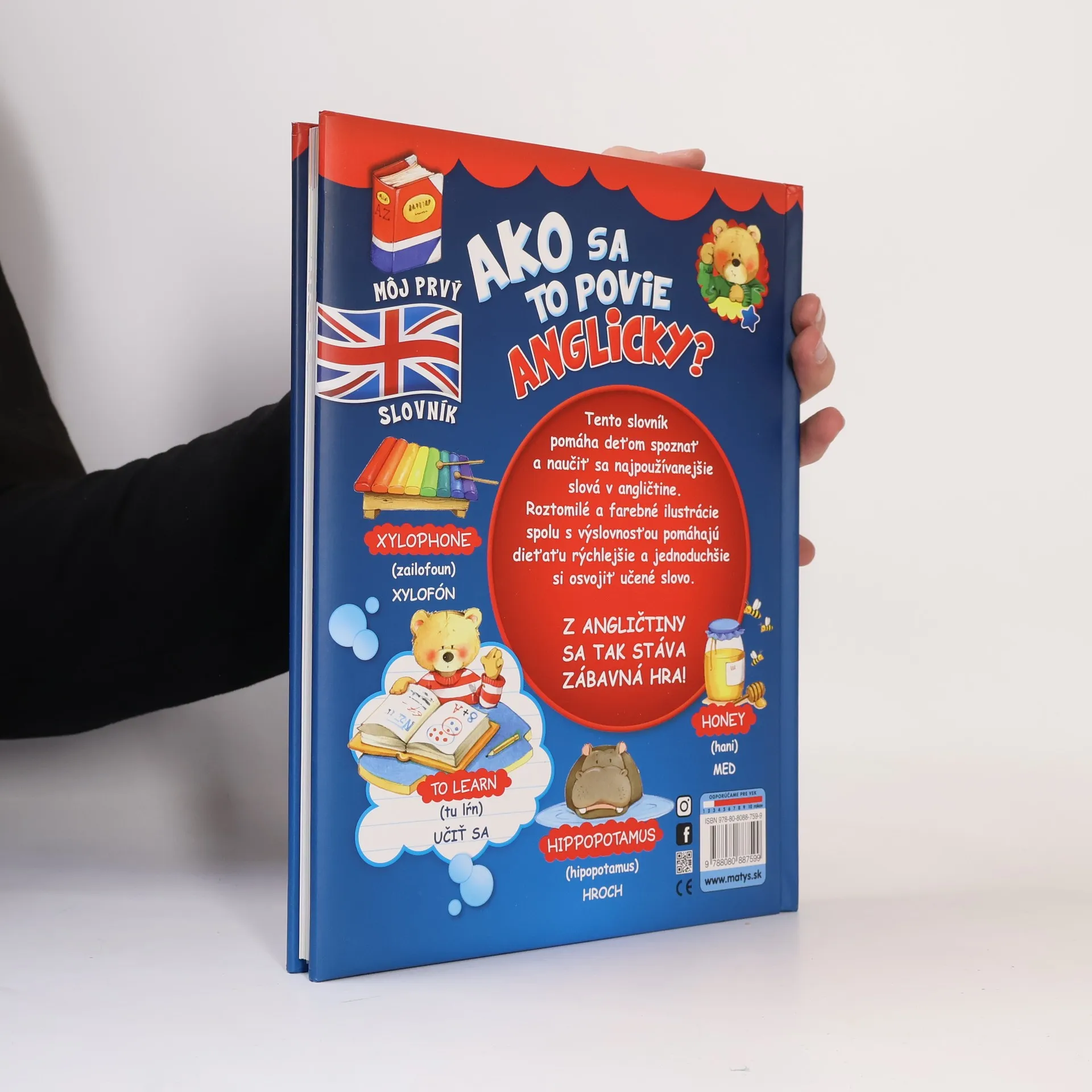 Tento slovník pomáha deťom spoznať a naučiť sa najpoužívanejšie slová v angličtine. Roztomilé a farebné ilustrácie spolu s výslovnosťou pomáhajú dieťaťu rýchlejšie a jednoduchšie si osvojiť učené slovo. Z angličtiny sa tak stáva zábavná hra! Keďže sme učenie angličtiny chceli uľahčiť, výslovnosť anglických slovíčok je zapísaná jednoducho prostredníctvom bežných znakov slovenskej abecedy.