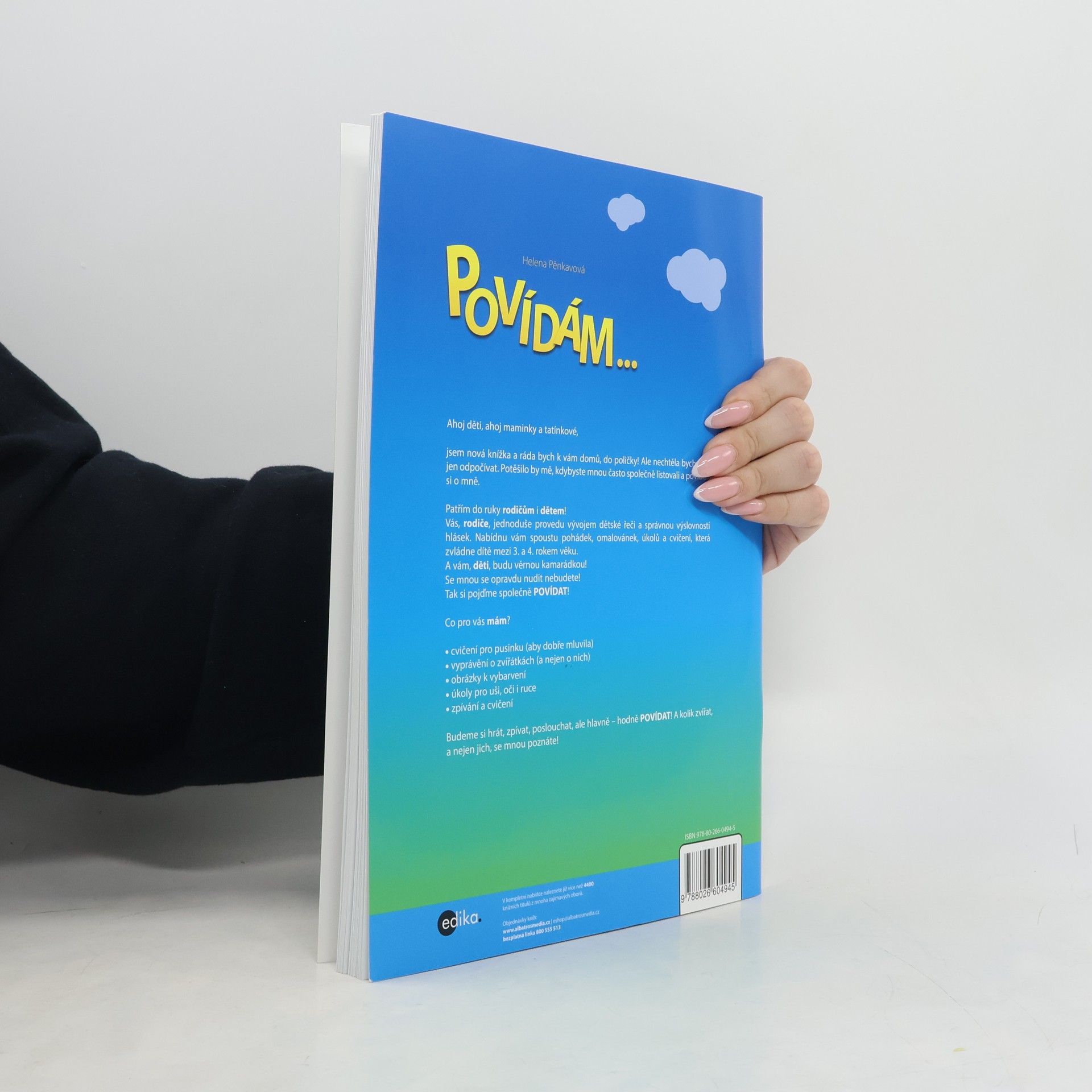 Ahoj děti, ahoj maminky a tatínkové, jsem nová knížka a ráda bych k vám domů, do poličky! Ale nechtěla bych tam jen odpočívat. Potěšilo by mě, kdybyste mnou často společně listovali a povídali si o mně. Patřím do ruky rodičům i dětem! Vás, rodiče, jednoduše provedu vývojem dětské řeči a správnou výslovností hlásek. Nabídnu vám spoustu pohádek, omalovánek, úkolů a cvičení, která zvládne dítě mezi 3. a 4. rokem věku.