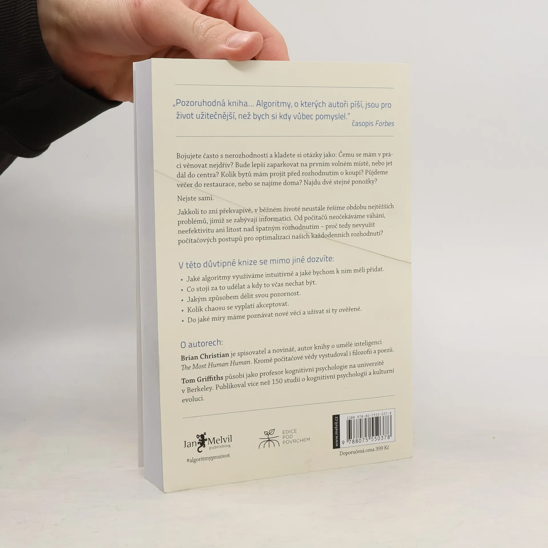 Kniha Algoritmy pro život je strhující pojednání o způsobech využití počítačových algoritmů v každodenním životě. Autoři dokázali proměnit poznatky z oblasti informatiky ve strategie k řešení mnoha problémů v lidském životě — od hledání partnera či partnerky po nalezení parkovacího místa, od řazení obsahu e-mailové schránky po pochopení fungování vlastní paměti. Kniha předkládá řešení rozhodovacích problémů a osvětluje mechanismy lidské mysli. Životy nás všech jsou svázané prostorem a časem, omezeními spjatými s určitou skupinou problémů: Čemu se mám věnovat a na co se naopak vykašlat (dnes, anebo vůbec v životě)? Jak velkou míru chaosu a nepořádku mám ještě přijmout? Jaký poměr mezi novými a oblíbenými činnostmi mě naplňuje nejvíc? Že za vás tato specificky lidská dilemata nemůže vyřešit žádný algoritmus? Omyl! I počítače se potýkají s omezeními a informatici s nimi zápolí již desítky let. Z řešení, která za tu dobu nalezli, se můžeme mnohému přiučit. Uznávaný autor Brian Christian a kognitivní vědec Tom Griffiths v tomto mezioborovém a nečekaném díle ukazují, jak počítačem využívané algoritmy dokážou rozetnout i velice lidské otázky. Vysvětlují, jak zlepšit vlastní intuici a kdy je lepší vše ponechat náhodě, jak se vypořádat s přehršlem možností volby a jak se nejlépe spojit s ostatními.