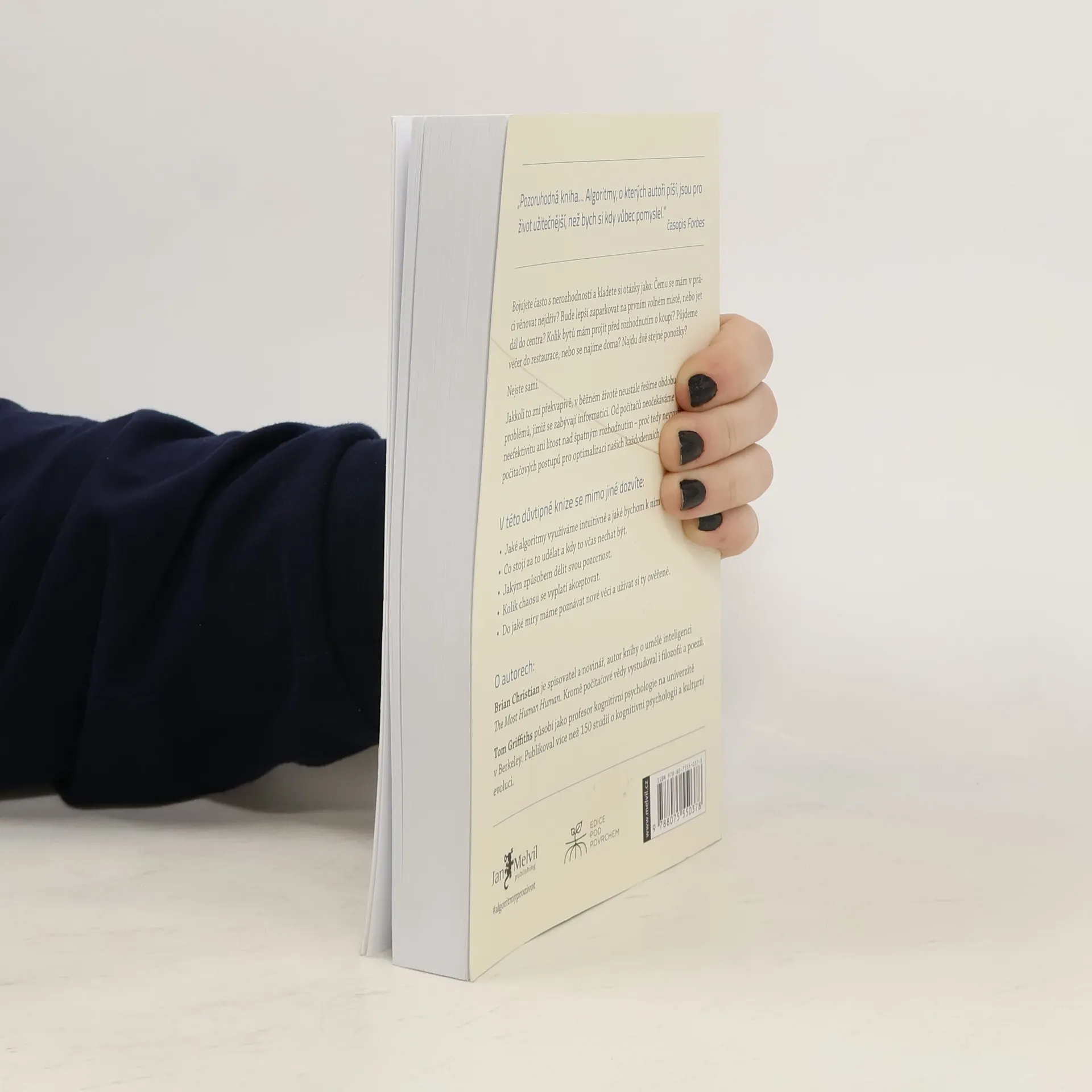 Kniha Algoritmy pro život je strhující pojednání o způsobech využití počítačových algoritmů v každodenním životě. Autoři dokázali proměnit poznatky z oblasti informatiky ve strategie k řešení mnoha problémů v lidském životě — od hledání partnera či partnerky po nalezení parkovacího místa, od řazení obsahu e-mailové schránky po pochopení fungování vlastní paměti. Kniha předkládá řešení rozhodovacích problémů a osvětluje mechanismy lidské mysli. Životy nás všech jsou svázané prostorem a časem, omezeními spjatými s určitou skupinou problémů: Čemu se mám věnovat a na co se naopak vykašlat (dnes, anebo vůbec v životě)? Jak velkou míru chaosu a nepořádku mám ještě přijmout? Jaký poměr mezi novými a oblíbenými činnostmi mě naplňuje nejvíc? Že za vás tato specificky lidská dilemata nemůže vyřešit žádný algoritmus? Omyl! I počítače se potýkají s omezeními a informatici s nimi zápolí již desítky let. Z řešení, která za tu dobu nalezli, se můžeme mnohému přiučit. Uznávaný autor Brian Christian a kognitivní vědec Tom Griffiths v tomto mezioborovém a nečekaném díle ukazují, jak počítačem využívané algoritmy dokážou rozetnout i velice lidské otázky. Vysvětlují, jak zlepšit vlastní intuici a kdy je lepší vše ponechat náhodě, jak se vypořádat s přehršlem možností volby a jak se nejlépe spojit s ostatními.