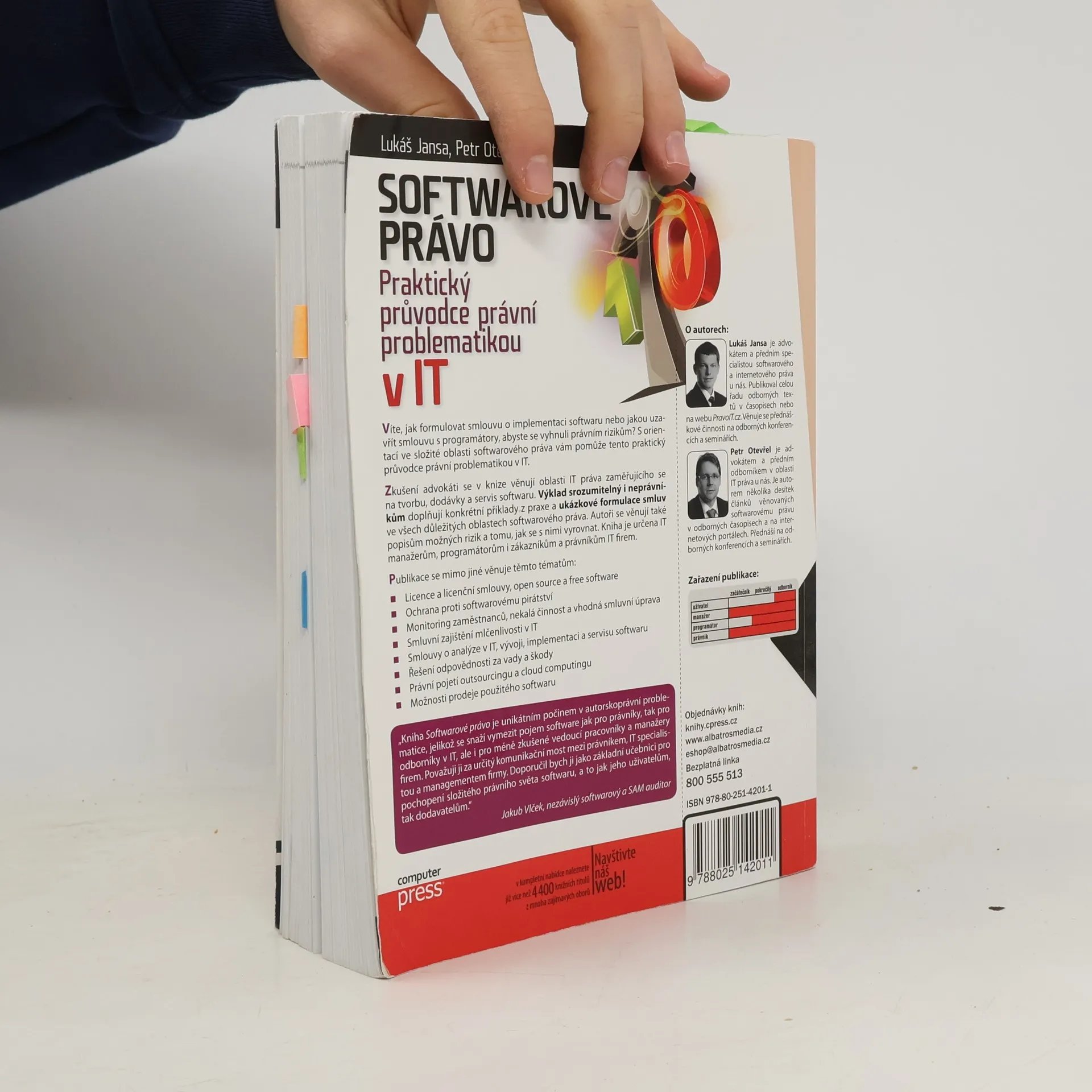 Víte, jak formulovat smlouvu o implementaci softwaru nebo jakou uzavřít smlouvu s programátory, abyste se vyhnuli právním rizikům? Zorientovat se ve složité oblasti softwarového práva vám pomůže tento praktický průvodce právní problematikou v IT. Zkušení advokáti se v knize věnují oblasti IT práva zaměřujícího se na tvorbu, dodávky a servis softwaru. Výklad srozumitelný i neprávníkům doplňují konkrétní příklady z praxe a ukázkové formulace smluv ve všech důležitých oblastech softwarového práva.