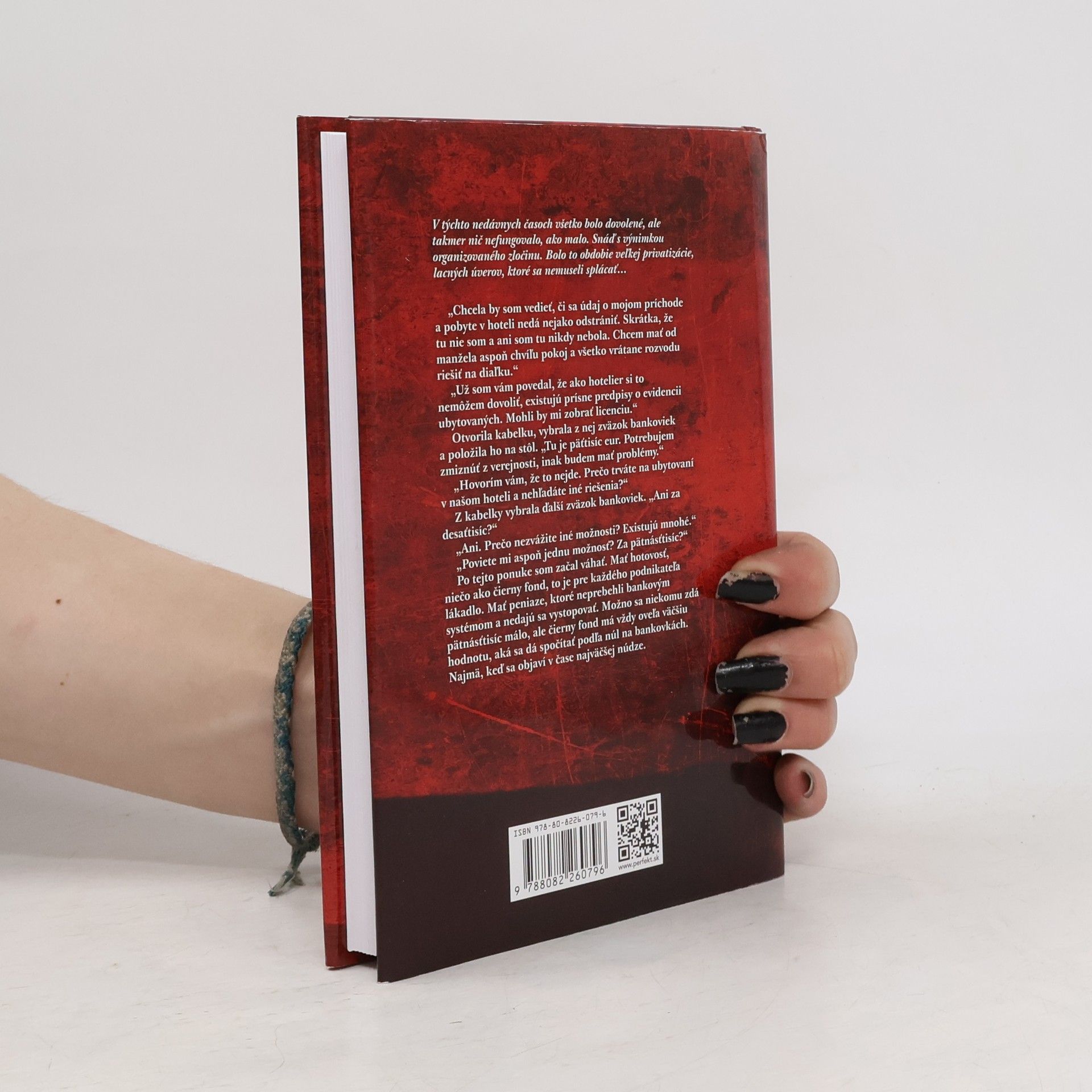 V tých nedávnych časoch všetko bolo dovolené, ale takmer nič nefungovalo, ako malo. Snáď s výnimkou organizovaného zločinu. Bolo to obdobie veľkej privatizácie, lacných úverov, ktoré sa nemuseli splácať... Chcela by som vedieť, či sa údaj o mojom príchode a pobyte v hoteli nedá nejako odstrániť. Skrátka, že tu nie som a ani som tu nikdy nebola. Chcem mať od manžela aspoň chvíľu pokoj a všetko vrátane rozvodu riešiť na diaľku.“ „Už som vám povedal, že ako hotelier si to nemôžem dovoliť, existujú prísne predpisy o evidencii ubytovaných. Mohli by mi zobrať licenciu.“ Otvorila kabelku, vybrala z nej zväzok bankoviek a položila ho na stôl. „Tu je päťtisíc eur. Potrebujem zmiznúť z verejnosti, inak budem mať problémy.“ „Hovorím vám, že to nejde. Prečo trváte na ubytovaní v našom hoteli a nehľadáte iné riešenia?“ Z kabelky vybrala ďalší zväzok bankoviek. „Ani za desaťtisíc?“ „Ani. Prečo nezvážite iné možnosti? Existujú mnohé.“ „Poviete mi aspoň jednu možnosť? Za pätnásťtisíc?“ Po tejto ponuke som začal váhať. Mať hotovosť, niečo ako čierny fond, to je pre každého podnikateľa lákadlo. Mať peniaze, ktoré neprebehli bankovým systémom a nedajú sa vystopovať. Možno sa niekomu zdá pätnásťtisíc málo, ale čierny fond má vždy oveľa väčšiu hodnotu, aká sa dá spočítať podľa núl na bankovkách. Najmä, keď sa objaví v čase najväčšej núdze.