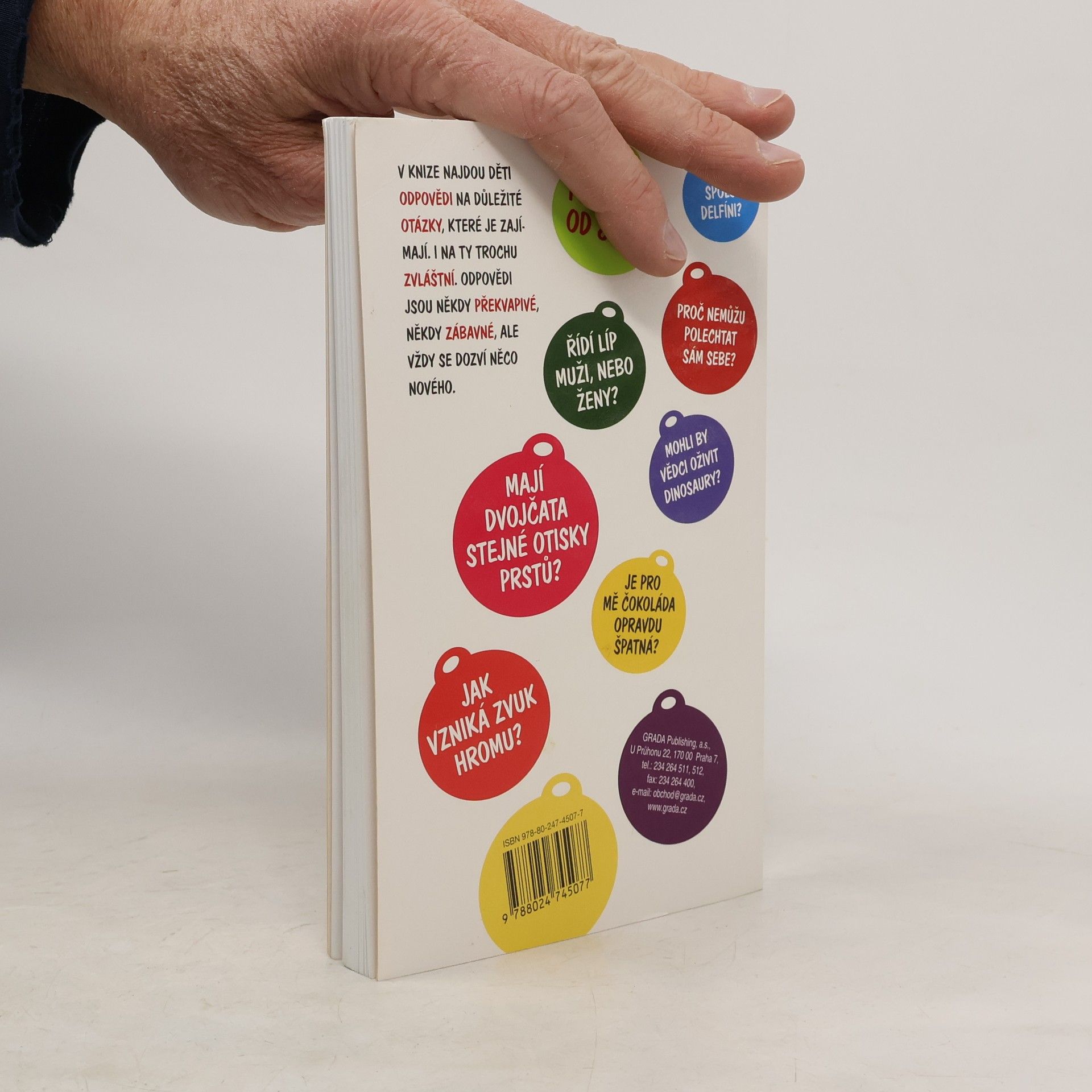 Napadlo vás někdy: "Jak to, že mouchy chodí po stropě?", "Proč nejezdíme na zebrách jako na koních?", "Jak vysoko může vyskočit slon?" a "Je pravděpodobnější, že mě sežere lev, krokodýl nebo žralok?". Tyto fascinující otázky pokládají chytré a zvídavé děti. A v této knize najdou spoustu jednoduše, jasně a pravdivě psaných odpovědí, které je pobaví i poučí. Rozšíří si své obzory a uvidí některé věci v nových souvislostech. A už je nikdy nepřekvapí otázka: "Proč mají veverky huňatý ocásek?"