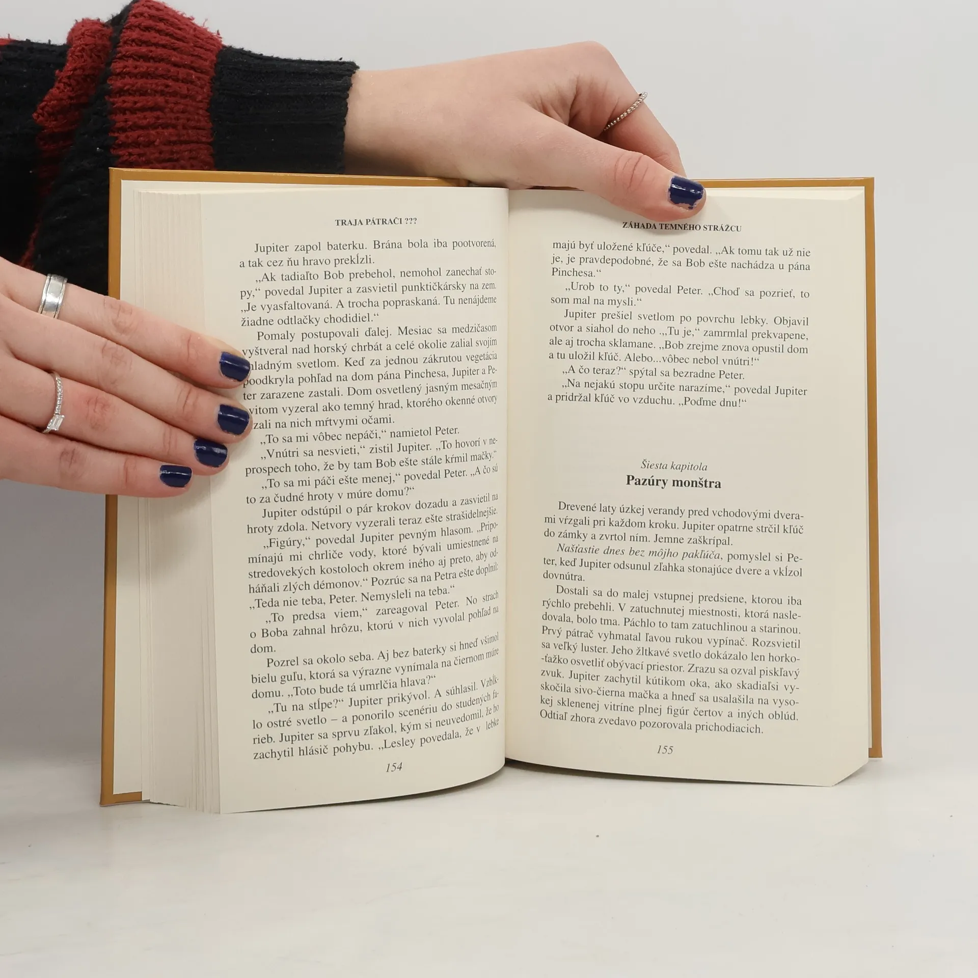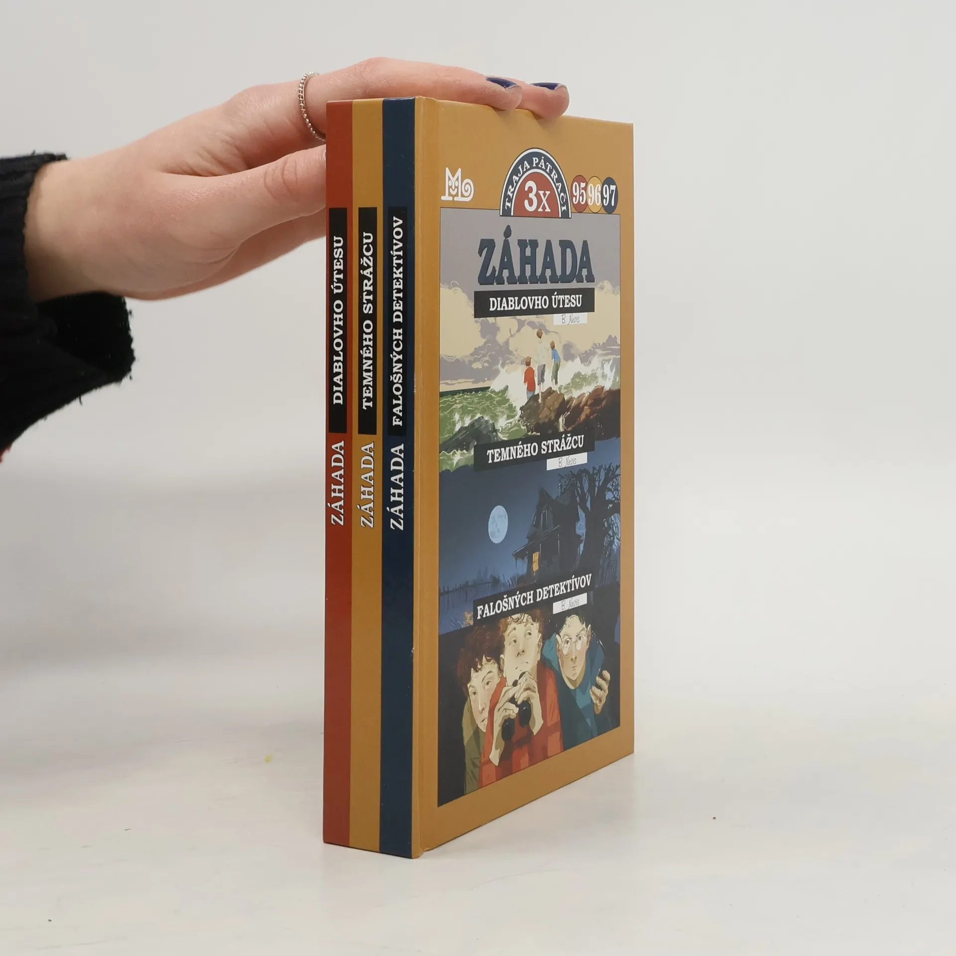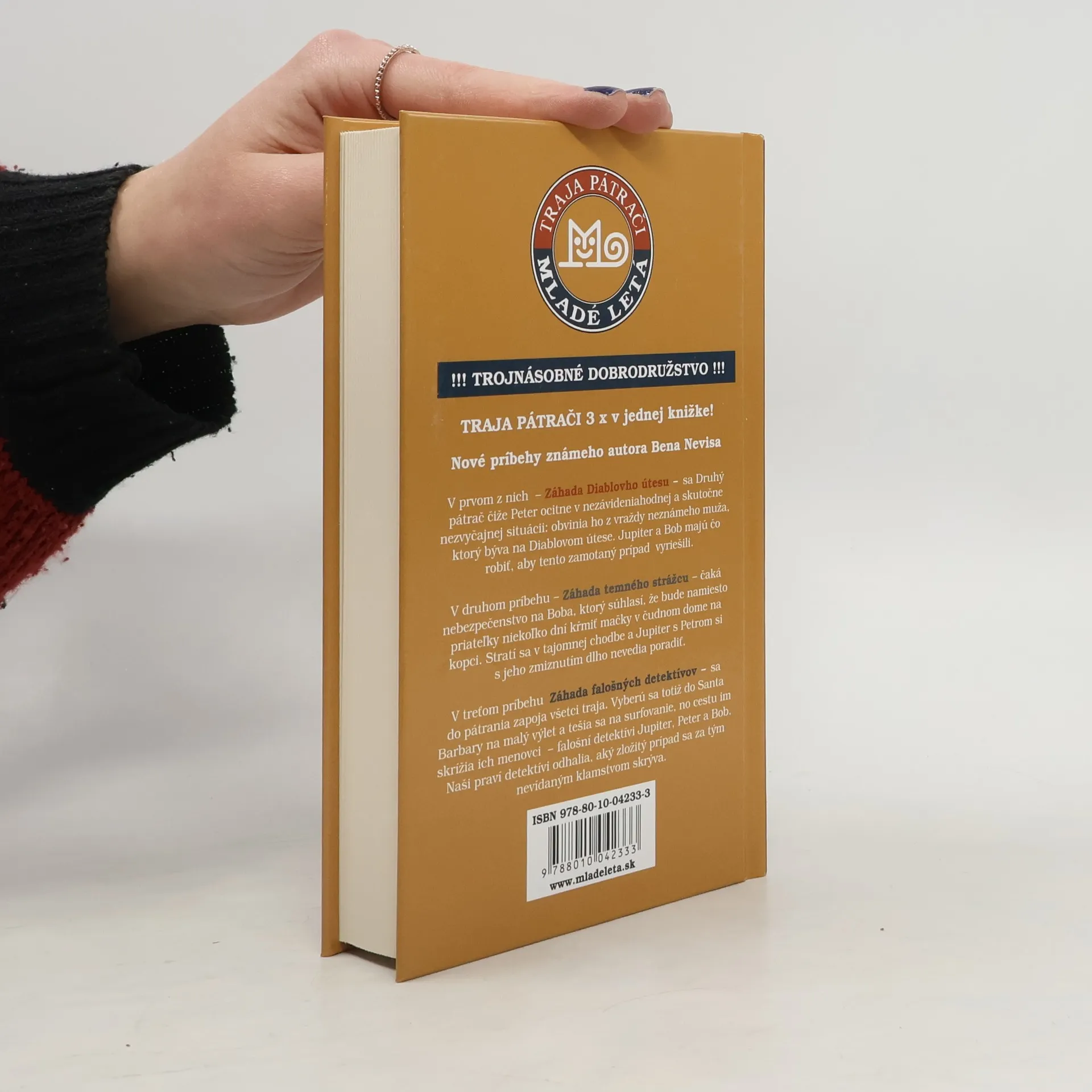 TRAJA PÁTRAČI 3 x v jednej knižke! Nové príbehy známeho autora Bena Nevisa V prvom z nich – Záhada Diablovho útesu – sa Druhý pátrač čiže Peter ocitne v nezávideniahodnej a skutočne nezvyčajnej situácii: obvinia ho z vraždy neznámeho muža, ktorý býva na Diablovom útese. Jupiter a Bob majú čo robiť, aby tento zamotaný prípad vyriešili. V druhom príbehu – Záhada temného strážcu – čaká nebezpečenstvo na Boba, ktorý súhlasí, že bude namiesto priateľky niekoľko dní kŕmiť mačky v čudnom dome na kopci. Stratí sa v tajomnej chodbe a Jupiter s Petrom si s jeho zmiznutím dlho nevedia poradiť. V treťom príbehu – Záhada falošných detektívov – sa do pátrania zapoja všetci traja. Vyberú sa totiž do Santa Barbary na malý výlet a tešia sa na surfovanie, no cestu im skrížia ich menovci – falošní detektívi Jupiter, Peter a Bob. Naši praví detektívi odhalia, aký zložitý prípad sa za tým nevídaným klamstvom skrýva.