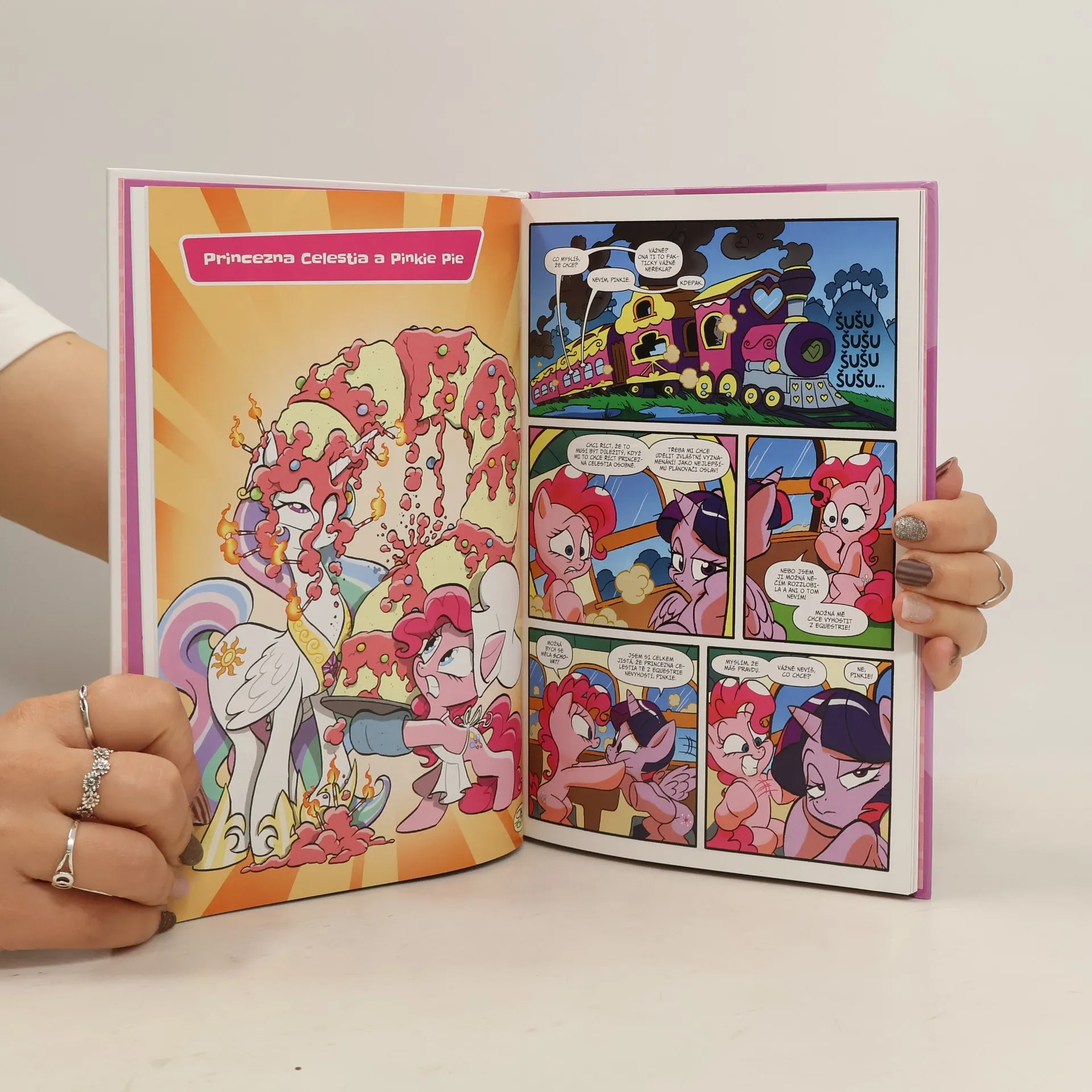 Zbrusu nové příběhy inspirované hitovým televizním seriálem, ve kterém vždy vítězí síla přátelství! S plachou Fluttershy se vydáme na školní sraz, kde dojde k nečekanému klání! Pinkie Pie se pustí do pečení velmi důležitého dortu, Princezna Luna vyřeší zapeklitou detektivní záhadu a Twilight Sparkle se vypraví za řešením svého problému až do cizího mozku. Ne, s těmihle poníky se vážně nudit nebudete!