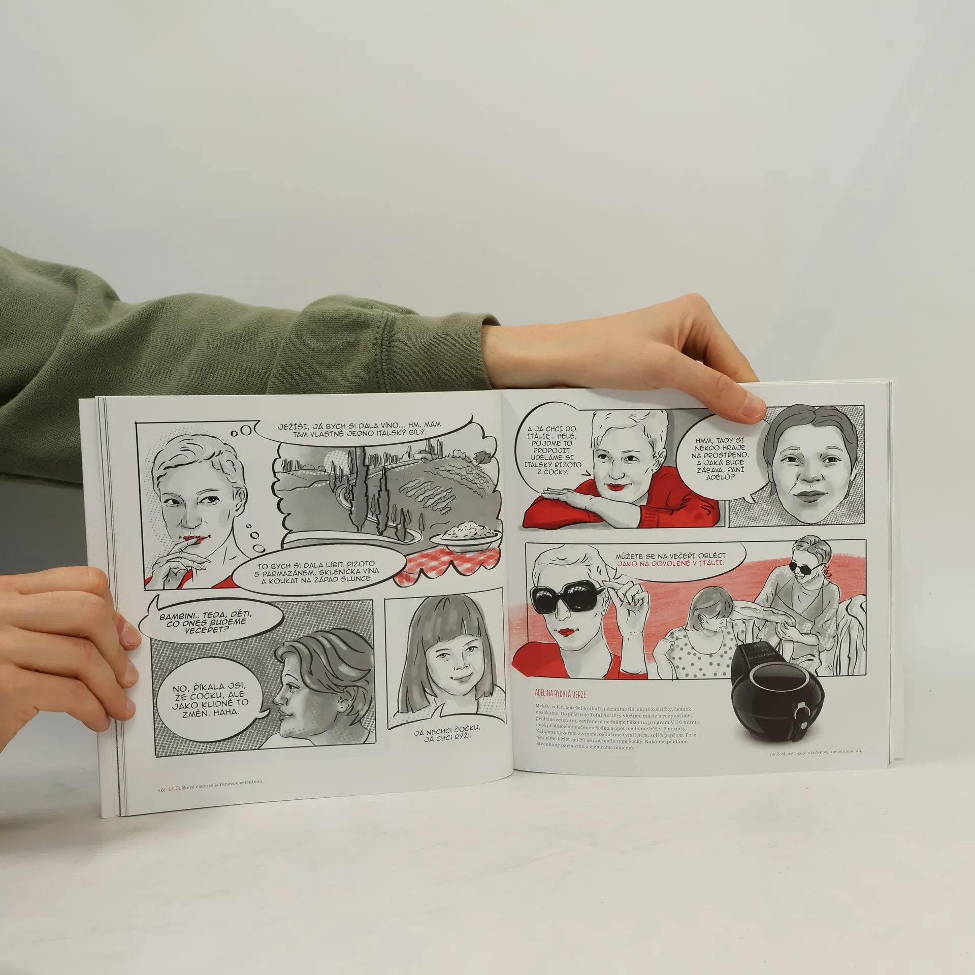 Unikátní kuchařka pro celou rodinu Adéla ještě nevečeřela byla vytvořena pro inspiraci pokročilým kuchařům i začátečníkům. Sáhnete po ní pokaždé, když vám dojdou nápady, co dneska rychle připravit k večeři. Vybírat můžete z 31 receptů oblíbeného šéfkuchaře Ondry Slaniny, které vytvořil speciálně pro komičku Adélu Elbel. On jí radí, jak si u plotny poradit co možná snadno a jednoduše, ona to samozřejmě vtipně glosuje v 31 příbězích pro potěchu všech malých strávníků, které proměnil v komiksovou pochoutku tým studia Artmakers. Kuchařku vybavil dokonalými fotografiemi mistr ve svém oboru Marek Kučera. Kuchařka Adéla ještě nevečeřela se stane vaší oblíbenou coffee table klasikou, budete podle ní vařit, budete si v ní číst, budete si ji prohlížet. Prostě si ji zamilujete!