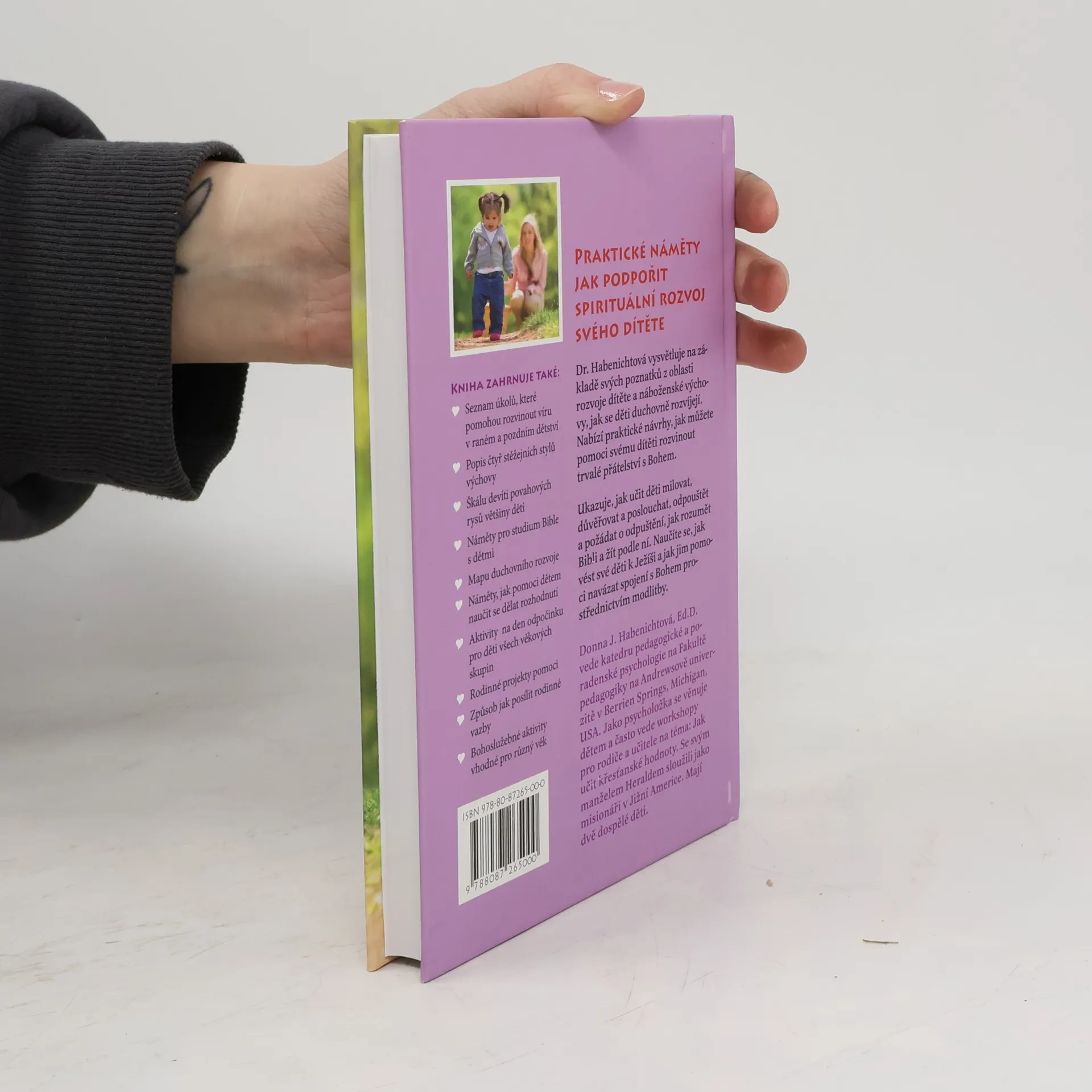 Donna J. Habenichtová Praktické náměty jak podpořit spirituální rozvoj svého dítěte Dr. Habenichtová vysvětluje na základě svých poznatků z oblasti rozvoje dítěte a náboženské výchovy, jak se děti duchovně rozvíjejí.Nabízí praktické návrhy, jak můžete pomoci svému dítěti rozvinout trvalé přátelství s Bohem. Ukazuje, jak učit děti milovat, důvěřovat a poslouchat, odpouštět a požádat o odpuštění, jak rozumět Bibli a žít podle ní. Naučíte se, jak vést své děti k Ježíši a jak jim pomoci navázat spojení s Bohem prostřednictvím modlitby. Donna J. Habenichtová, Ed.D. vede katedru pedagogické a poradenské psychologie na Fakultě pedagogiky na Andrewsově univerzitě v Berrien Springs, Michigan, USA. Jako psycholožka se věnuje dětem a často vede workshopy pro rodiče a učitele na téma: Jak učit křesťanské hodnoty. Se svým manželem Heraldem sloužili jako misionáři v Jižní Americe. Mají dvě dospělé děti. Kniha zahrnuje také: O Seznam úkolů, které pomohou rozvinout víru v raném a pozdním dětství O Popis čtyř stěžejních stylů výchovy O Škálu devíti povahových rysů většiny dětí O Náměty pro studium Bible s dětmi O Mapu duchovního rozvoje O Náměty, jak pomoci dětem naučit se dělat rozhodnutí O Aktivity na den odpočinku pro děti všech věkových skupin O Rodinné projekty pomoci O Způsob jak posílit rodinné vazby O Bohoslužebné aktivity vhodné pro různý věk