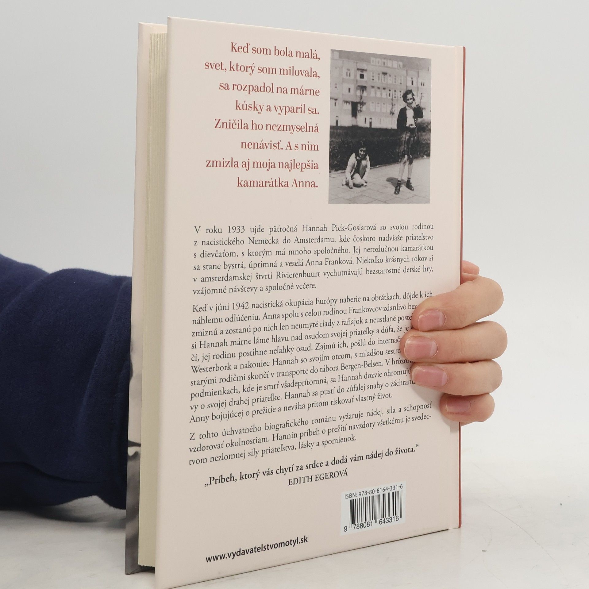 „Keď som bola malá, svet, ktorý som milovala, sa rozpadol na márne kúsky a vyparil sa. Zničila ho nezmyselná nenávisť. A s ním zmizla aj moja najlepšia kamarátka Anna.“ V roku 1933 ujde päťročná Hannah Pick-Goslarová so svojou rodinou z nacistického Nemecka do Amsterdamu, kde sa spriatelí s Annou Frankovou. Ich priateľstvo sa rozvíja v bezstarostných hrách a spoločných večerách v amsterdamskej štvrti Rivierenbuurt. Avšak v júni 1942 ich náhle odlúčenie spôsobí nacistická okupácia. Anna s rodinou zmiznú bez stopy, zatiaľ čo Hannah sa trápi nad osudom svojej priateľky. Následne je jej rodina zajatá a deportovaná do internačného tábora Westerbork, a neskôr do Bergen-Belsenu. V týchto hrôzostrašných podmienkach sa Hannah dozvie znepokojivé správy o Anne. Rozhodne sa riskovať vlastný život, aby sa pokúsila zachrániť svoju slabú priateľku, ktorá bojuje o prežitie. Tento biografický román prenáša silu, nádej a schopnosť vzdorovať ťažkostiam. Hannin príbeh o prežití je svedectvom nezlomnej sily priateľstva, lásky a spomienok.