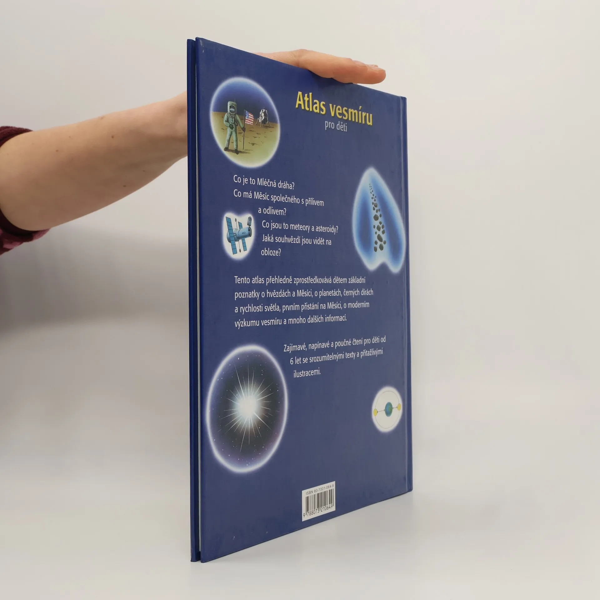 Tento atlas přehledně zprostředkováva dětem základní poznatky o hvězdách a Měsíci, o planetách, černých dírách a rychlosti světla, prvním přistání na Měsíci, o moderním výzkumu vesmíru a mnoho dalších informací.