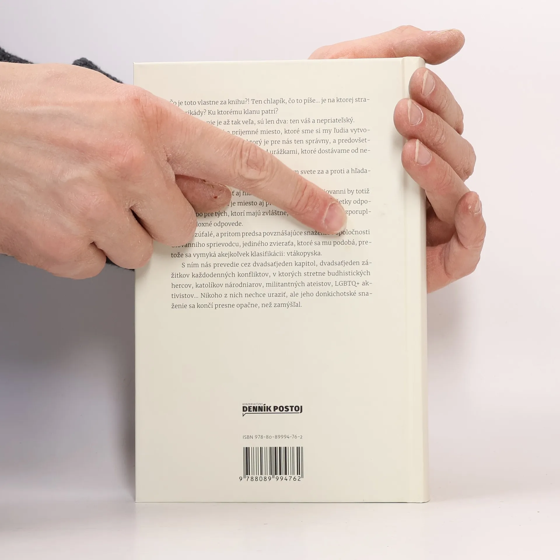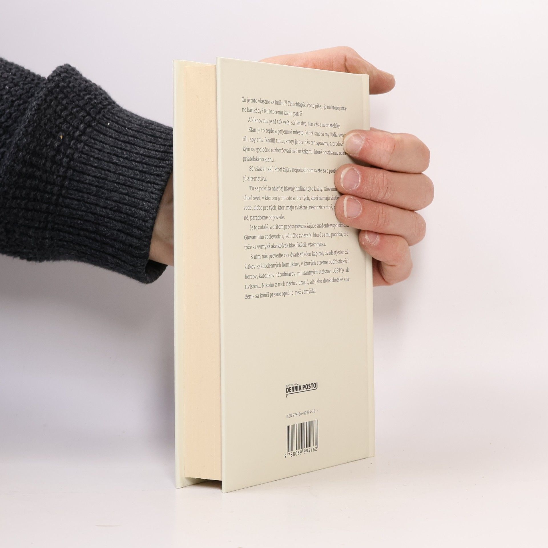 Čo je toto vlastne za knihu?! Autor sa zamýšľa nad otázkami identity a príslušnosti, pričom rozdeľuje svet na dva klany: ten váš a nepriateľský. Klan predstavuje útulné miesto, kde sa ľudia zjednocujú a rozhorčujú nad urážkami od protivníkov. Hlavný hrdina, Giovanni, túži po svete, kde je priestor aj pre tých, ktorí nemajú jasné odpovede alebo majú rozporuplné názory. Jeho snaha je zúfalá, ale aj povzbudzujúca, keď sa spája so svojím sprievodcom, vtákopyskom, ktorý sa vymyká klasifikáciám. Spoločne prechádzajú dvadsiatimi jednou kapitolou, kde sa Giovanni stretáva s rôznymi postavami ako budhistickí herci, katolíci národniari, militantní ateisti a LGBTQ+ aktivisti. Jeho úmysel nie je uraziť, avšak jeho donkichotské snaženie sa končí inak, než zamýšľal. Autor, Giovanni Scifoni, je v Taliansku známy ako herec, režisér a autor divadelných hier, pričom jeho dielo je považované za inovatívne. Zameriava sa na zásadné otázky ľudskej existencie, pričom odpovedá s ľahkosťou a iskrou, ktorá vedie k duchovnému zapáleniu. Okrem divadelných hier napísal aj dve knihy a je ženatý s tromi deťmi.