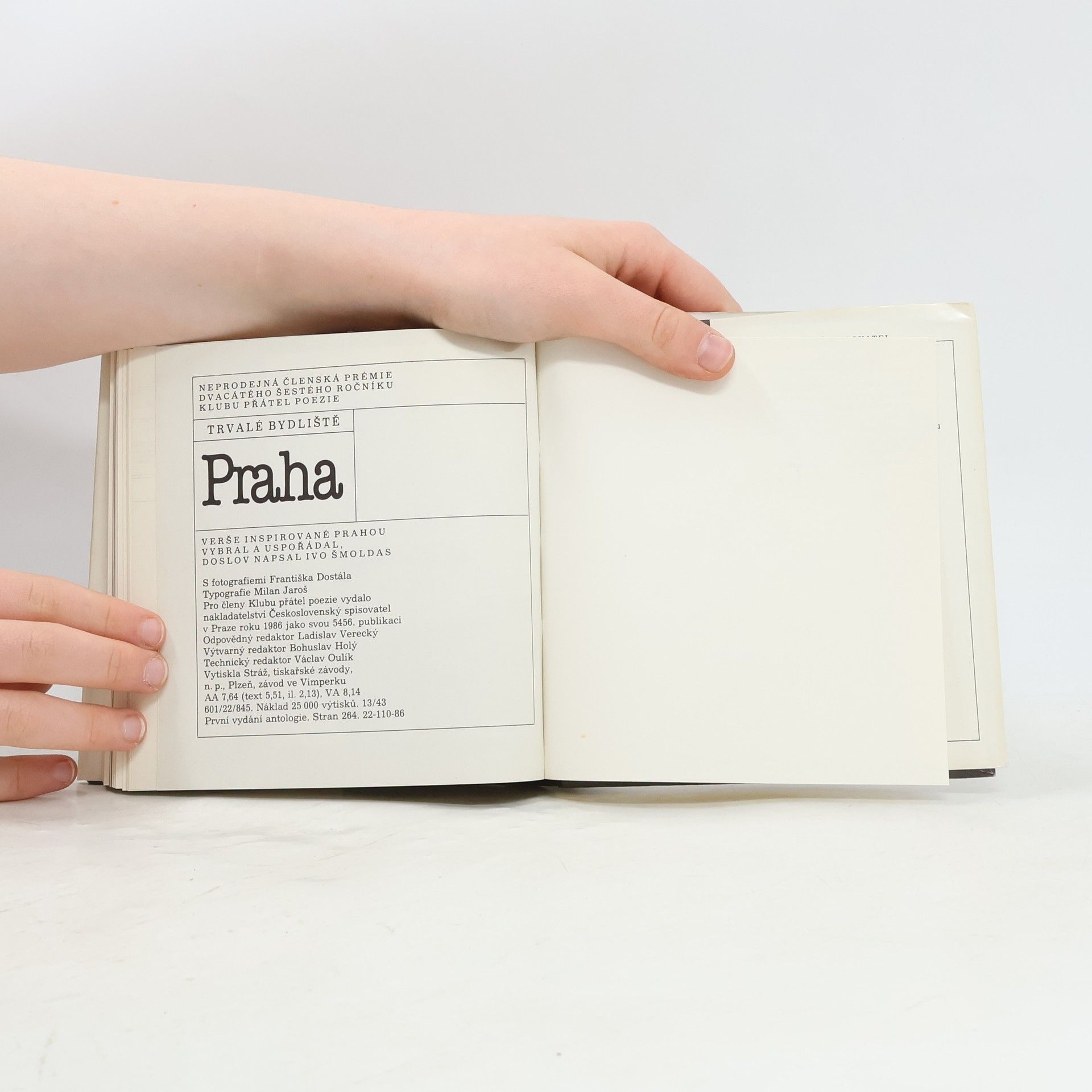 Verše inspirované Prahou vybral a uspořádal, doslov napsal Ivo Šmoldas. S fotografiemi Františka Dostála. Soupis obyvatel: Bernardinová Eva, Branislav František, Bratršovská Zdena, Brožek Lubomír, Cincibuch Petr, Čejka Jaroslav, Florian Miroslav, Halas František, Hanzlík Josef, Holan Vladimír, Hrubín František, Janovic Vladimír, Kainar Josef, Moravcová Jana, Nechvátal František, Neruda Jan, Nezval Vítězslav, Orten Jiří, Pelc Jaromír, Peterka Josef, Pilař Jan, Pohanková Jana, Procházková Markéta, Pujmanová Marie, Rejžek Jan, Rybák Josef, Seifert Jaroslav, Skála Ivan, Skarlant Petr, Sýs Karel, Šimon Josef, Urbánková Jarmila, Vyhlídal Oldřich, Závada Vilém, Žáček Jiří.