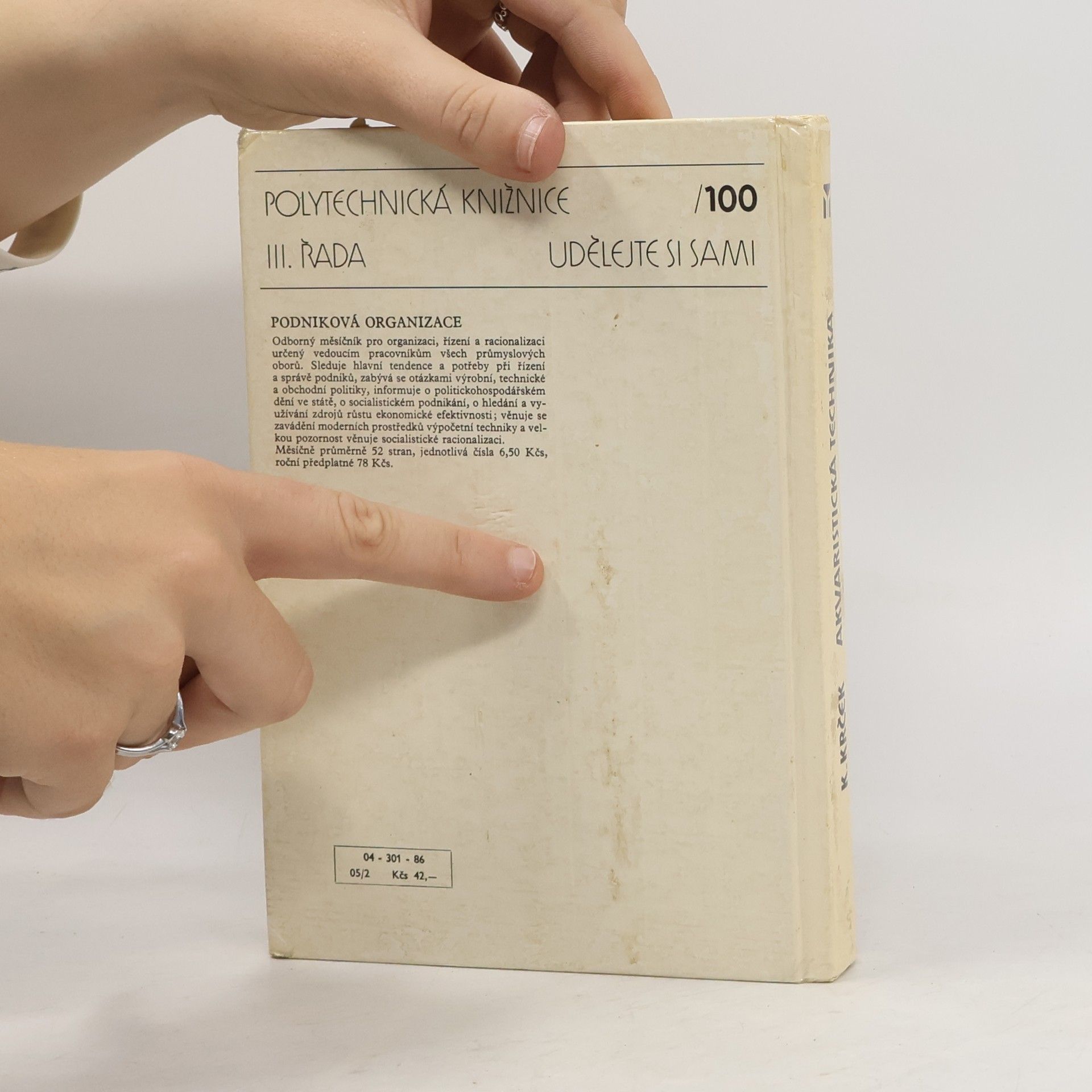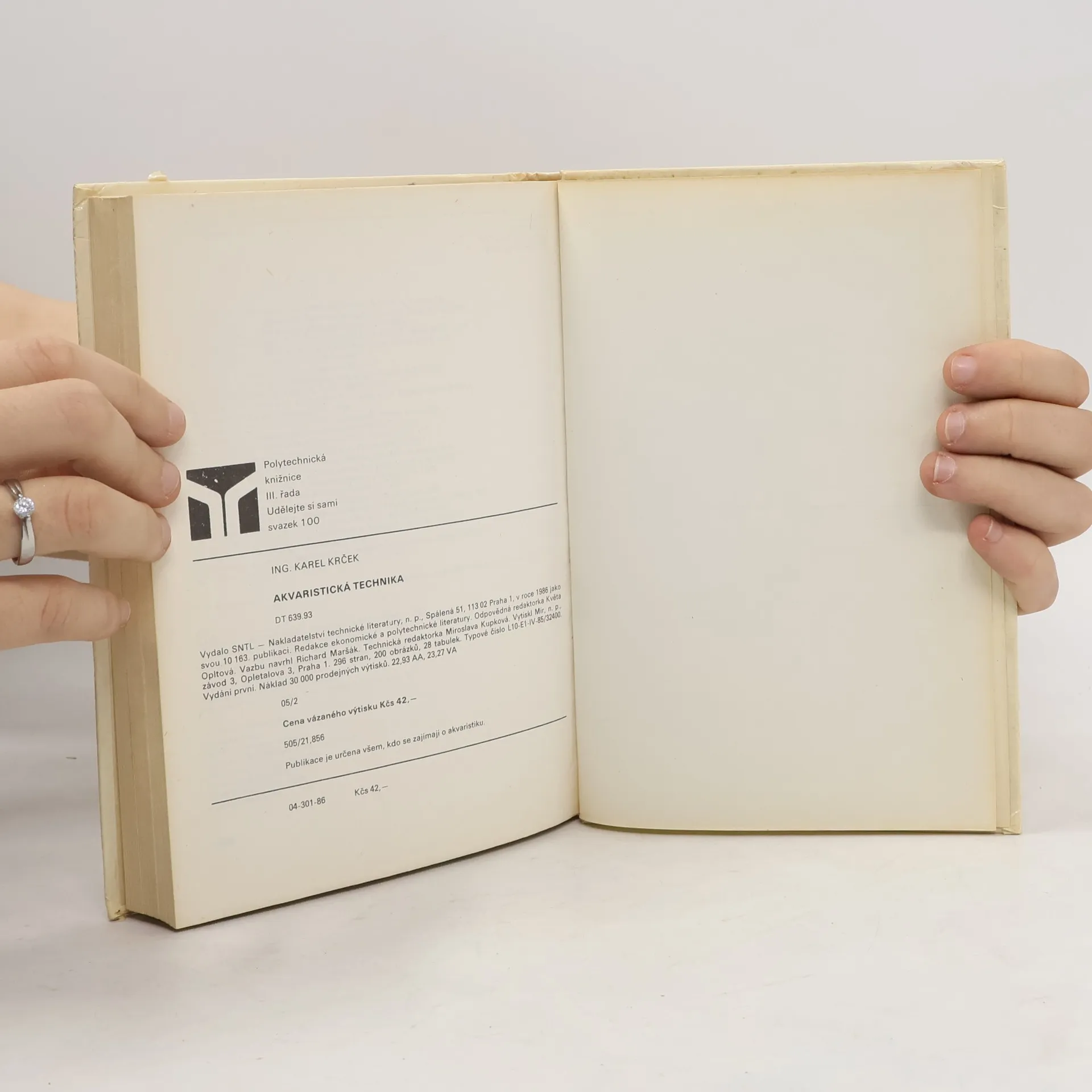 Určeno všem kdo se zajímá o akvaristiku. Kapitoly: Naše dílna, Nádrže a stojany, Voda a "Akvaristická chemie", Filtrace vody v akvaristice, Vodní čerpadla, Technické pomůcky a zařízení použivaná v akvaristice, Máte doma pěstírnu ?, Chov ryb v zahradních bazénech, Fotografování ryb a rostlin v akváriu, Akvaristika ve sběratelství. První vydání. Cena knihy v čase vydání: 42.- Kčs.