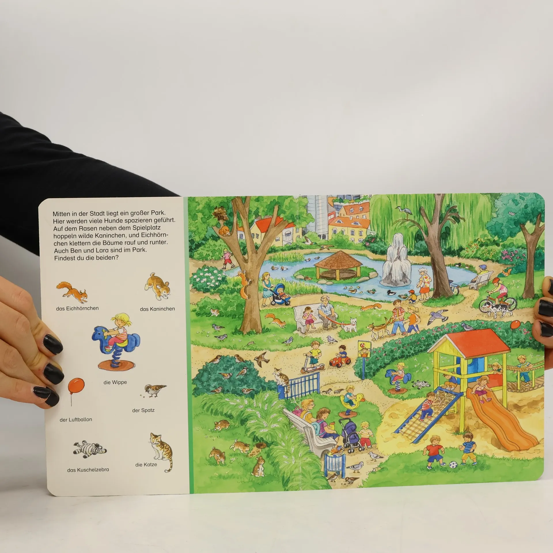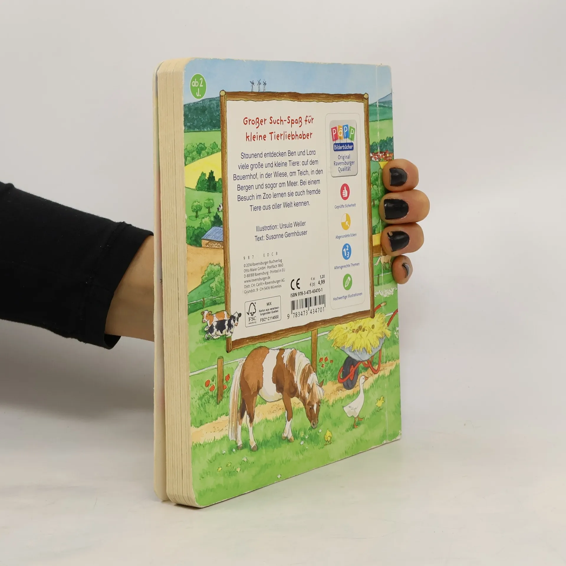 Staunend entdecken Ben und Lara viele heimische Tiere in ihrer Umgebung. Auf dem Bauernhof leben die Kühe, Pferde, Schweine, Hühner und viele andere mehr. In der Wiese kann man zahlreiche Insekten entdecken. Und welche Tiere leben im Wald, in den Bergen und in den Dünen? Zahlreiche Suchbilder helfen beim Benennen der Tiere und laden zum suchen und wiederfinden ein. Ein umfangreiches erstes Tierbilderbuch, das zum ständigen Begleiter für kleine Tierliebhaber wird. Kinder lieben Tiere! Auch wenn sie immer weniger Tiere in ihrem direkten Umfeld erleben, so interessieren sie sich schon sehr früh für ihre Namen und in welcher Umgebung sie leben. Auf 11 realitätsnahen Bildern werden zuerst die Bauernhoftiere, dann die heimischen Vögel und alle Tiere, die am Wasser leben, vorgestellt. Bei einem Blick in die Wiese gibt es allerlei Insekten zu entdecken und beim Besuch im Wald können auch die Rehe und Wildschweine in Ruhe beobachtet werden. Sogar die Tiere, die in den Bergen oder in den Dünen wohnen, bekommen einen Namen. Bei einem Besuch im Zoo gibt es dazu noch die wilden Tiere aus aller Welt zu sehen. Zahlreiche Suchbilder fordern zum genauen Hinsehen auf und laden zum Wiederfinden der kleinen Bilder ein.
