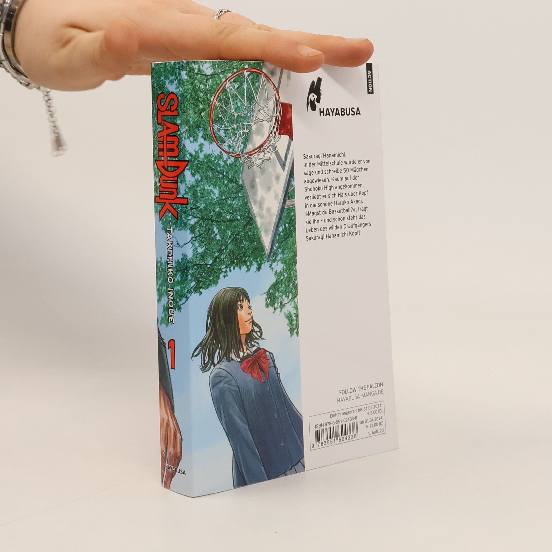 »Was für ein Turnover von HAYABUSA! Gekonnt schaltet der Newcomer direkt in den Fastbreak, dribbelt ein, zwei Gegner mit beeindruckender Eleganz aus, passiert die Drei-Punkte-Linie, tänzelt an einem völlig verdutzten Konkurrenten vorbei, schraubt sich mit einem gewaltigen Sprung in die Luft uuund… SLAM DUNK! HAYABUSA holt den wichtigsten Titel des Jahres nach Deutschland, und alle rasten aus! « Gewinnen ist zwar nicht alles im Basketball, aber wer will schon Zweiter werden? Man braucht Hingabe und Disziplin, um zu den Besten zu gehören und genau das will das Basketballteam der Shohoku High! Hanamichi Sakuragi hat derweil kein Glück bei den Mädchen – überhaupt kein Glück! Da hilft es auch nicht, dass er dafür bekannt ist, immer wieder in Schlägereien zu geraten, aus denen er ausnahmslos als Sieger hervorgeht. Eines Tages trifft er Haruko, das Mädchen seiner Träume. Um Haruko zu beeindrucken, beginnt Hanamichi mit dem Basketball, der sein ganzes Leben verändern soll…